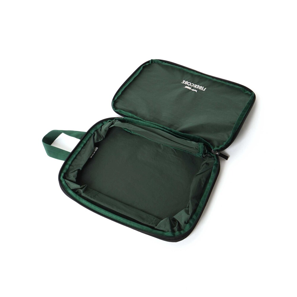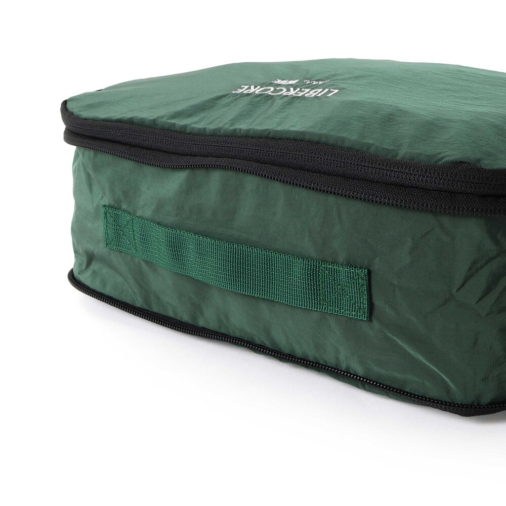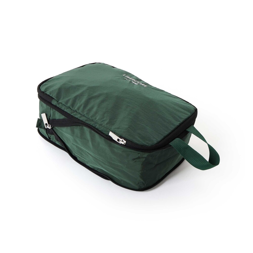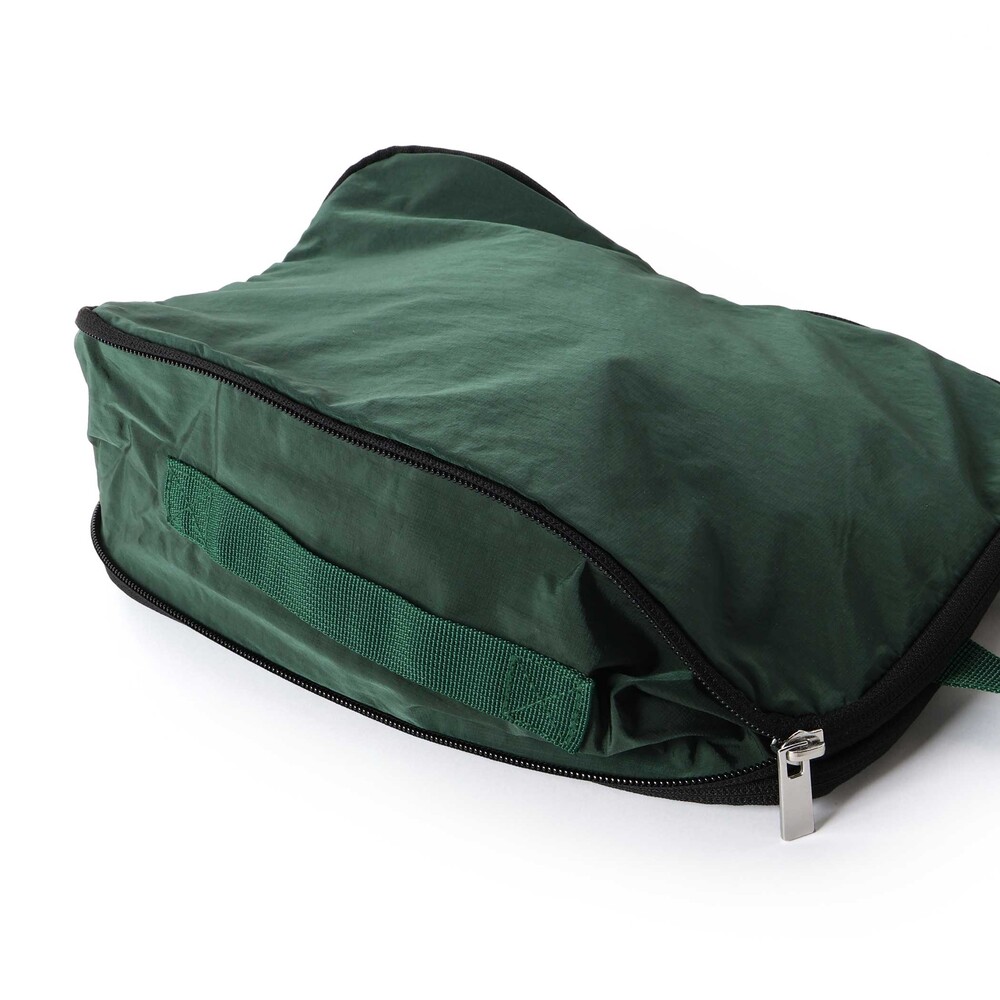 ロゴ刺しゅう入りのポーチはマチに圧縮用ファスナー付きで、たくさんの服をぎゅっとまとめられる旅行や収納に便利なアイテム。