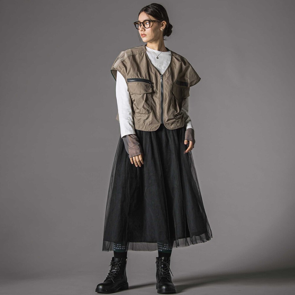 ベストはフラップ付き立体ポケットやファスナー部分などの配色がさりげないアクセントに。