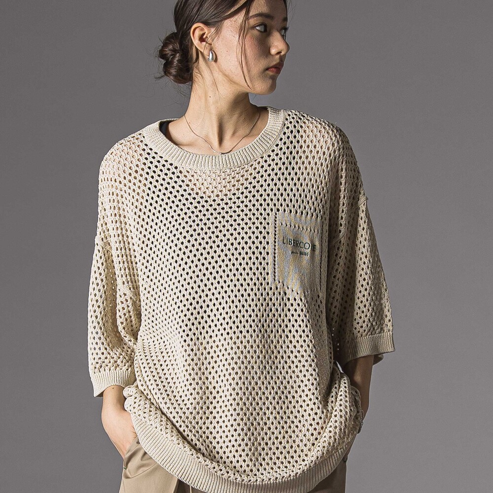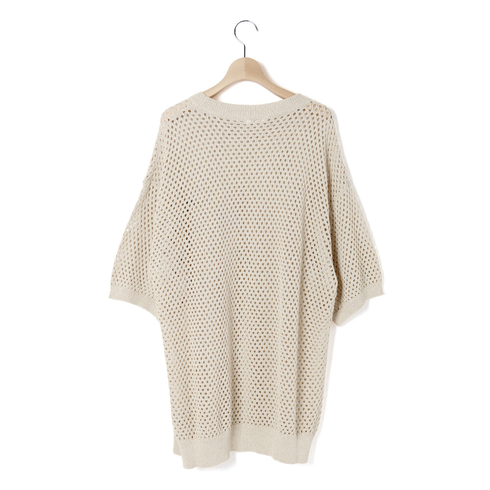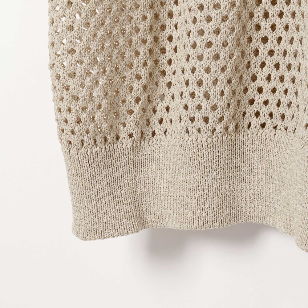 柔らかくしなやかな素材感と透け感のあるざっくりとした編み地が特徴で、インナーとのレイヤードを楽しめるデザインです。