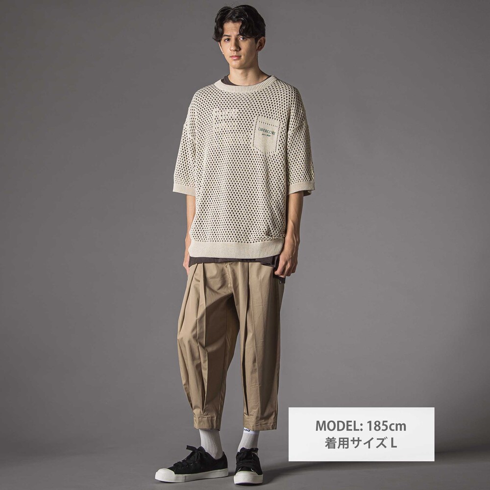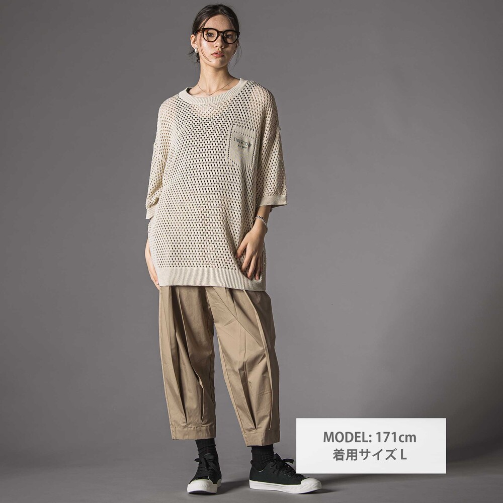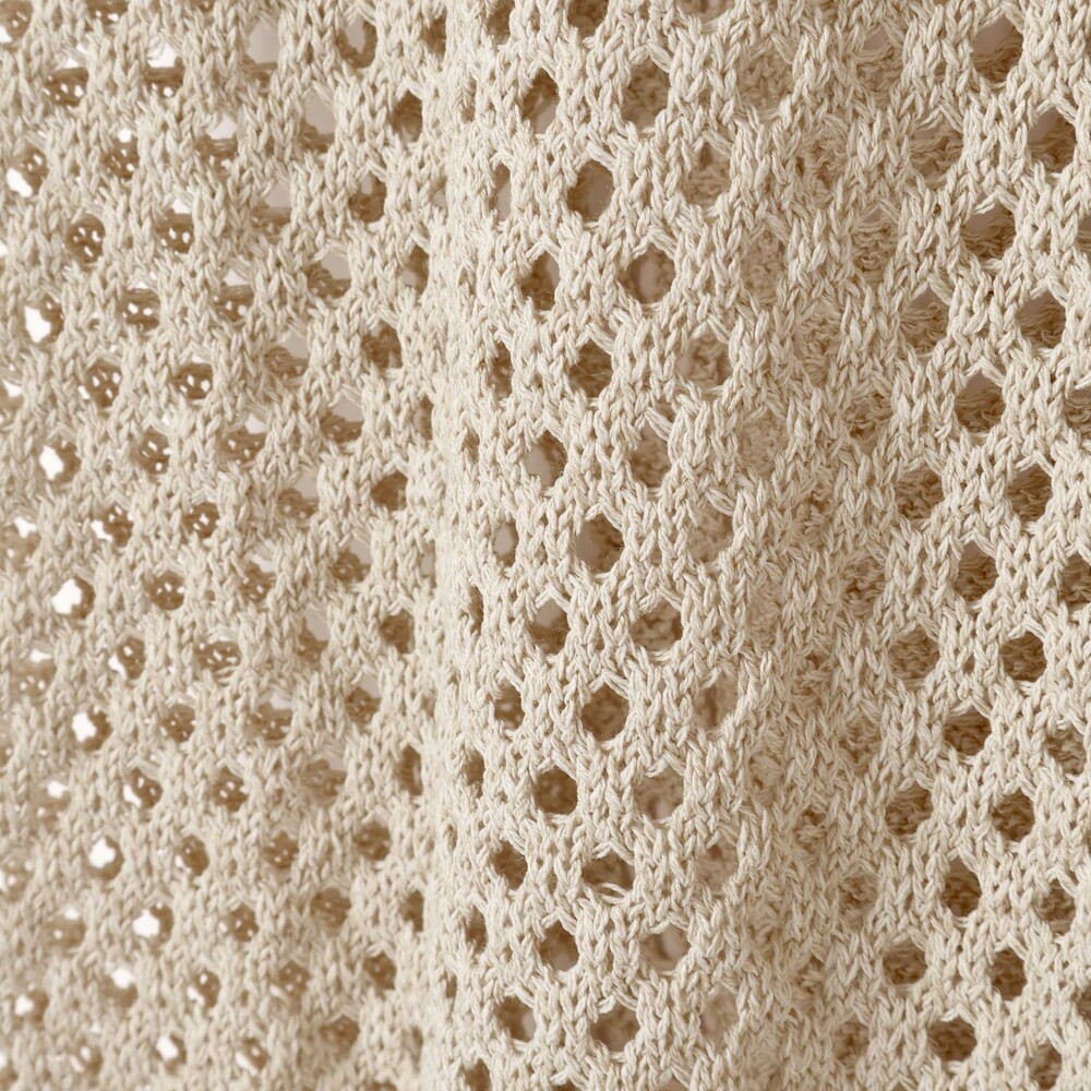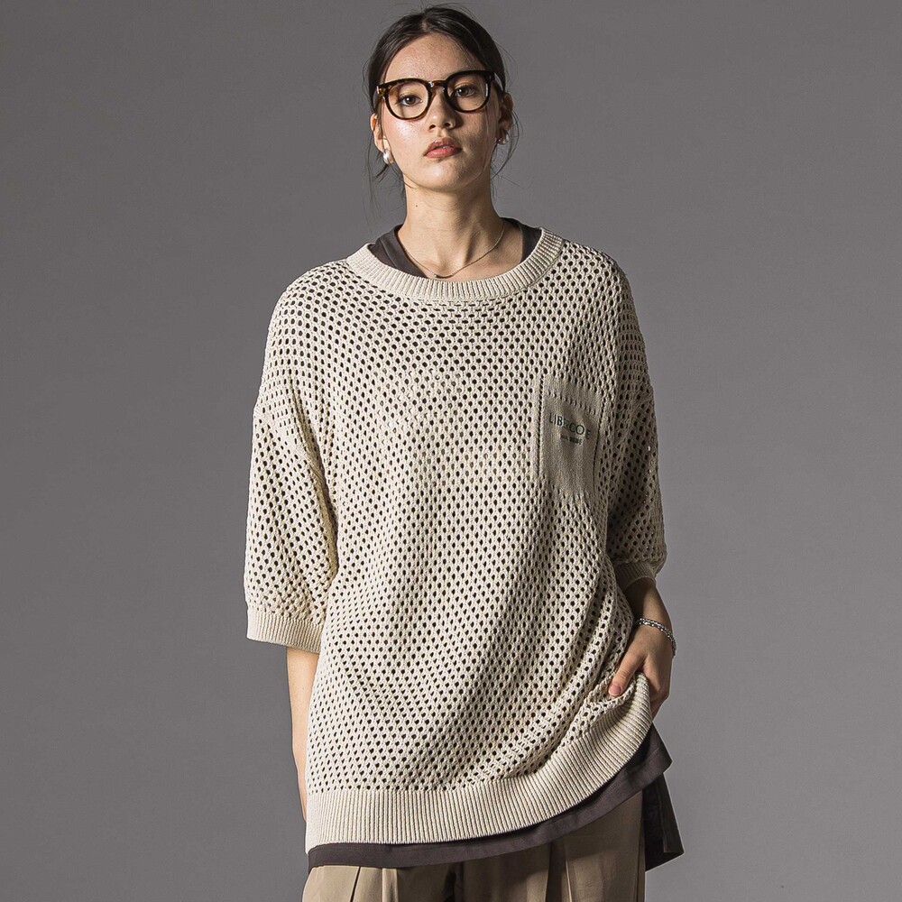 柔らかくしなやかな素材感と透け感のあるざっくりとした編み地が特徴で、インナーとのレイヤードを楽しめるデザインです。
