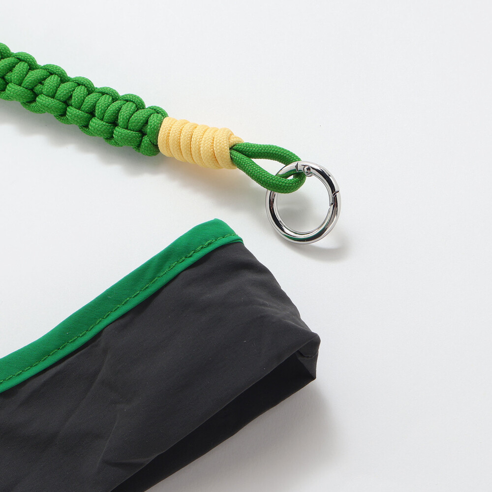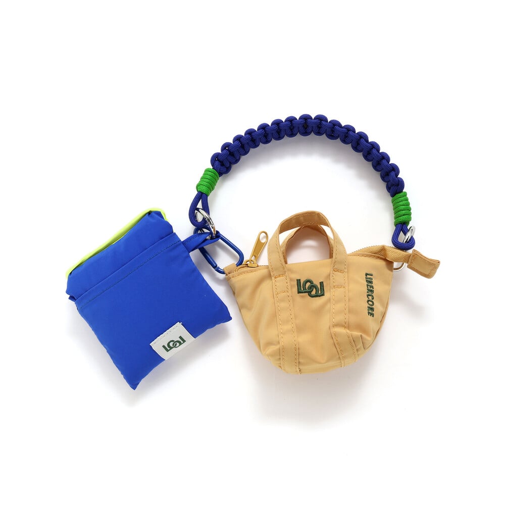 ミニバッグは、パラコード付きのカラビナとDカンで簡単に着脱でき、ロゴ刺しゅうがさりげないアクセントになっています。