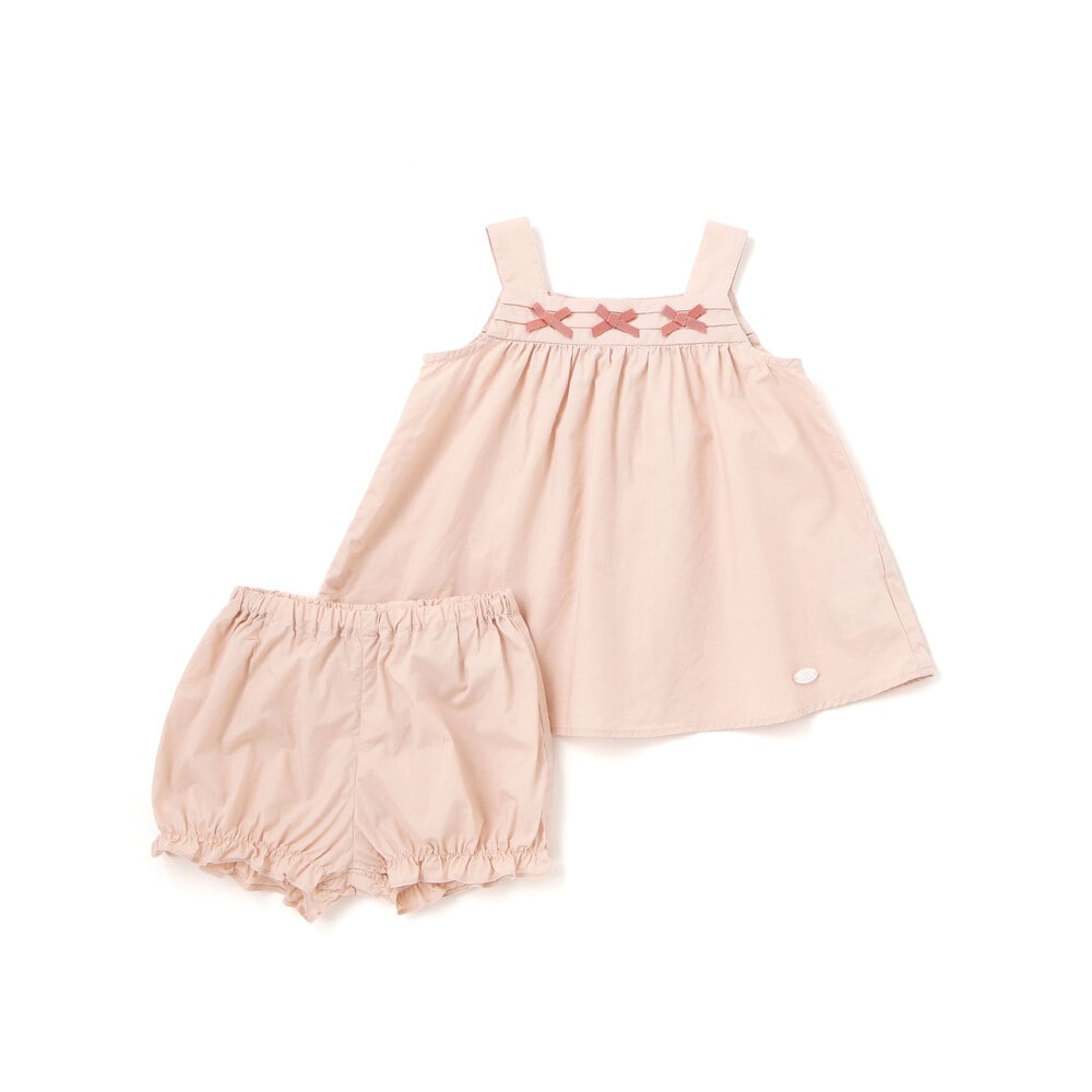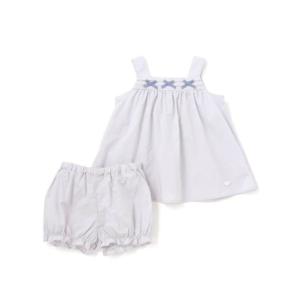 ハリのあるタイプライター生地にピンタックでギャザーを寄せて広がりのあるシルエットと3つのリボンが特徴のワンピースとブルマのセットです。
