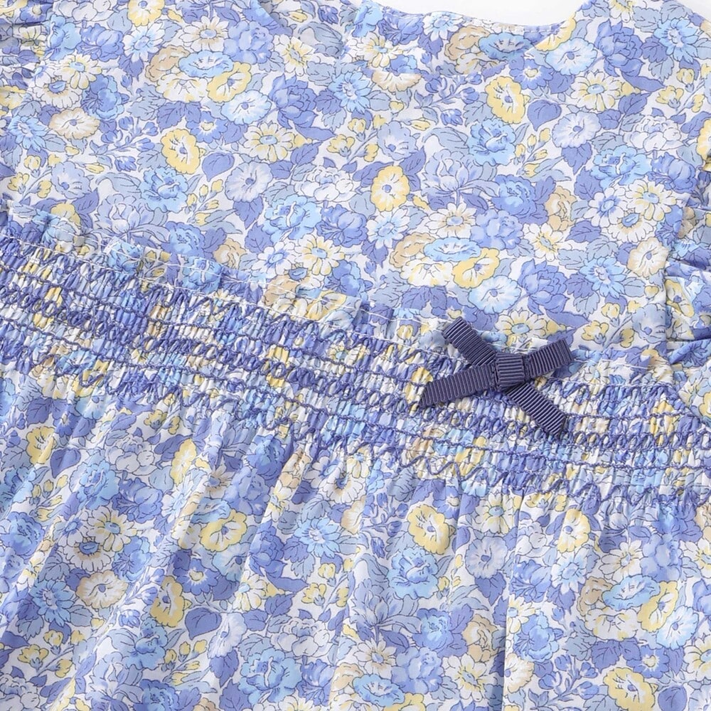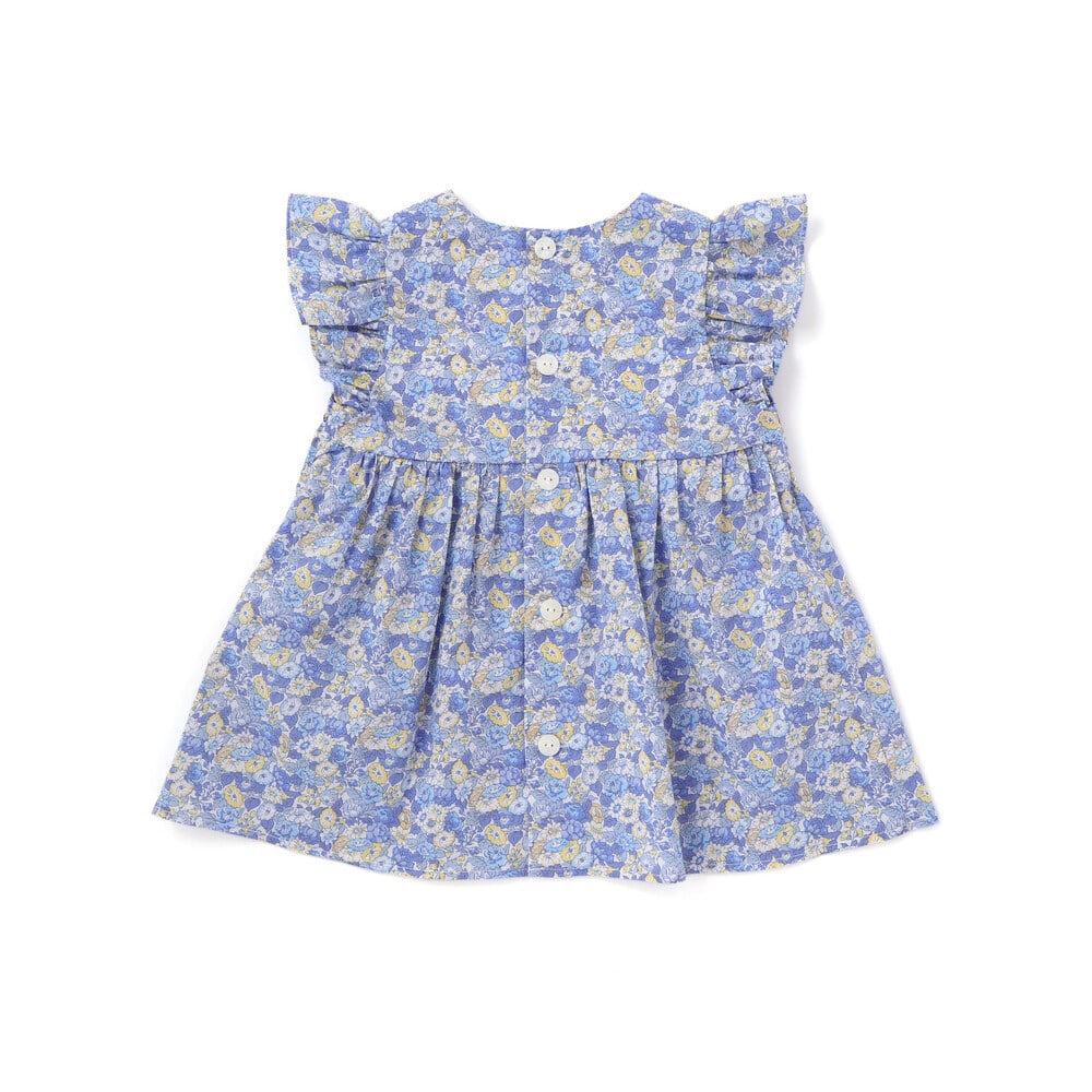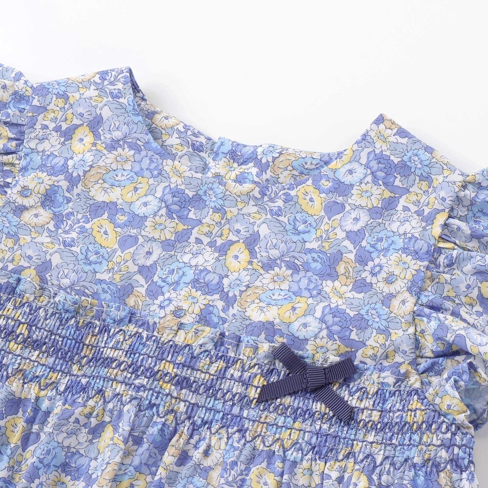 スモッキング刺しゅうの上にちょこんと添えられたリボンやフリル袖が可愛らしさを引き立て、リバティを代表するタナローン生地の滑らかな質感が高級感を漂わせます。