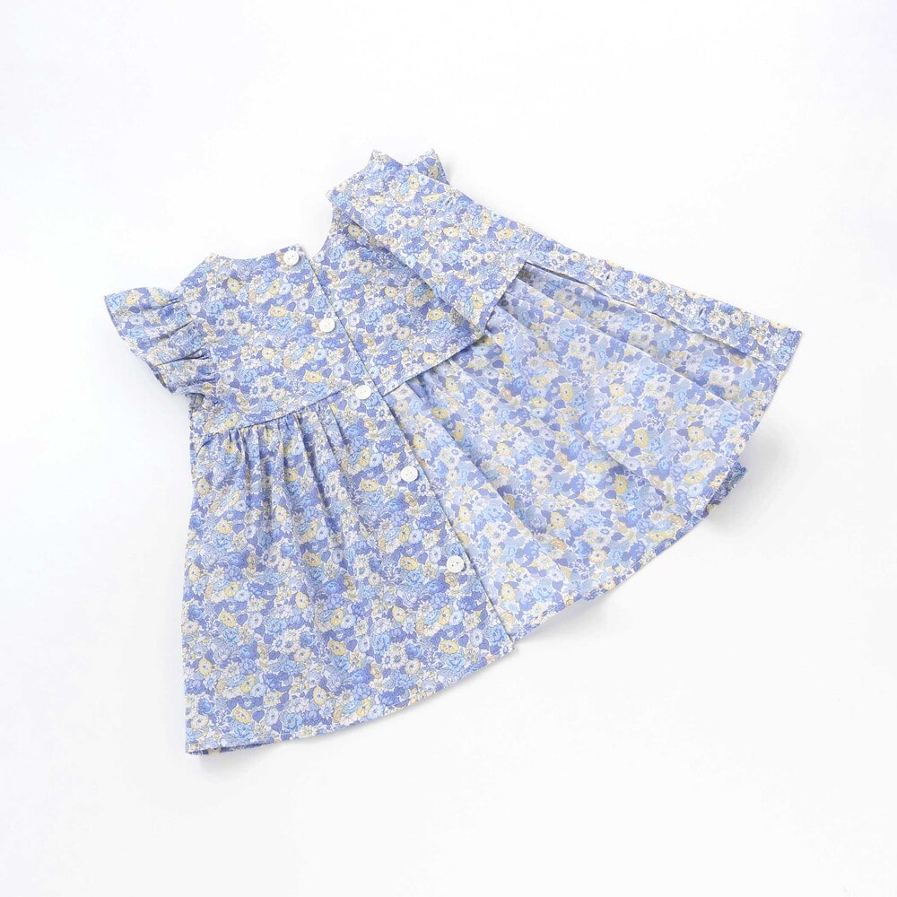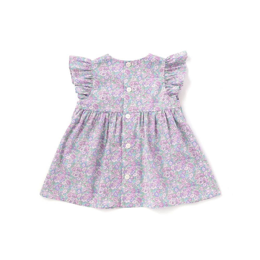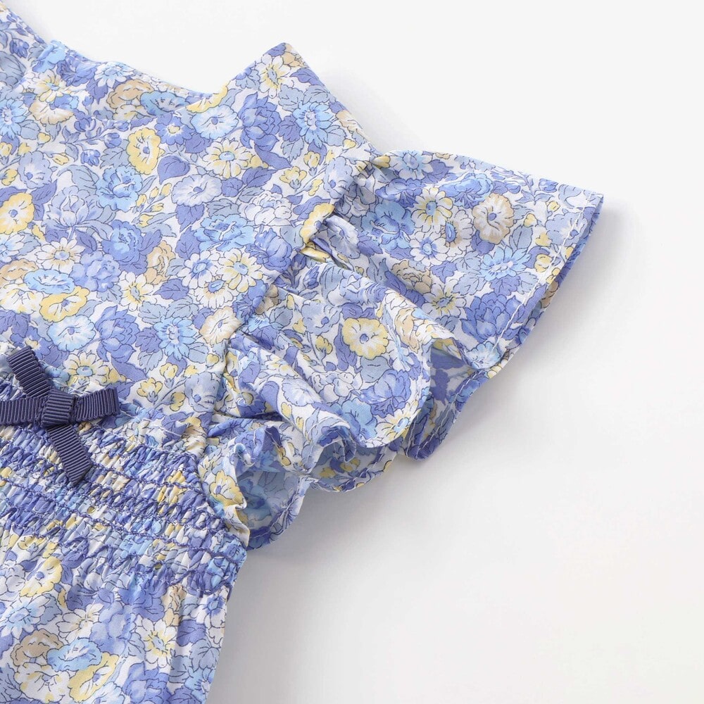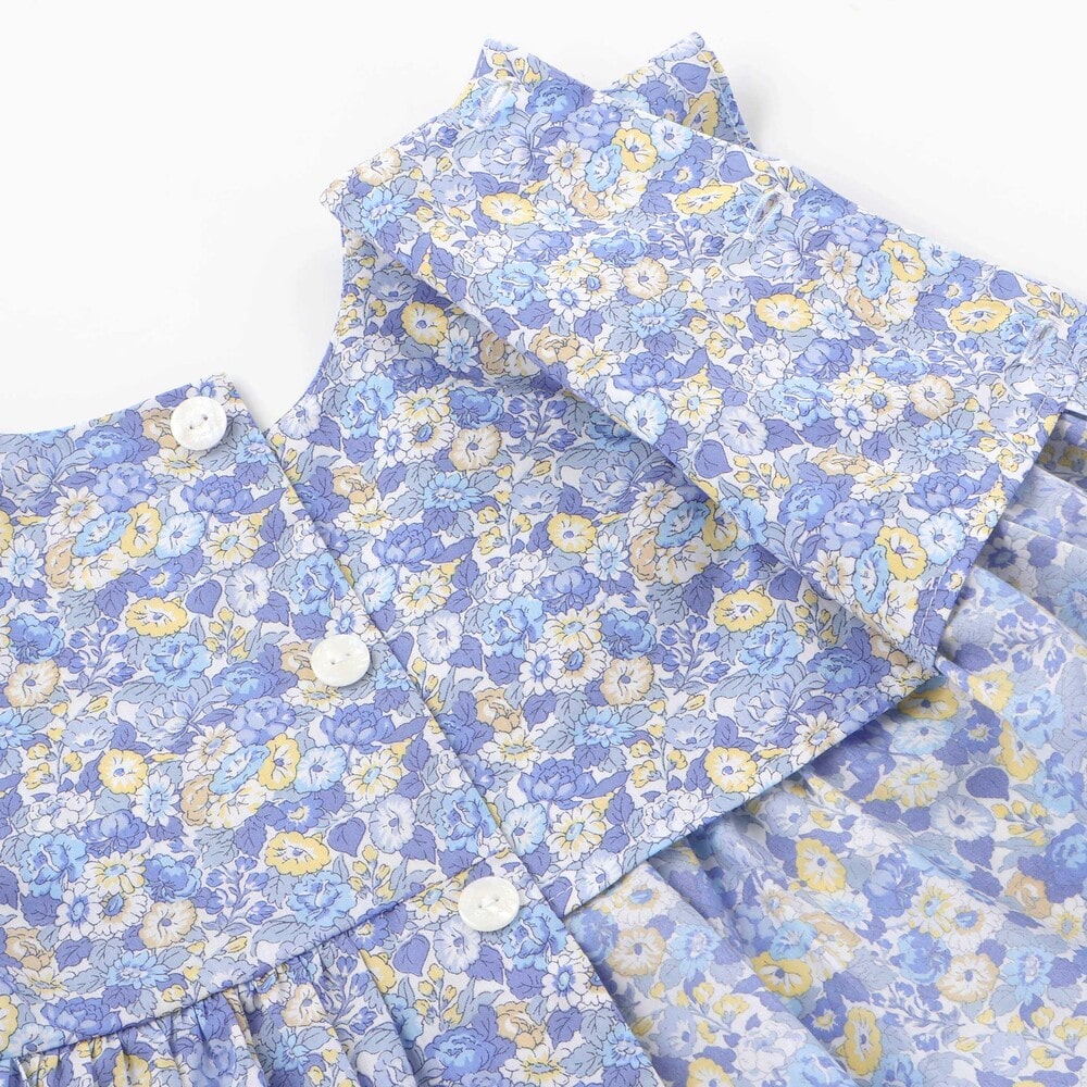スモッキング刺しゅうの上にちょこんと添えられたリボンやフリル袖が可愛らしさを引き立て、リバティを代表するタナローン生地の滑らかな質感が高級感を漂わせます。