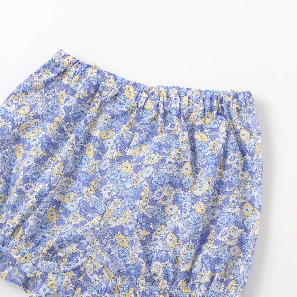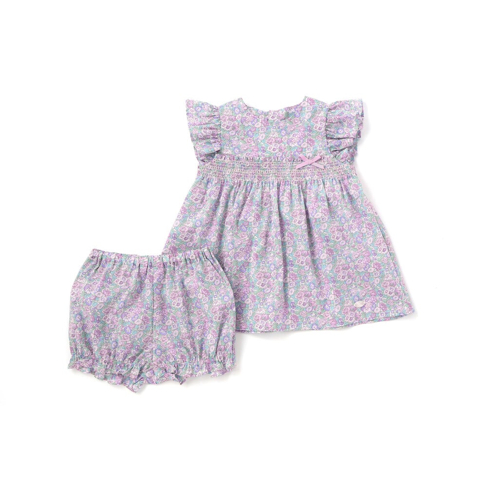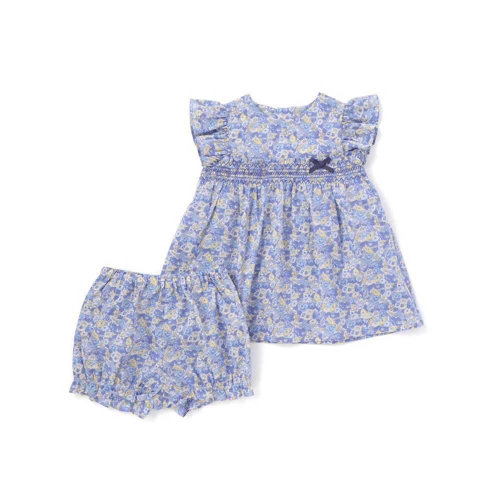 リバティプリントの生地を使用し、フリル袖とスモッキング刺しゅうでギャザーを寄せたワンピースとブルマの2点セット。