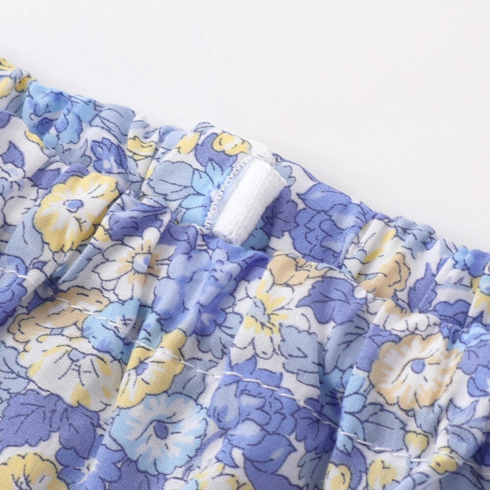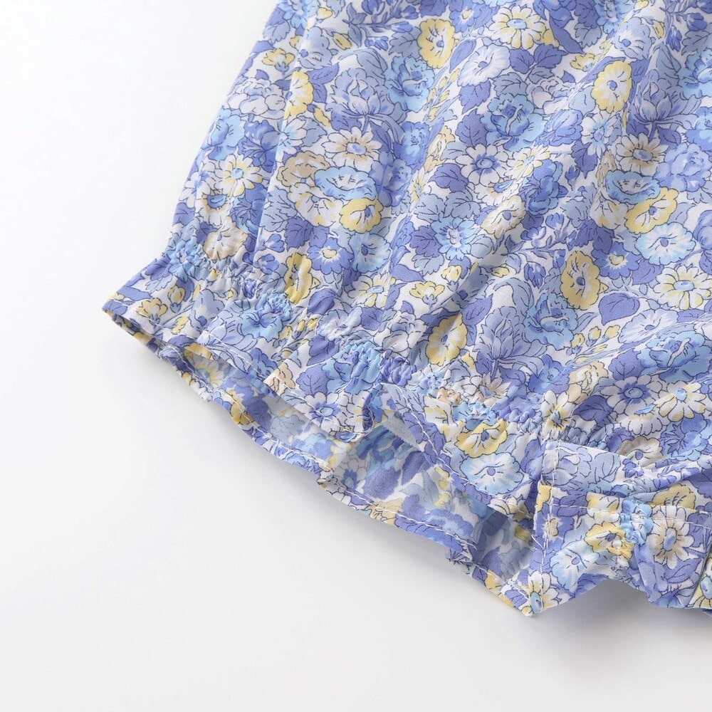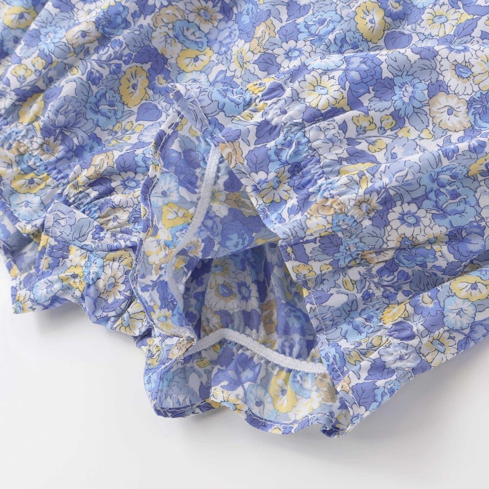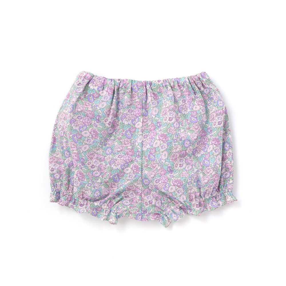 リバティプリントの生地を使用し、フリル袖とスモッキング刺しゅうでギャザーを寄せたワンピースとブルマの2点セット。