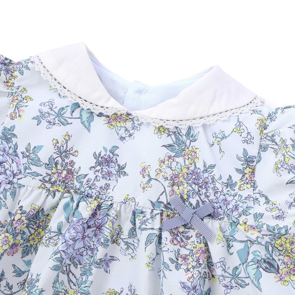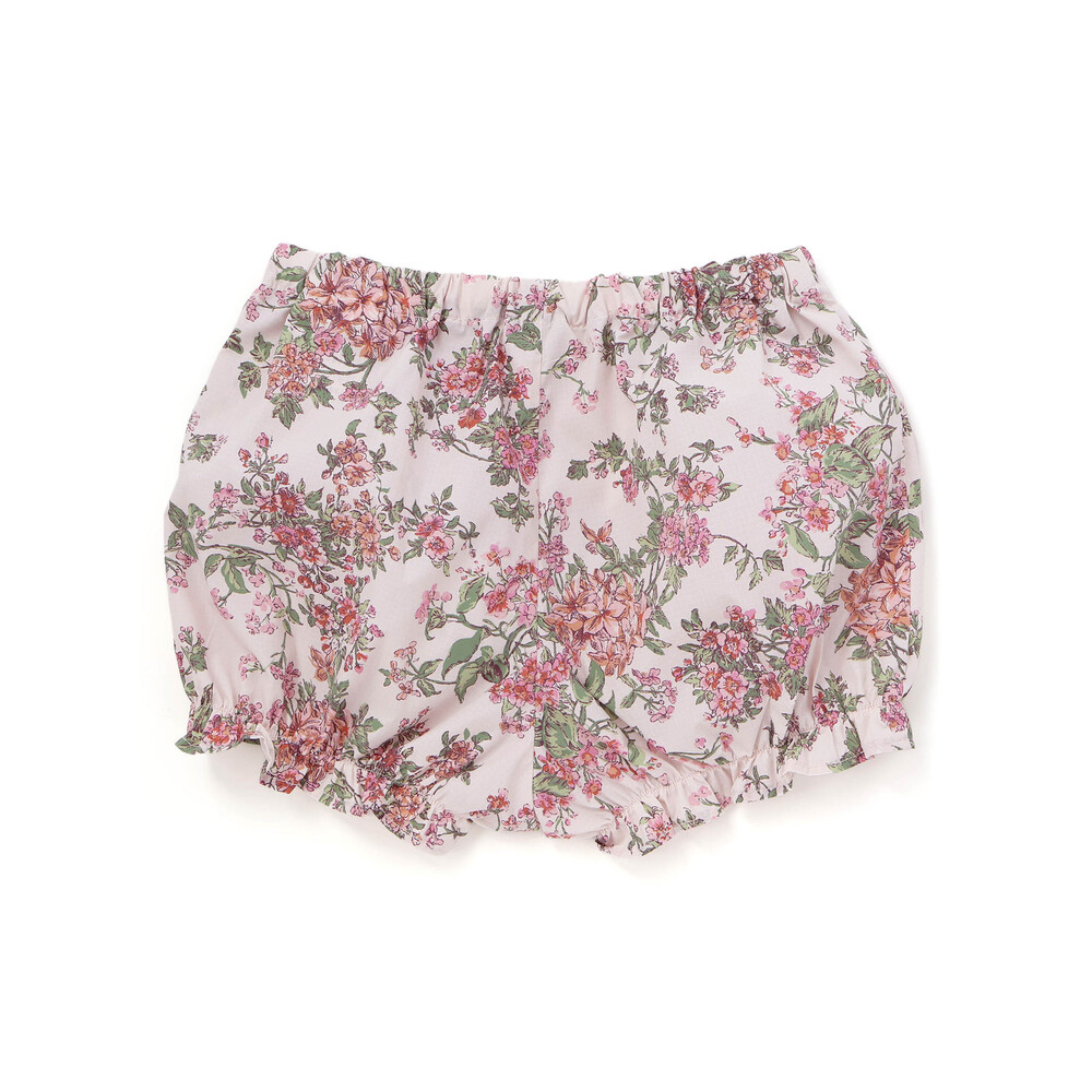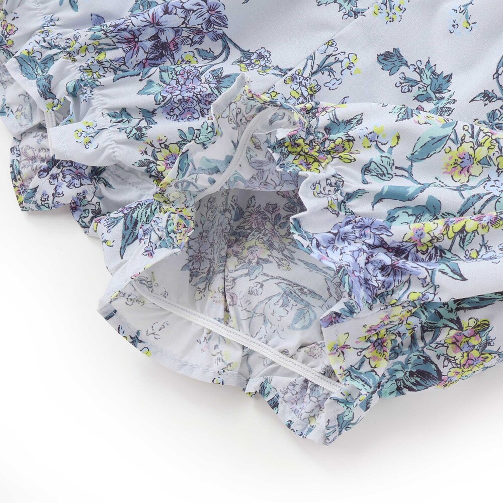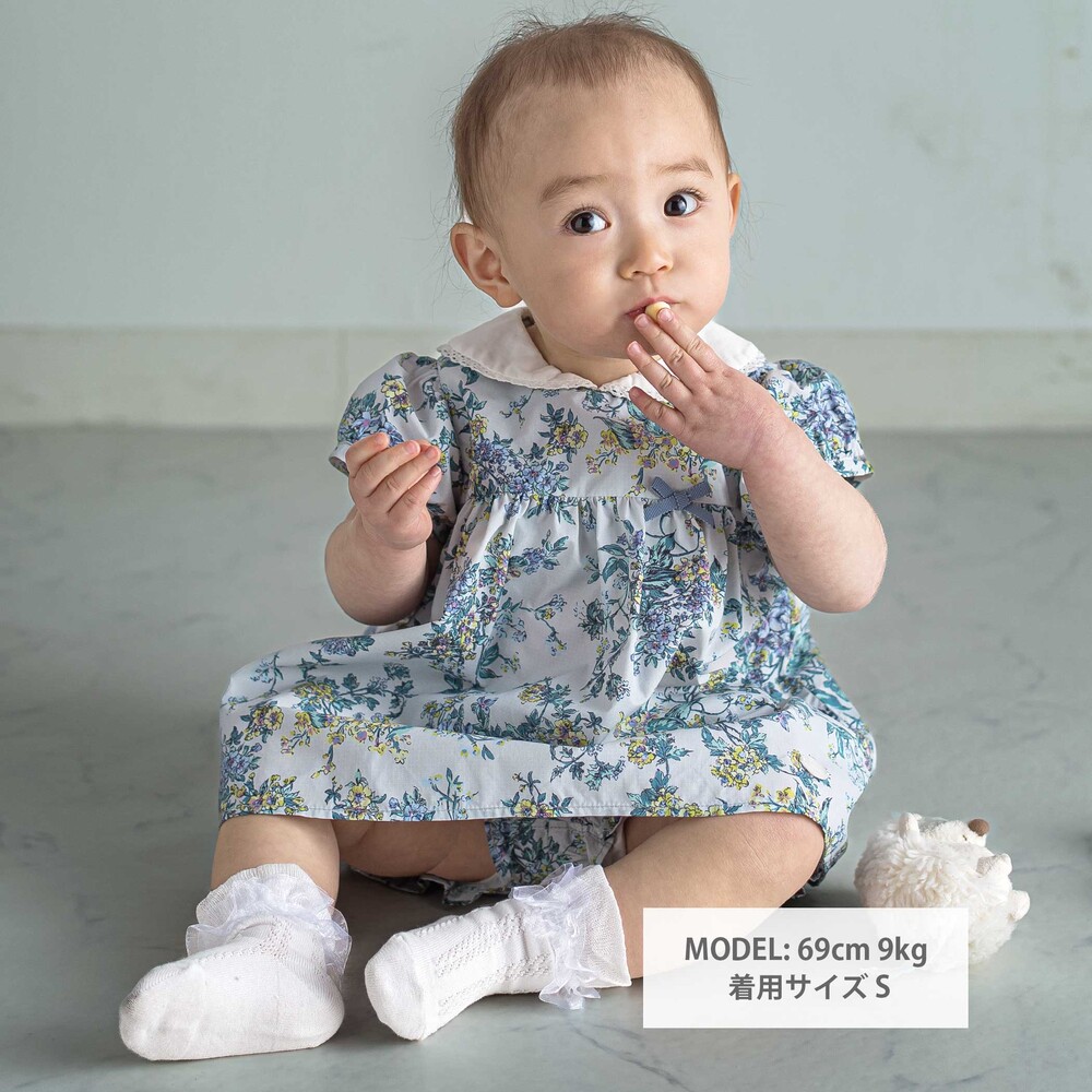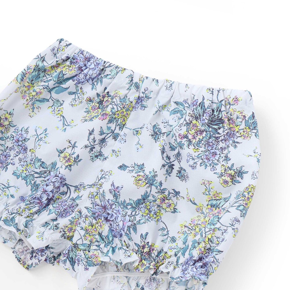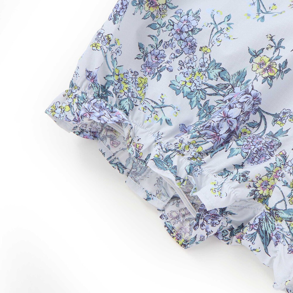 リバティ柄のリップストップ生地を使用し、レースを縁にあしらった襟とパフスリーブで華やかさをプラスしたワンピースとブルマのセットです。