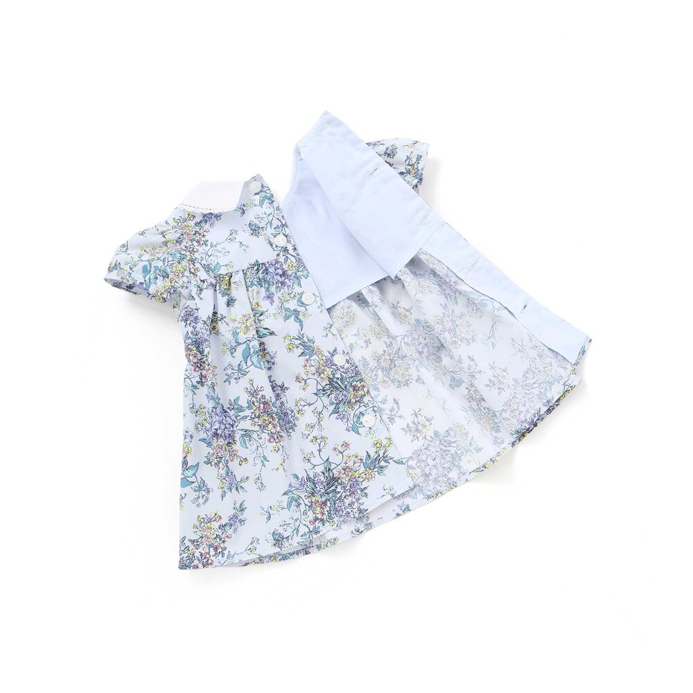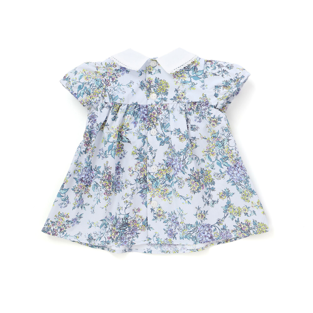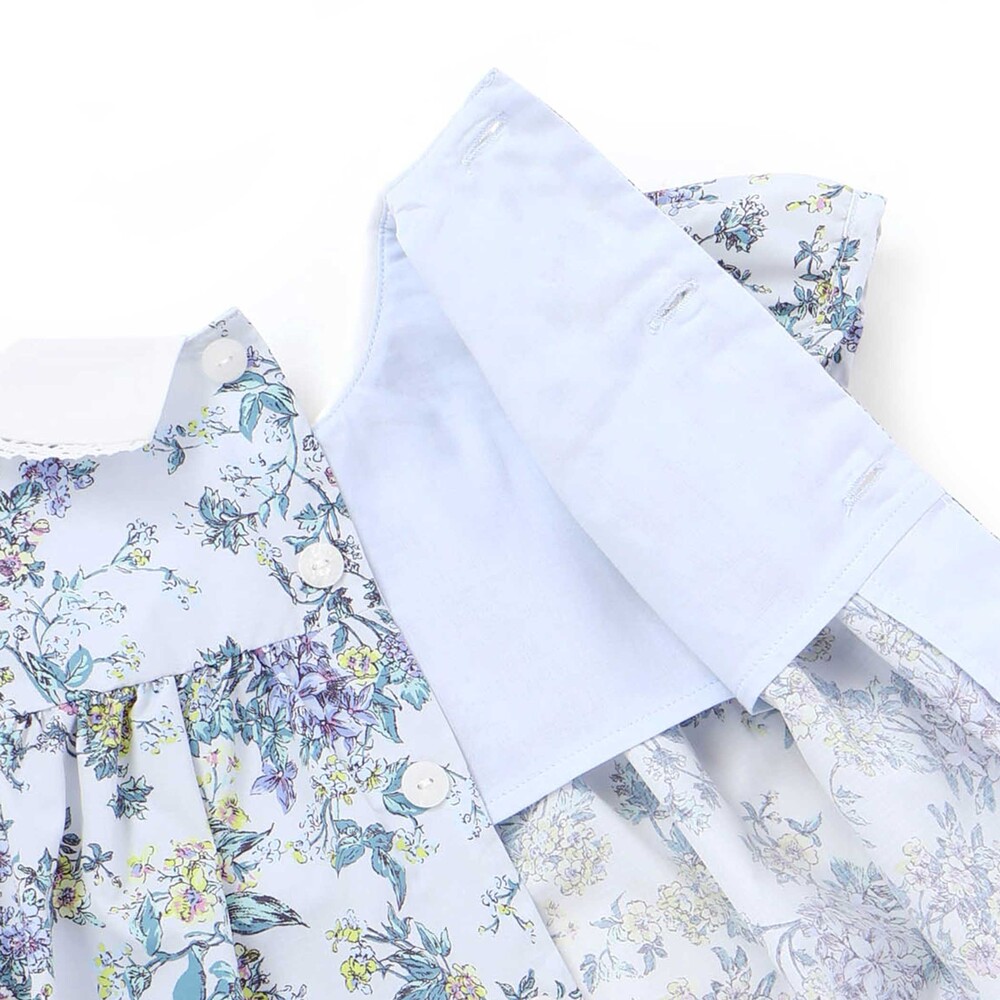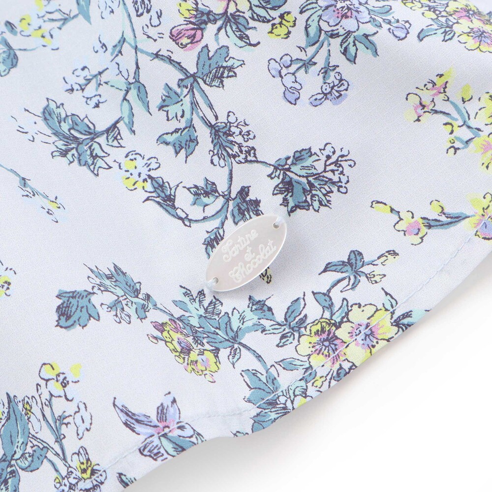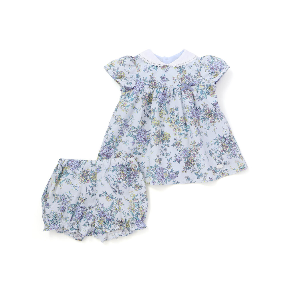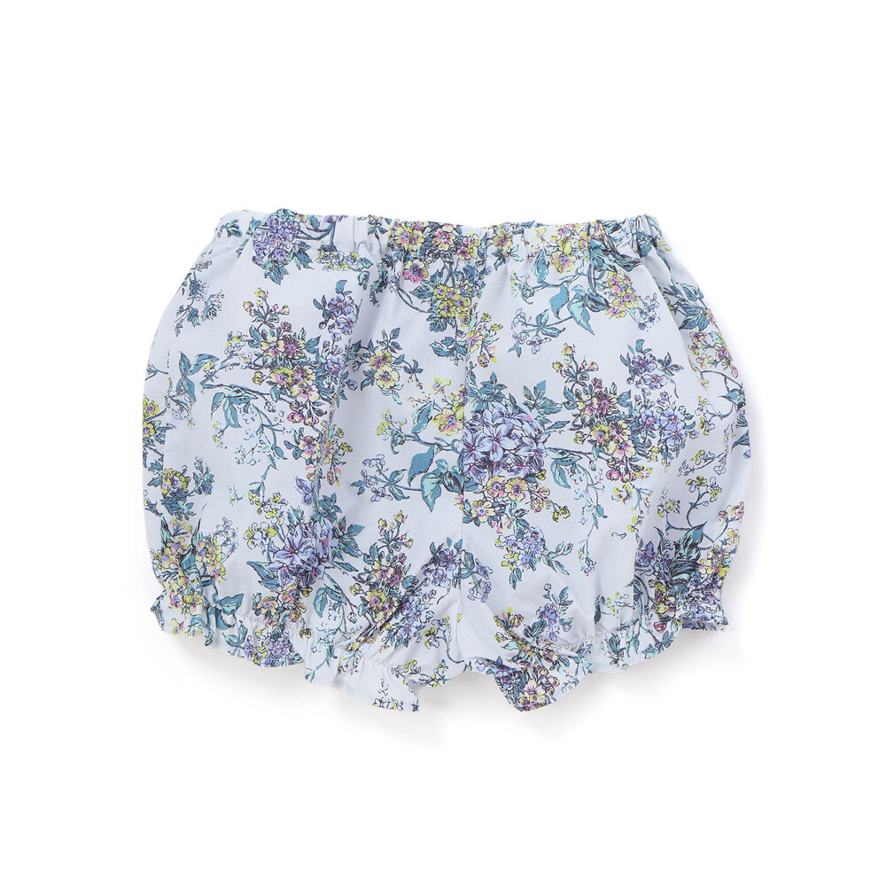 リバティ柄のリップストップ生地を使用し、レースを縁にあしらった襟とパフスリーブで華やかさをプラスしたワンピースとブルマのセットです。