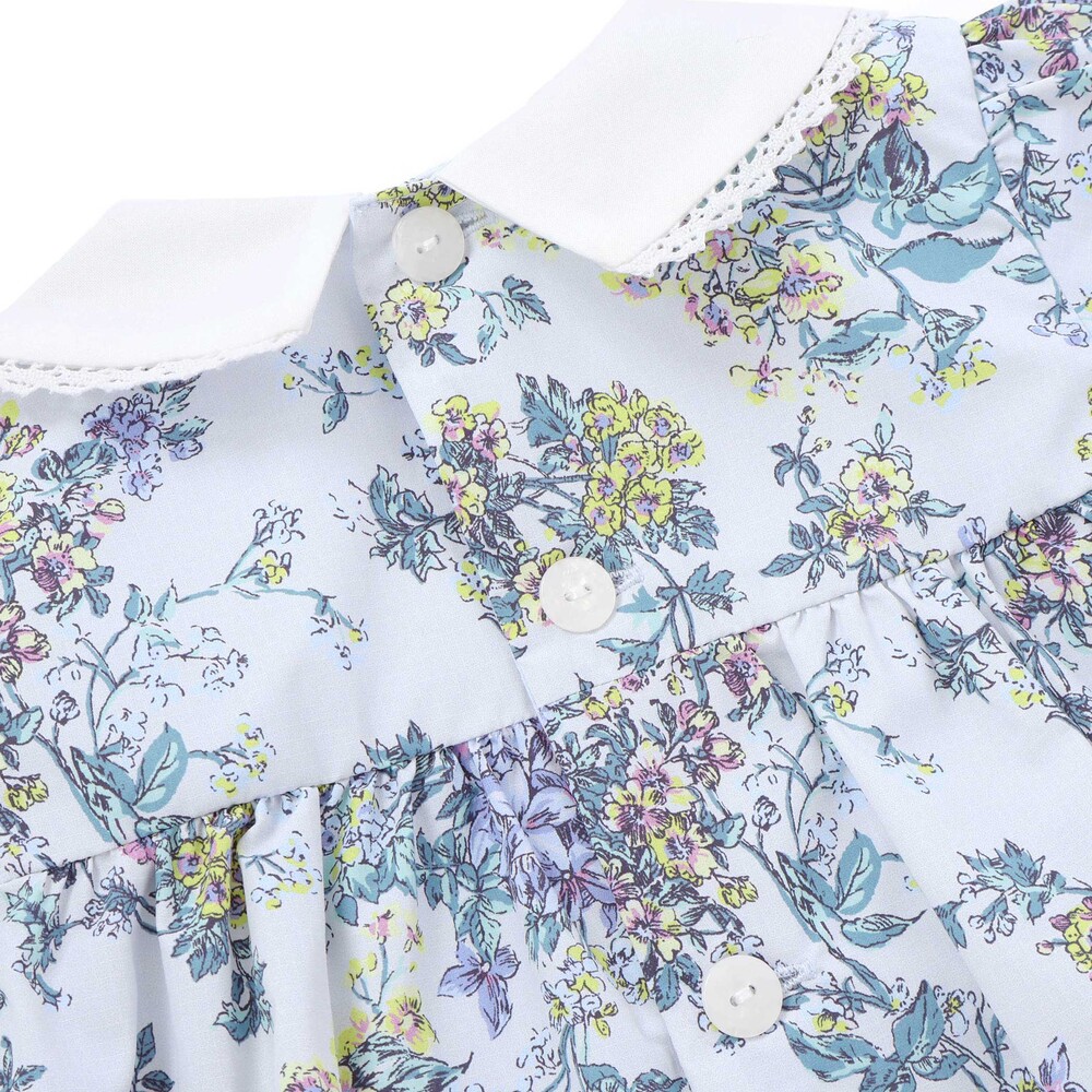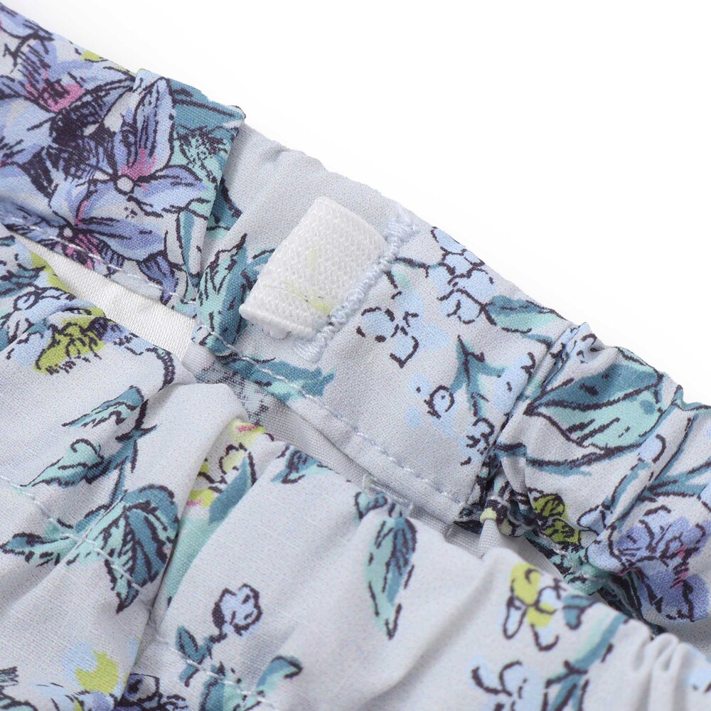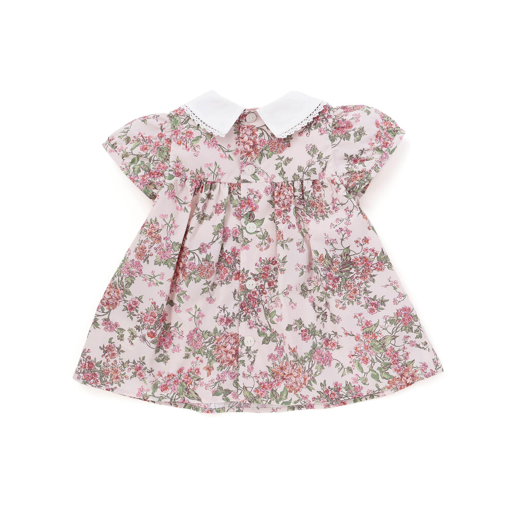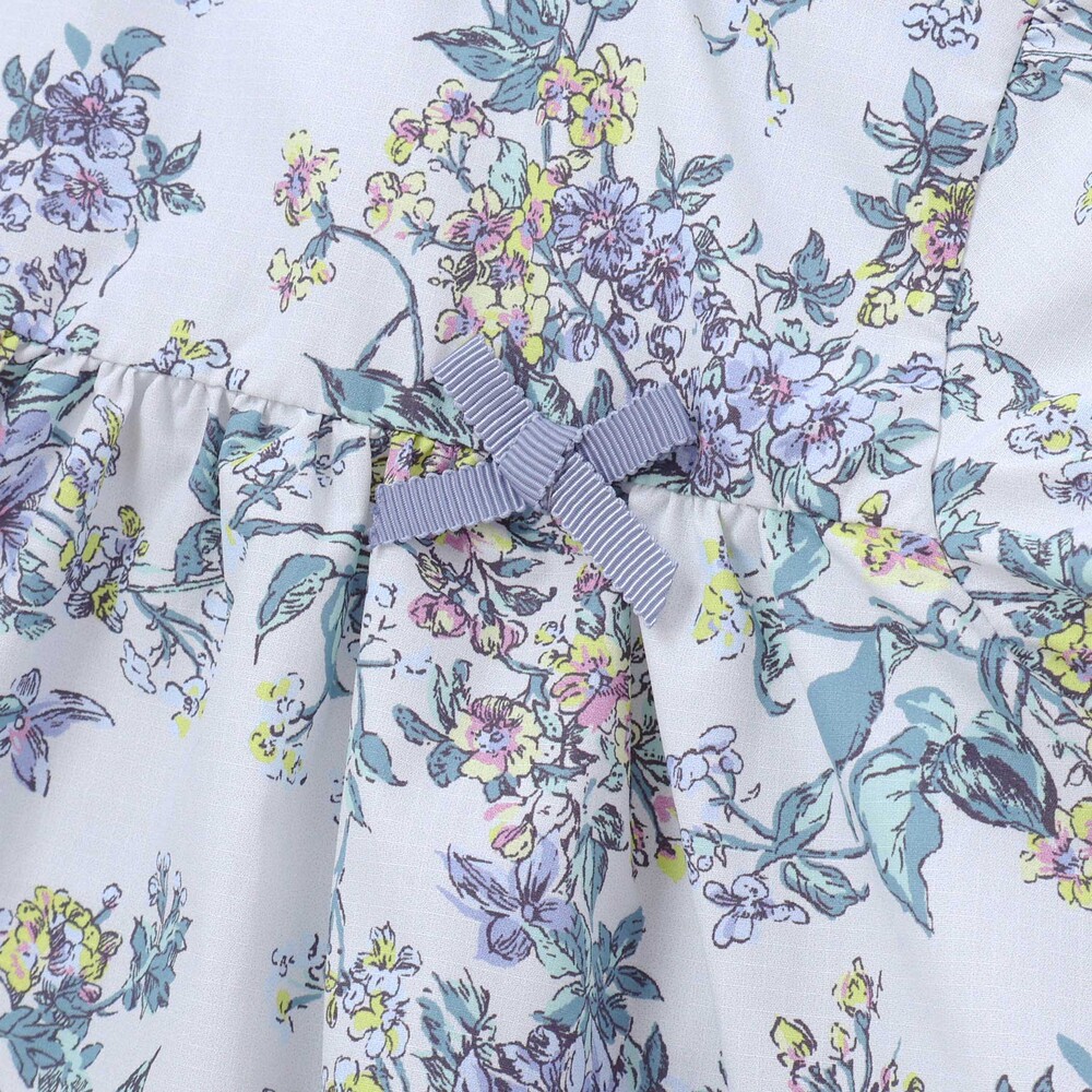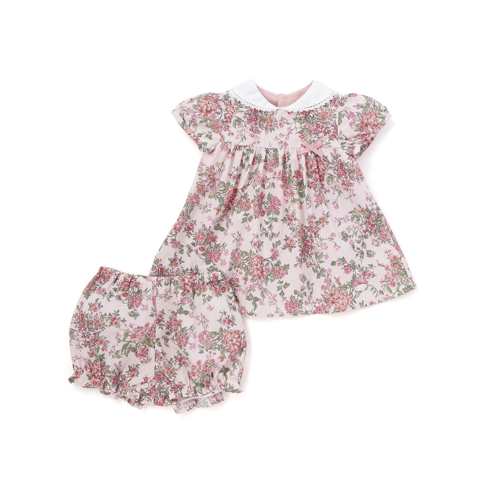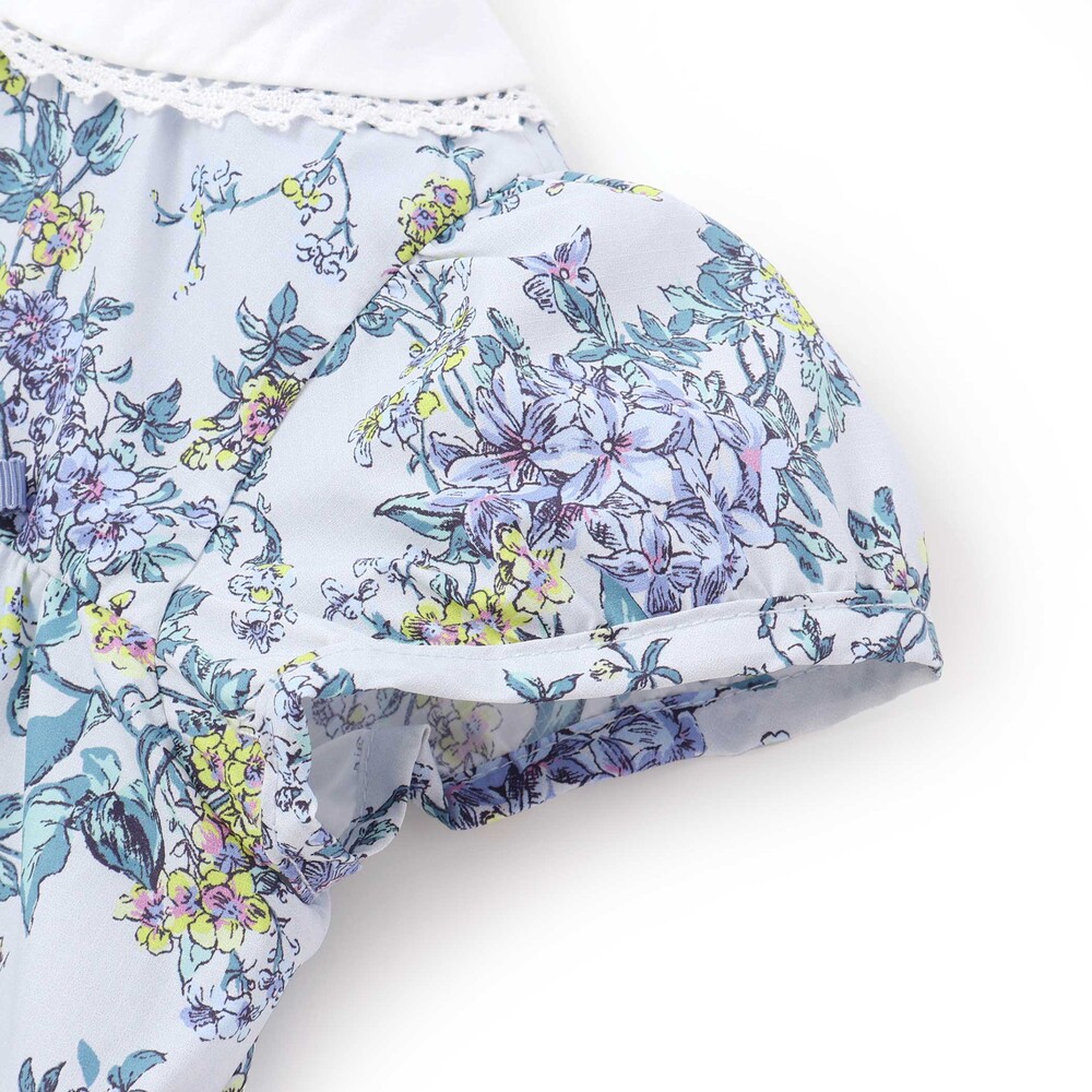 リバティ柄のリップストップ生地を使用し、レースを縁にあしらった襟とパフスリーブで華やかさをプラスしたワンピースとブルマのセットです。