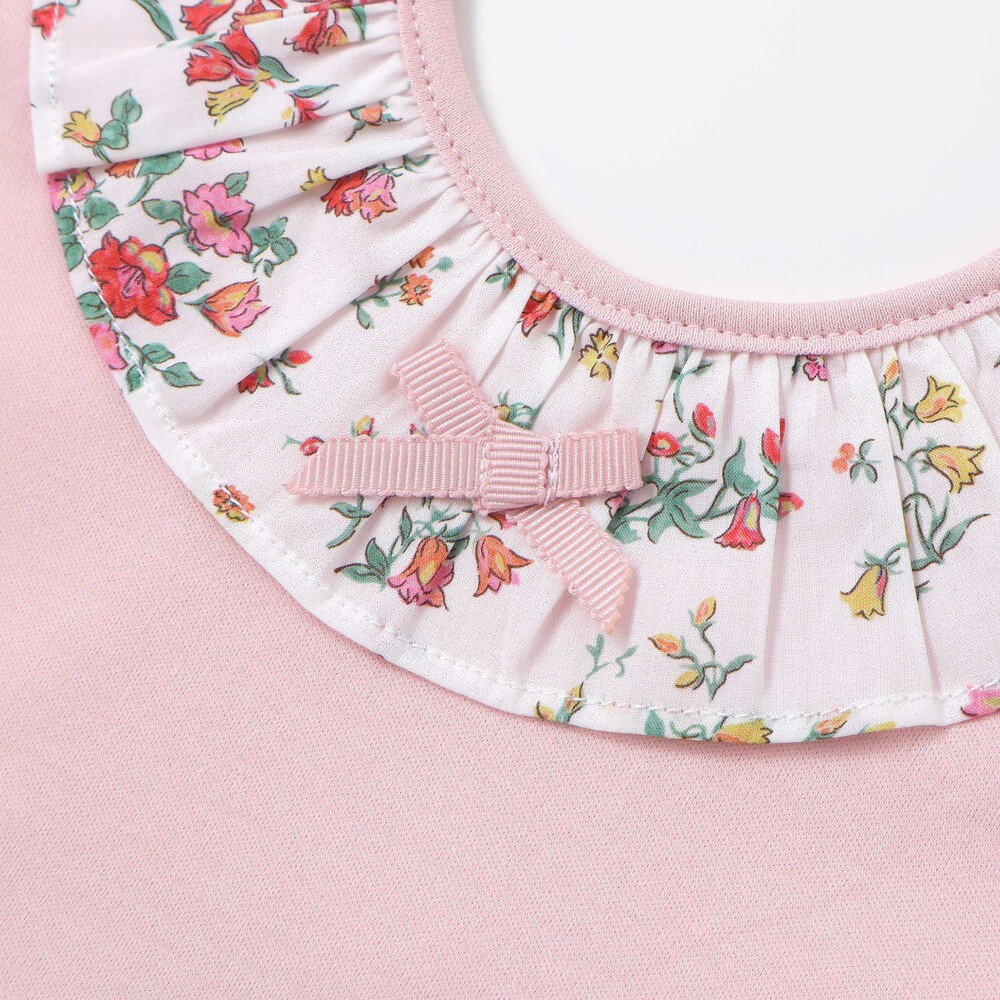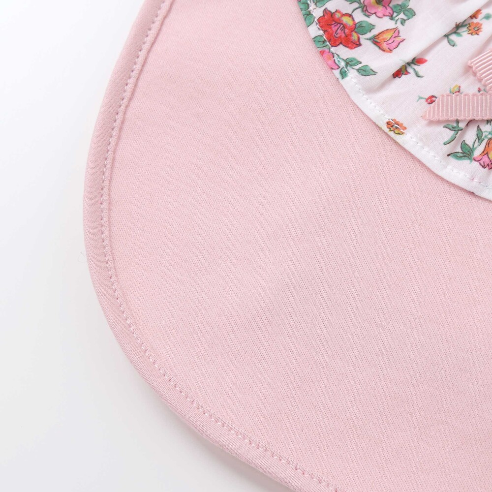 身生地に肌触りのスーピマコットンを使用したスタイにリバティ柄のフリルとリボンが映えるデザイン。