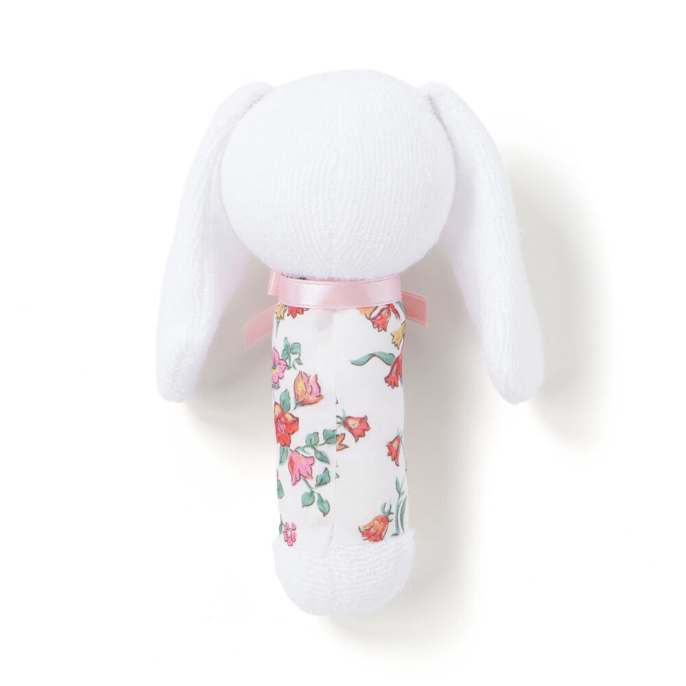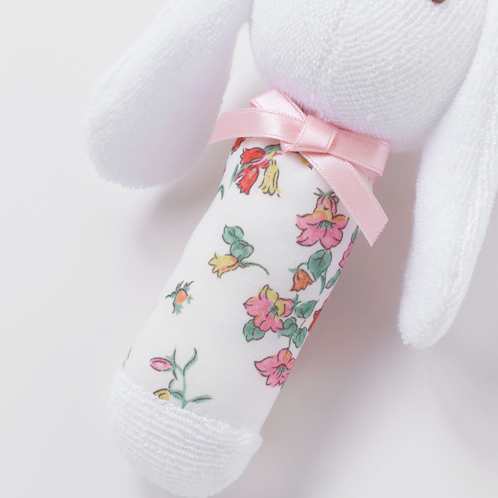 リボンを添えたウサギをモチーフにしたキュートなスティック状のラトル(ニギニギ)。