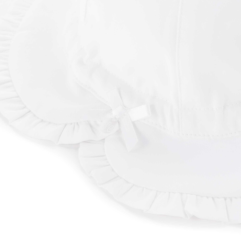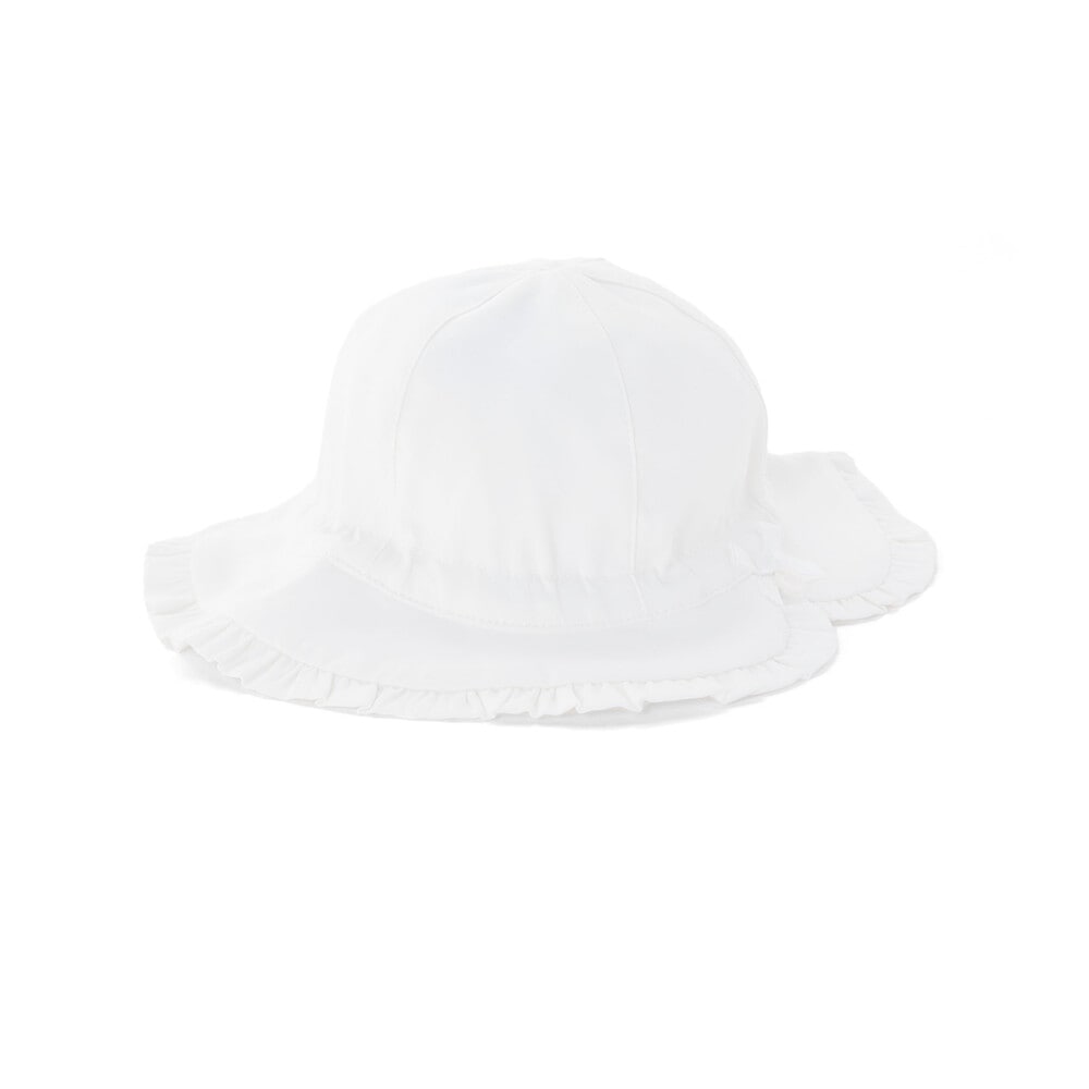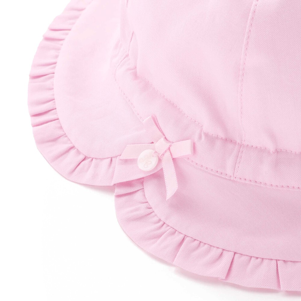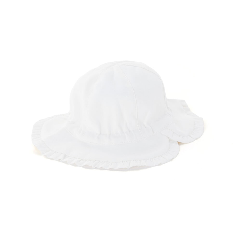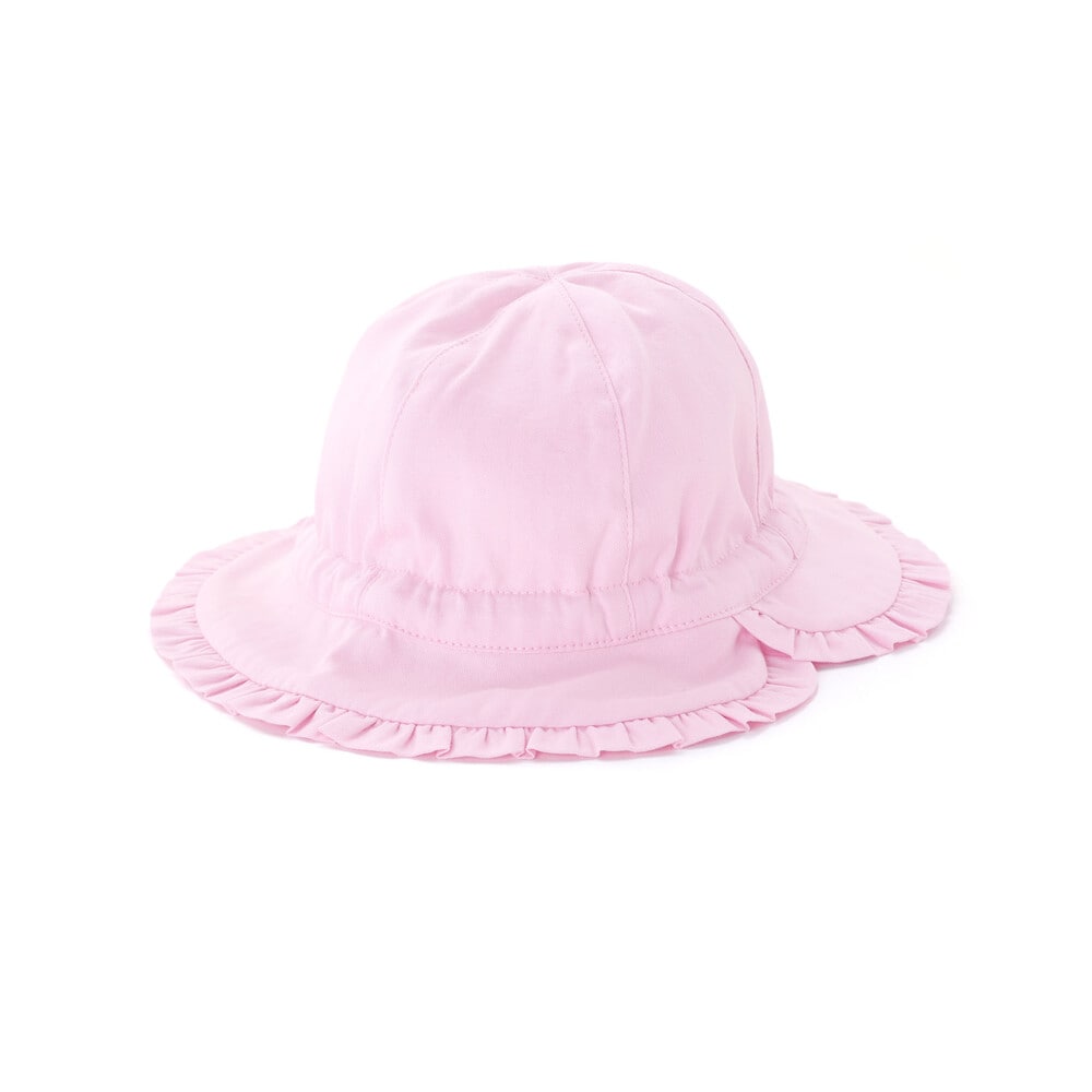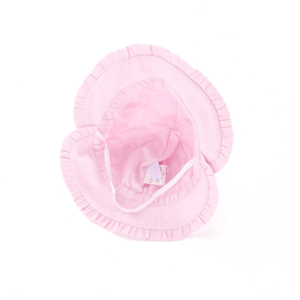 ギャザーフリルを縁に施したデザインが可愛らしい女の子ベビー用リボンハット。