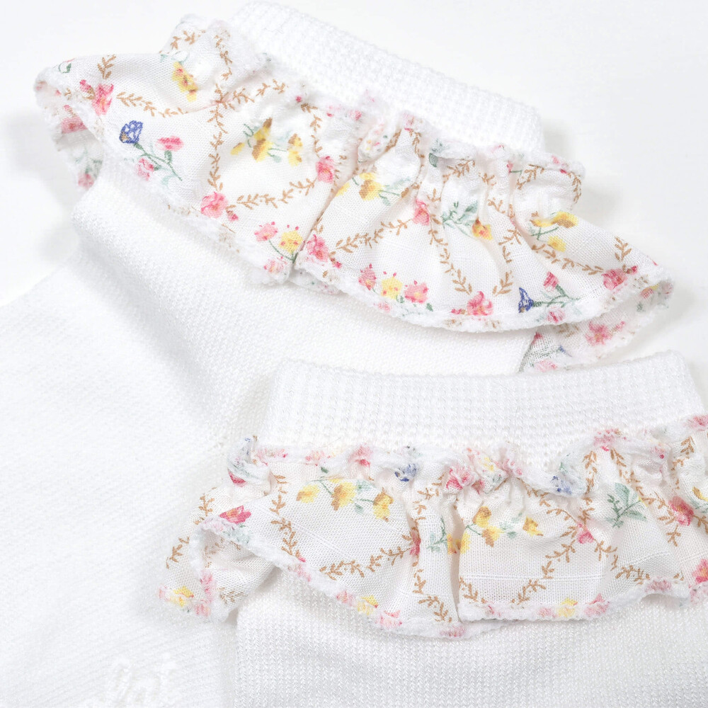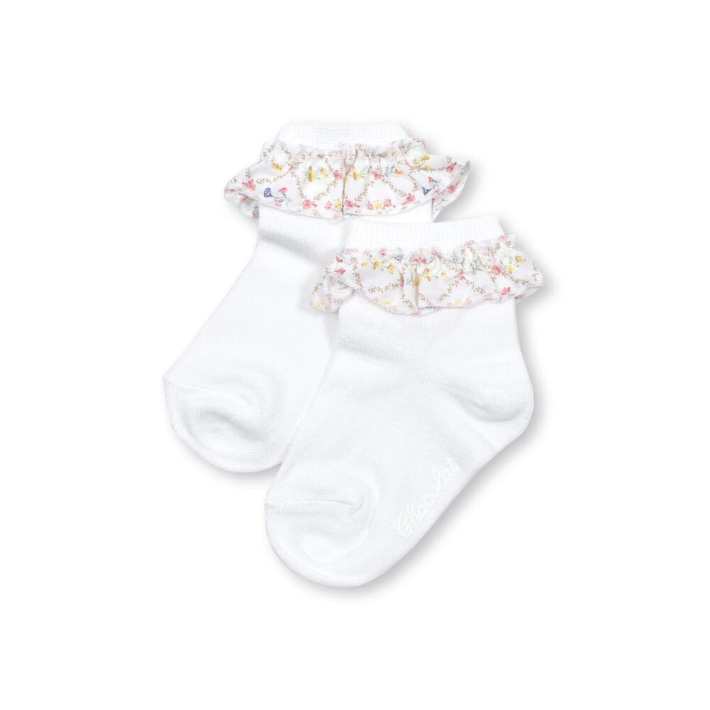 ドビー風ストライプ柄に花柄をプリントした生地をフリル部分に使用したベビー用ショート丈ソックス。