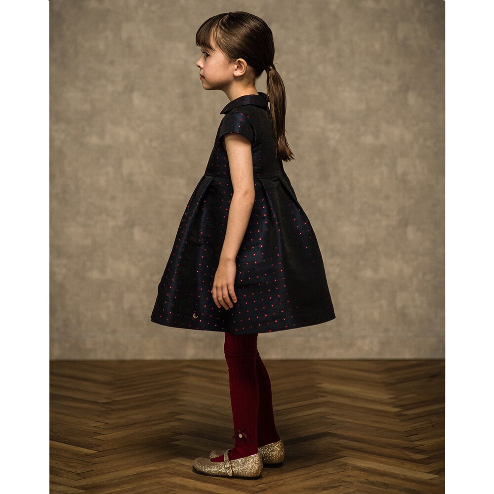 丸襟やウエストのタックでふんわりと広がるシルエット等、女の子らしい上品さが満載なデザイン。