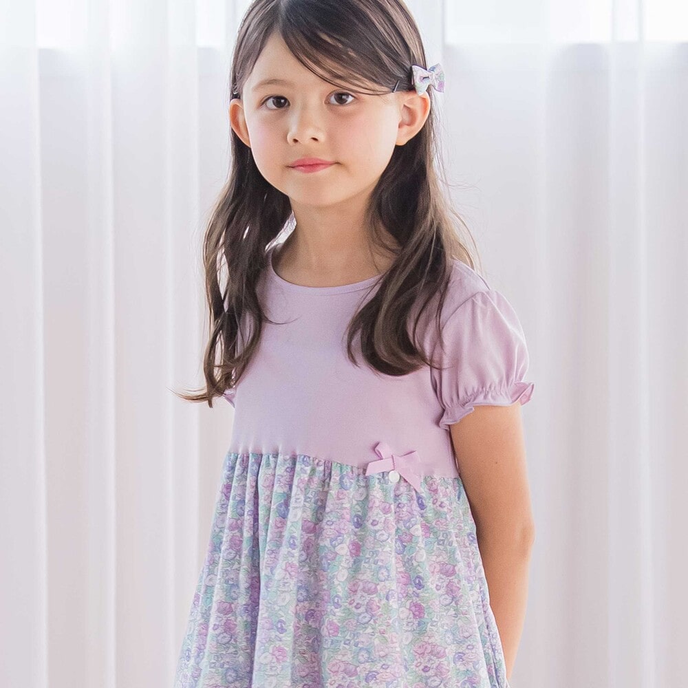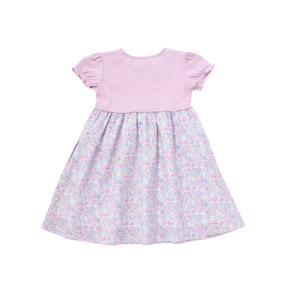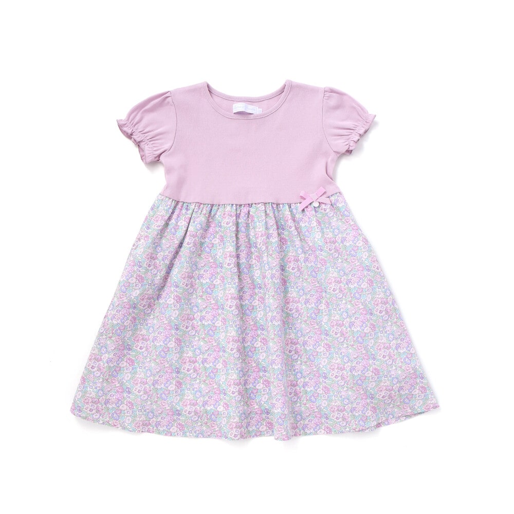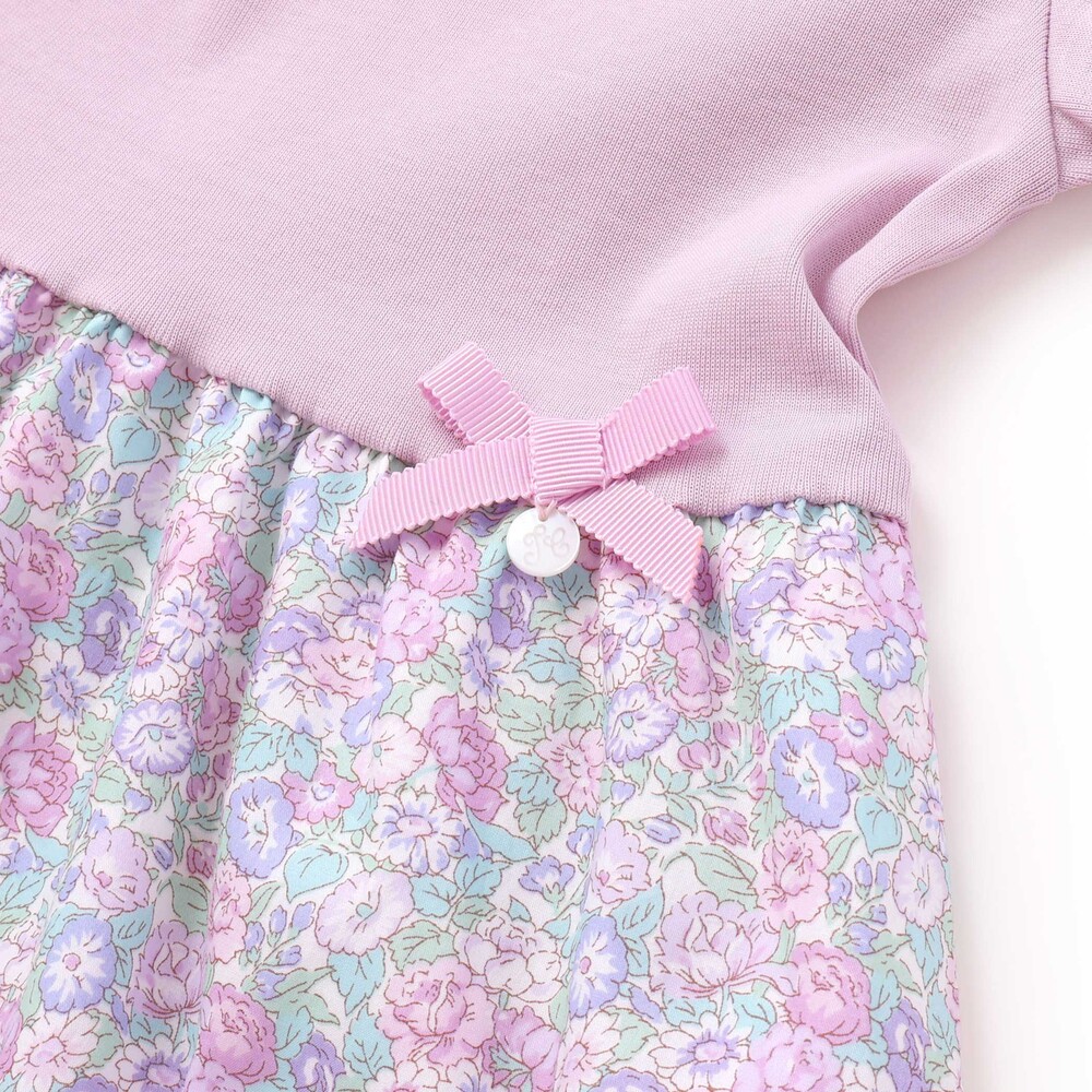 毛羽立ちを抑えたフライス生地とタナローンのリバティプリントの生地を切り替えたデザインの女の子用ワンピースです。