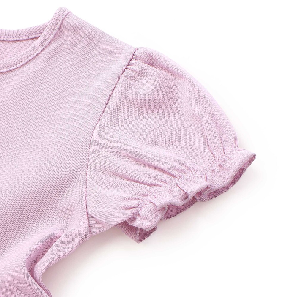伸縮性のあるフライス生地を上身頃に使用することで、お着替えをスムーズにできるように配慮したワンピース。