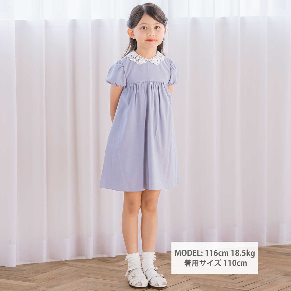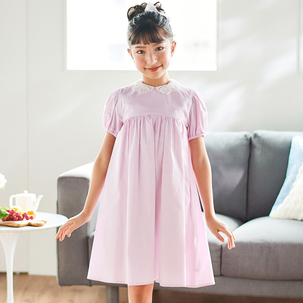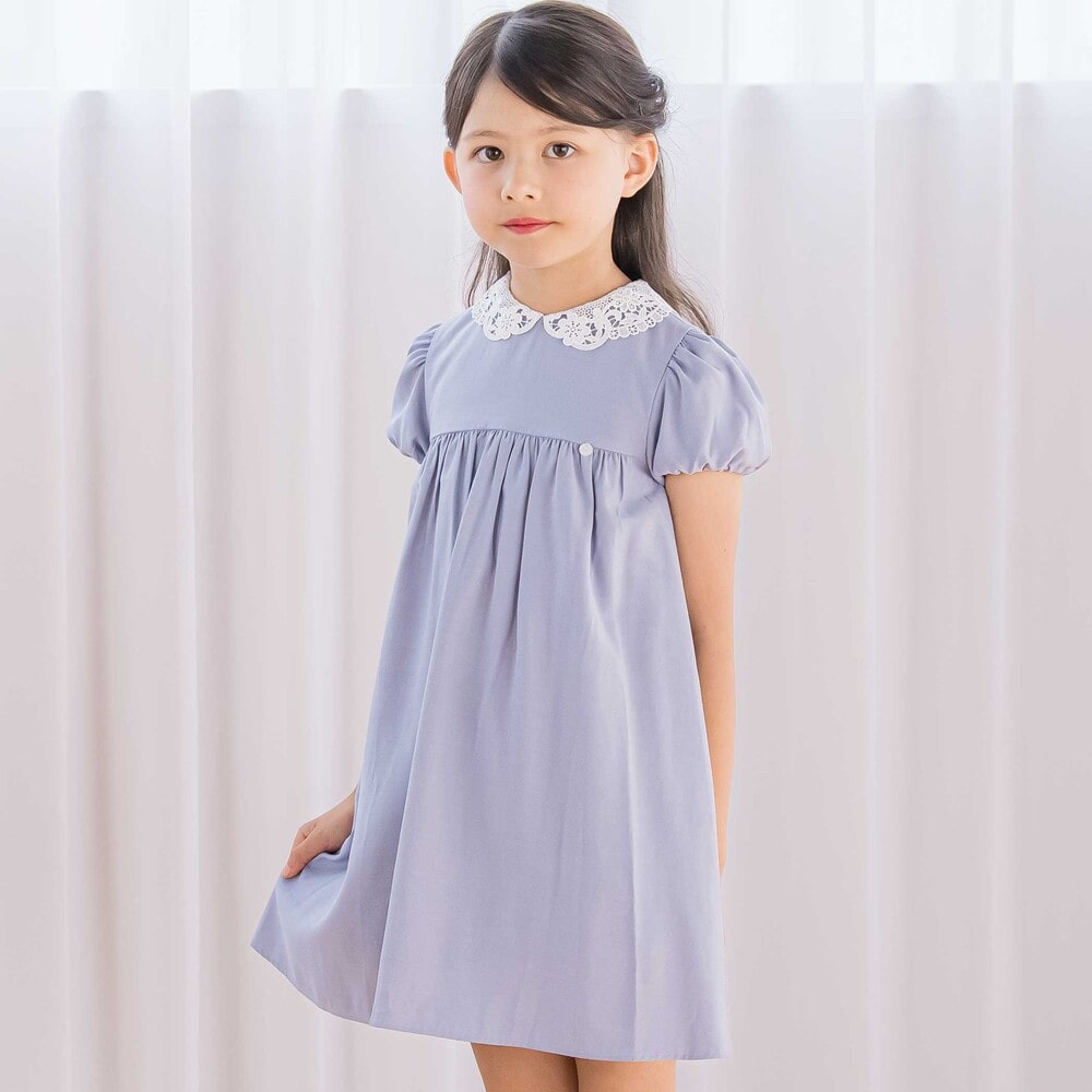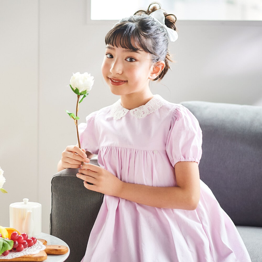 レースの襟とふんわりパフスリーブが、女の子らしい華やかさを引き立てます。