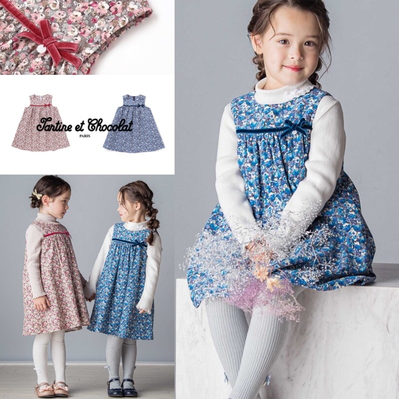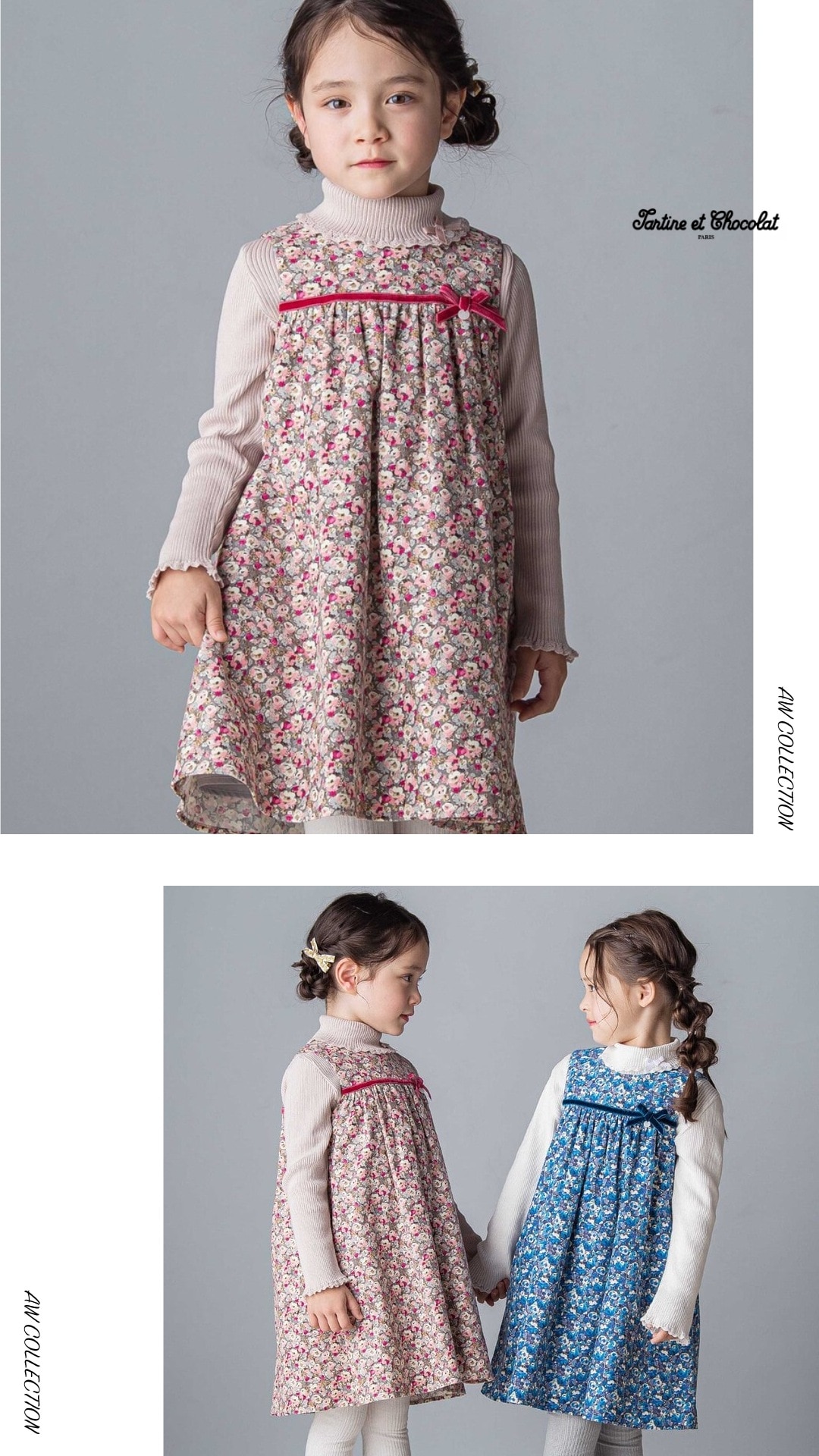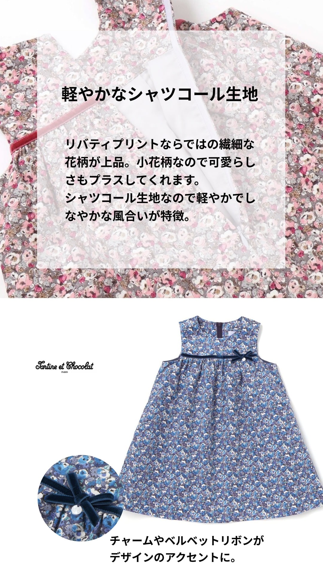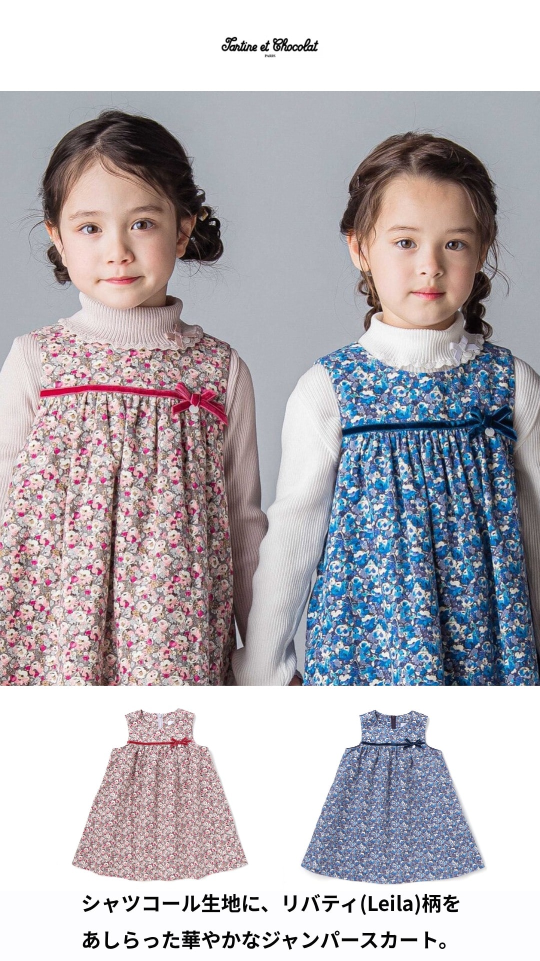 シャツコール生地に、リバティ(Leila)柄をあしらった華やかな女の子用ジャンパースカート。