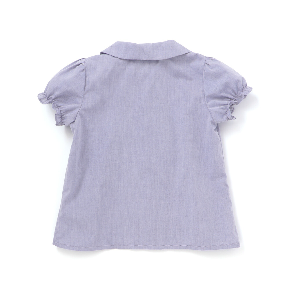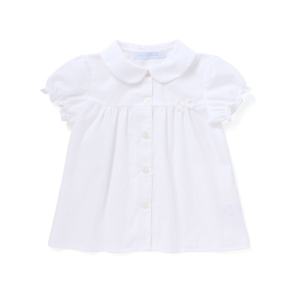 可愛らしい丸襟と胸元にあしらわれたリボンが特徴のパフスリーブブラウス。