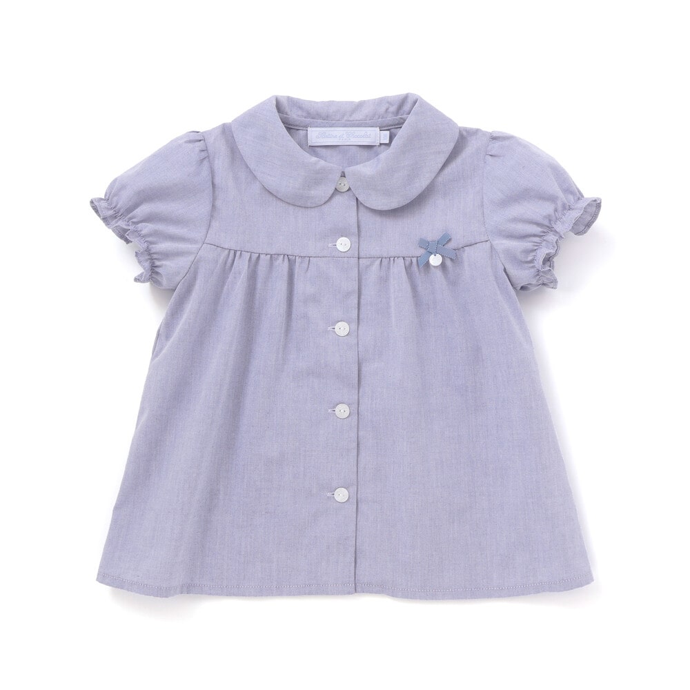 丸襟できちんとした印象を持たせながらも胸元にあしらったチャーム付きのリボンや裾に向かってやや広がるシルエットでキュートなデザイン。