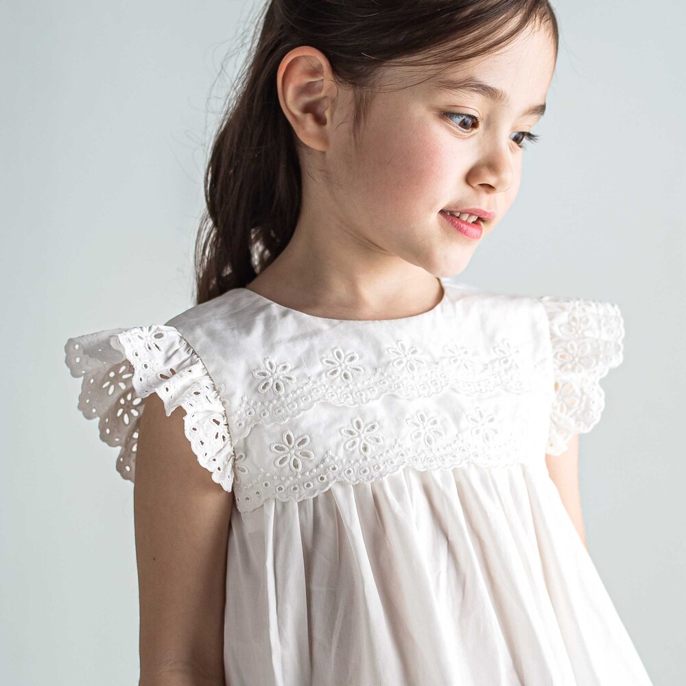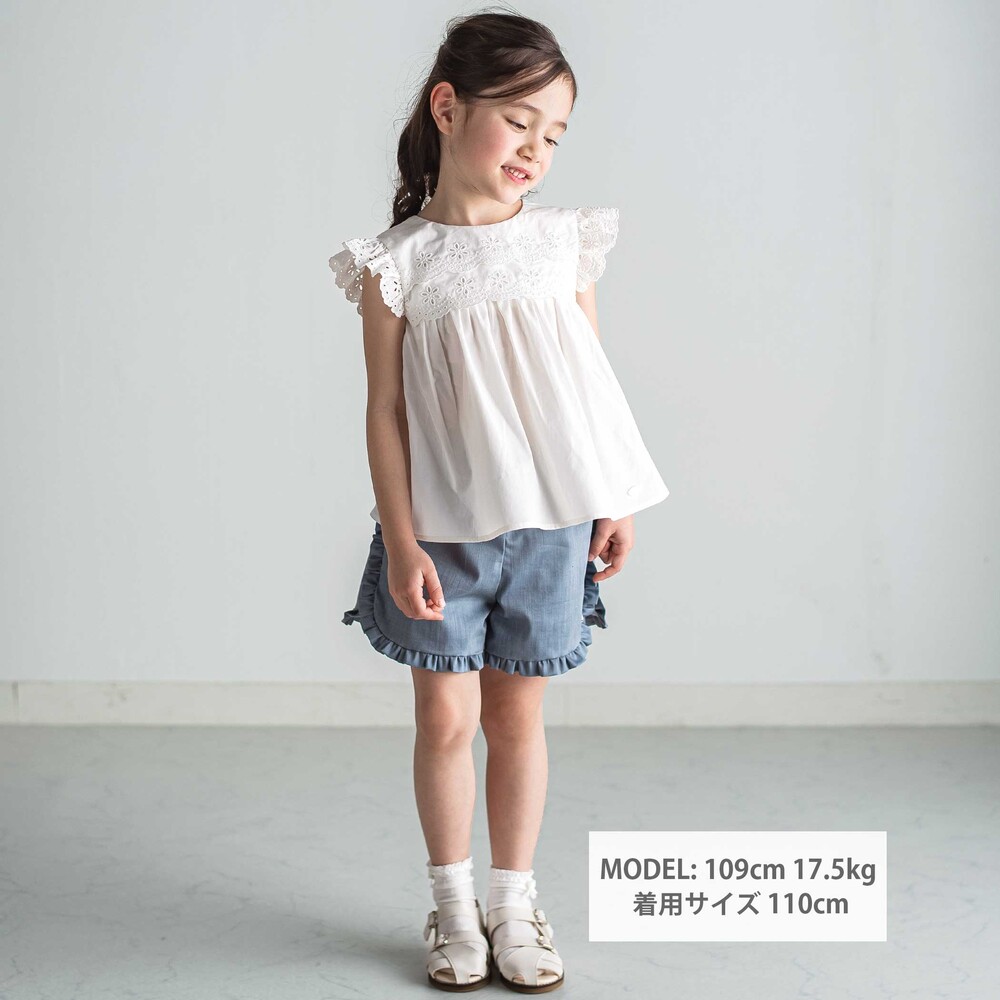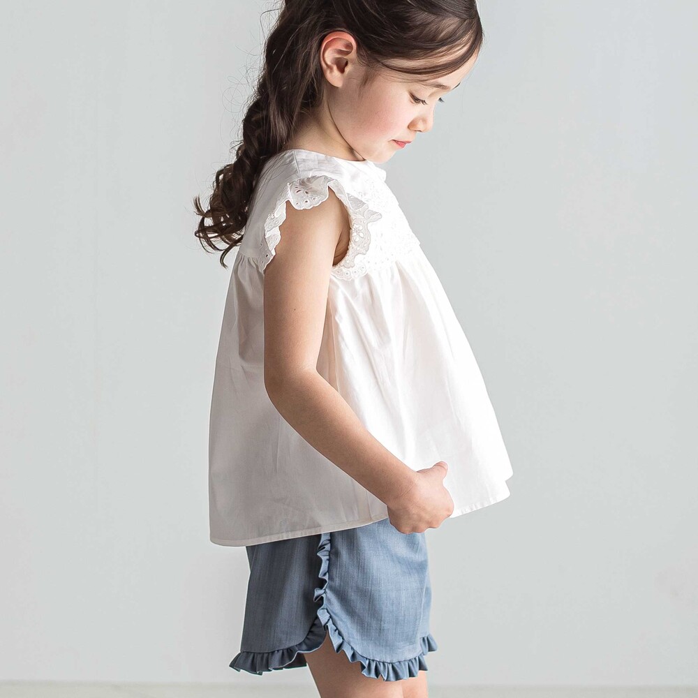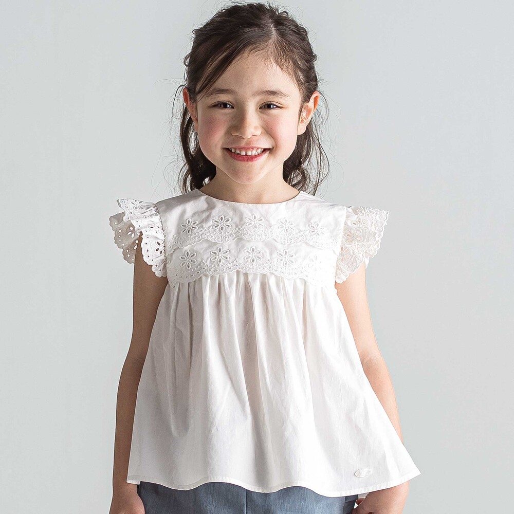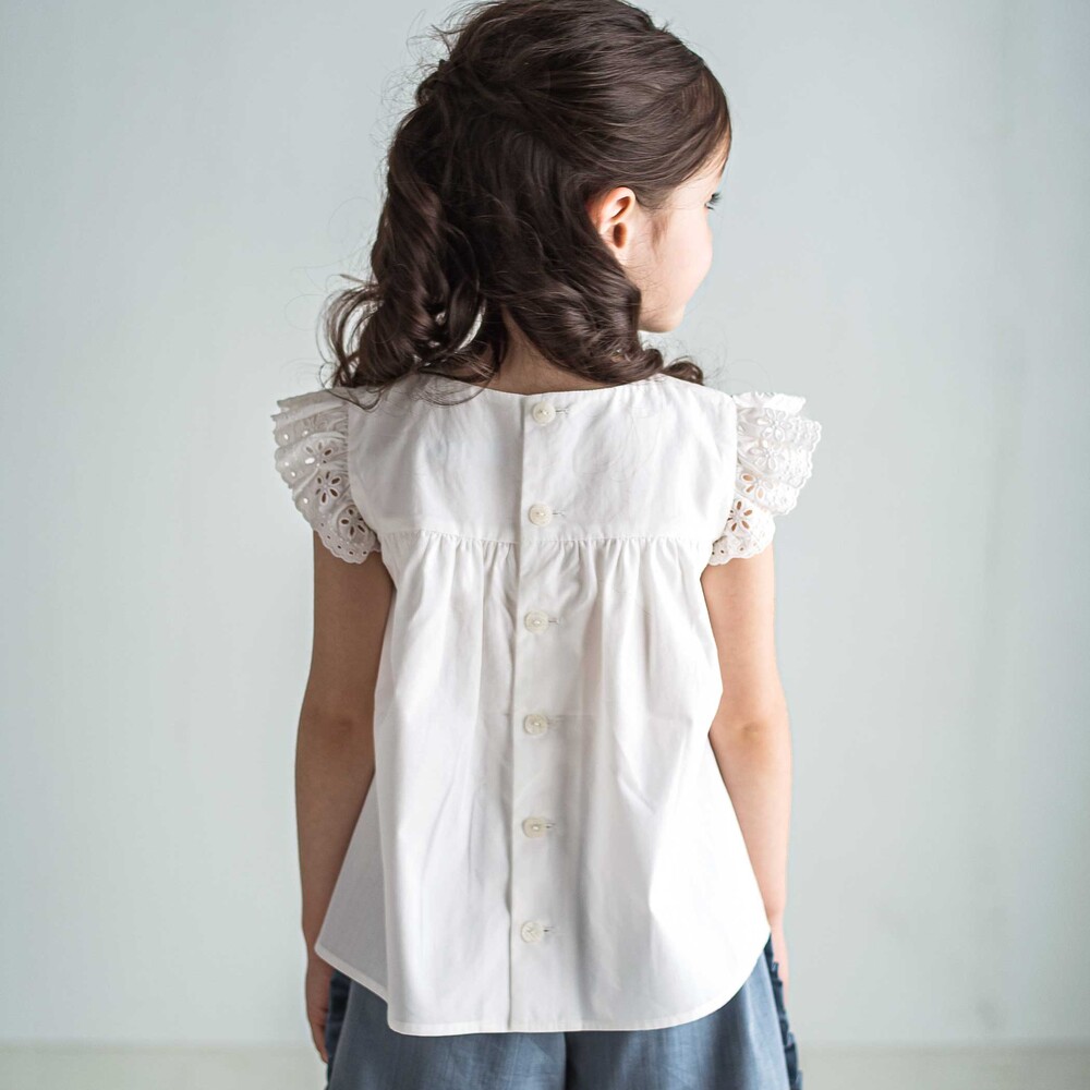 フリル袖と胸元のパンチングレースで2段にスカラップを施したデザインが上品な女の子用ブラウスです。