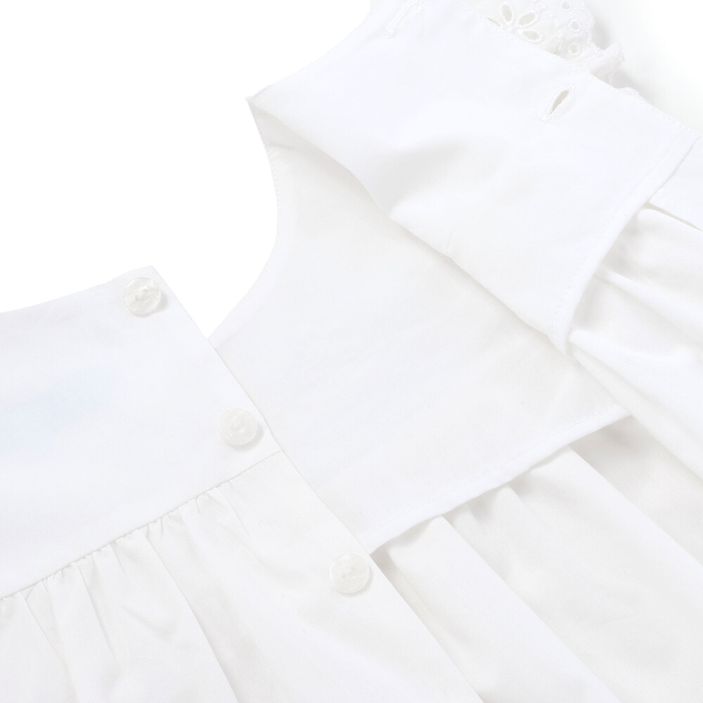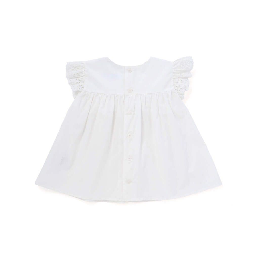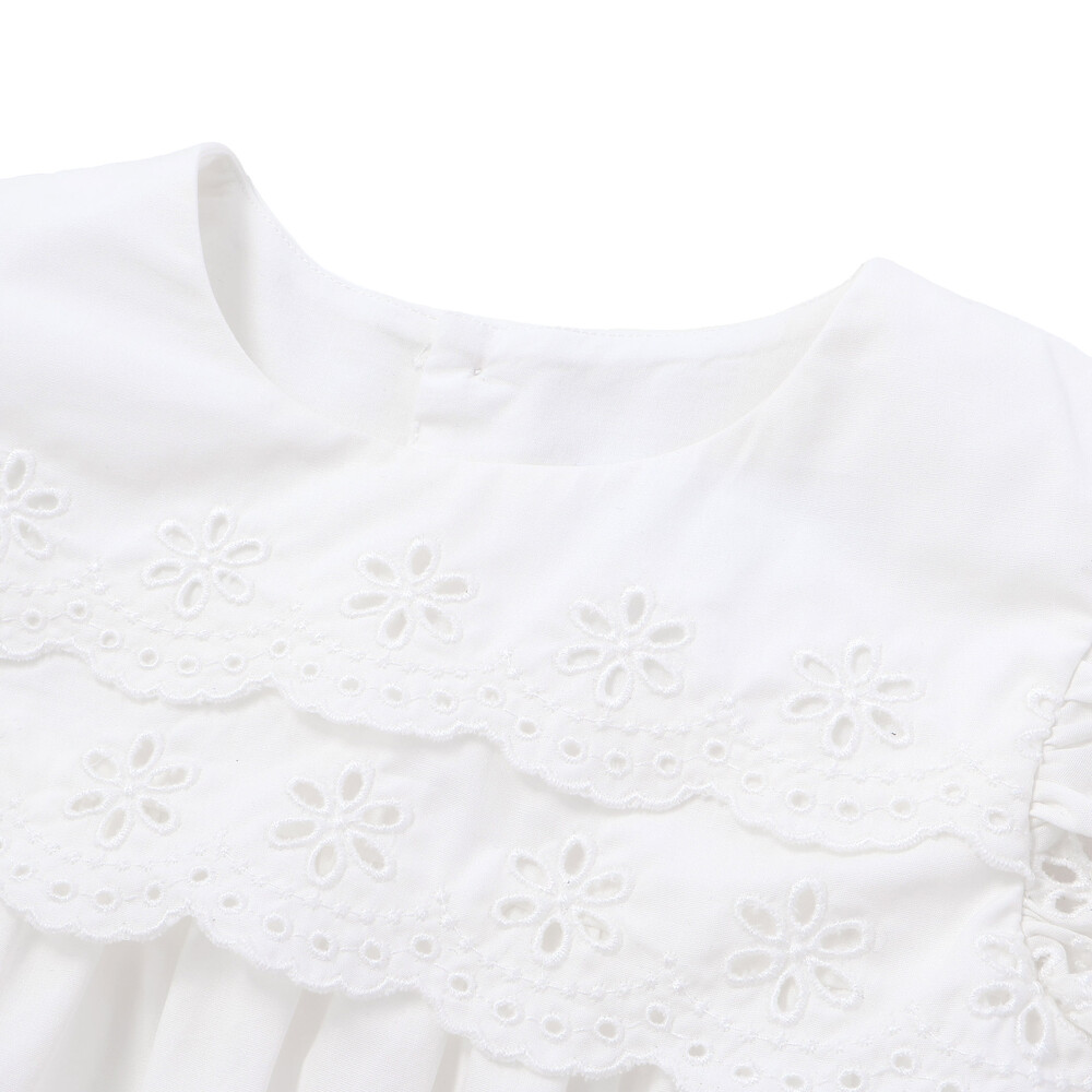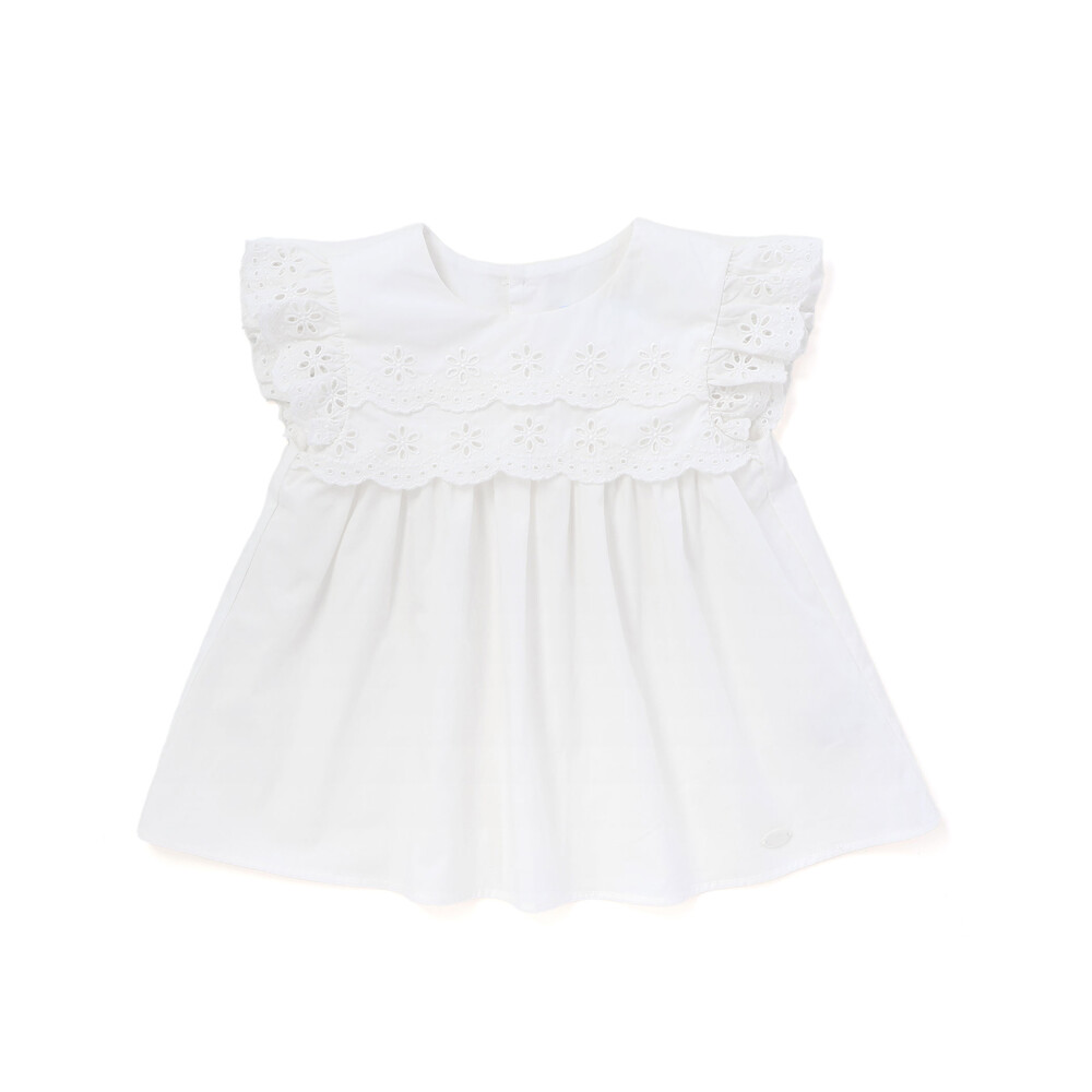 フリル袖と胸元のパンチングレースで2段にスカラップを施したデザインが上品な女の子用ブラウスです。