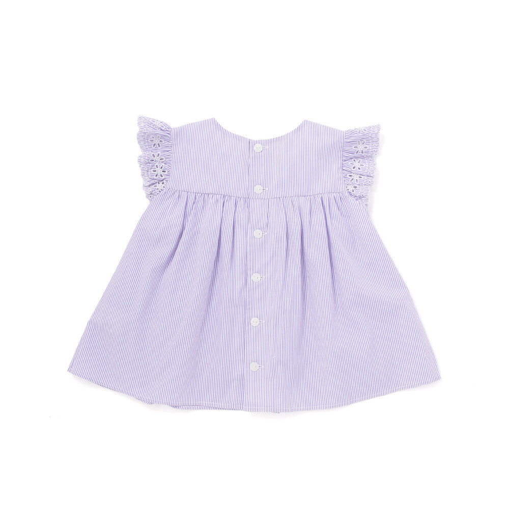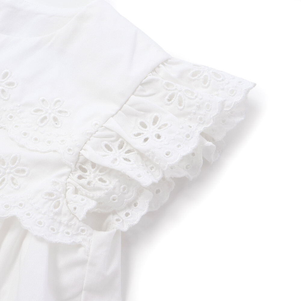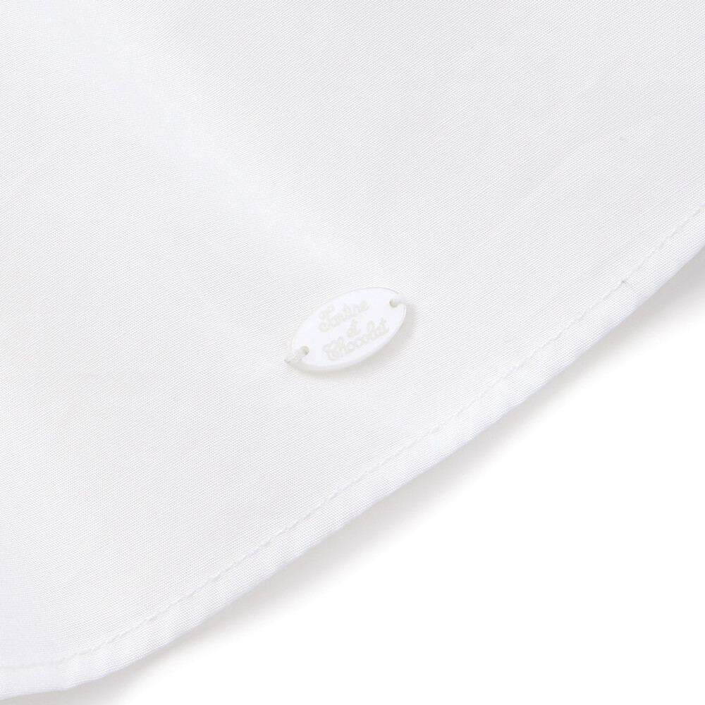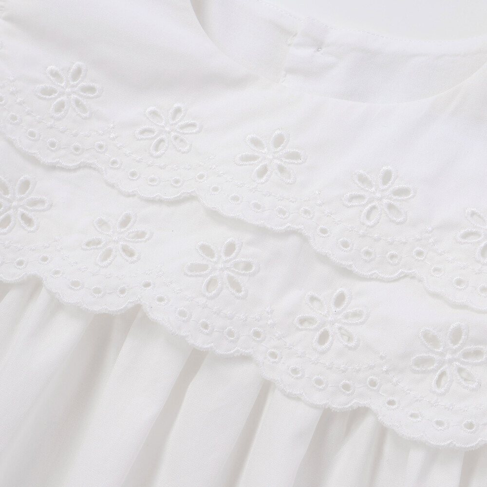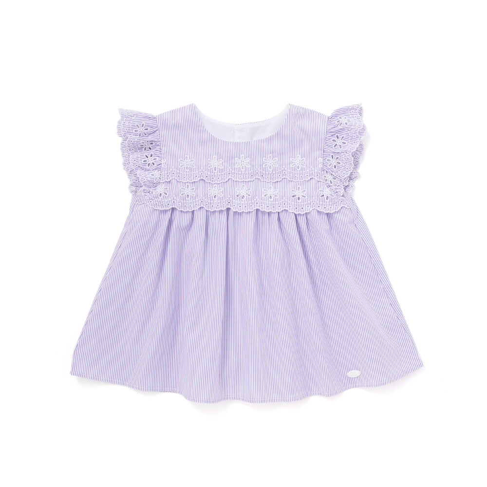 フリル袖と胸元のパンチングレースで2段にスカラップを施したデザインが上品な女の子用ブラウスです。