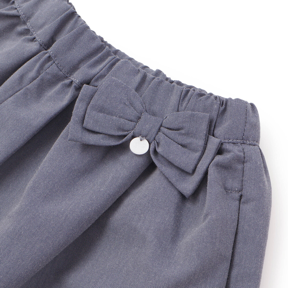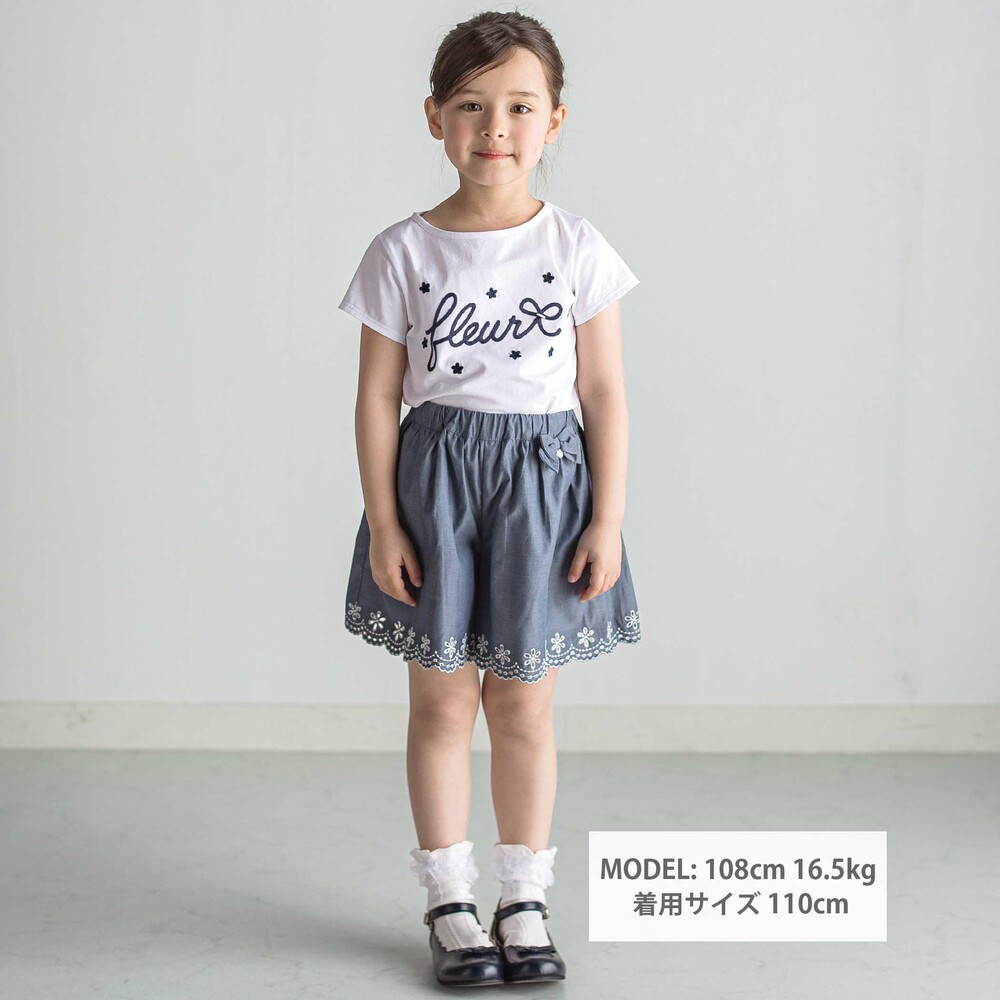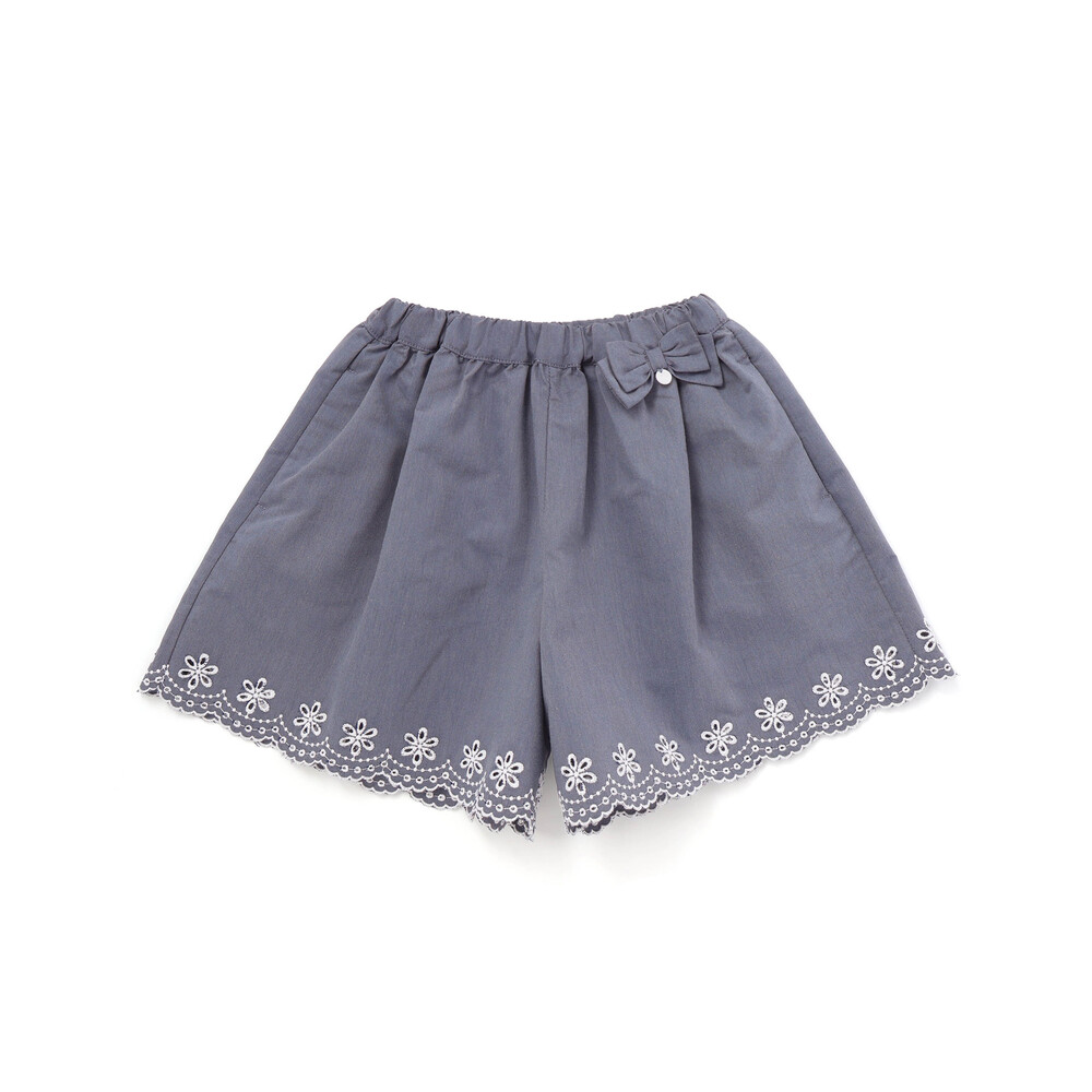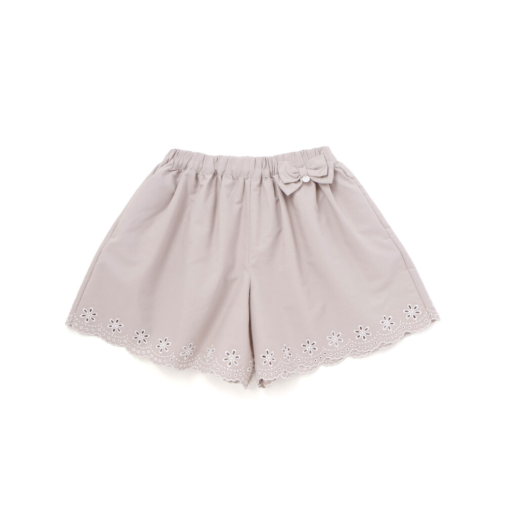 ウエスト部分にあしらわれたリボンとスカラップになった裾に刺しゅうを施したデザインが上品な女の子用ショートパンツです。