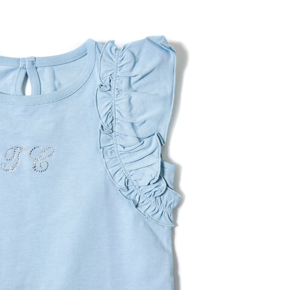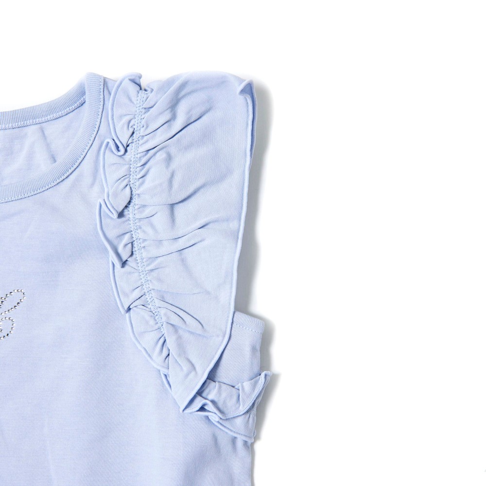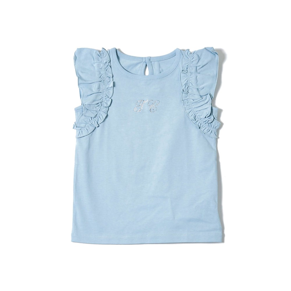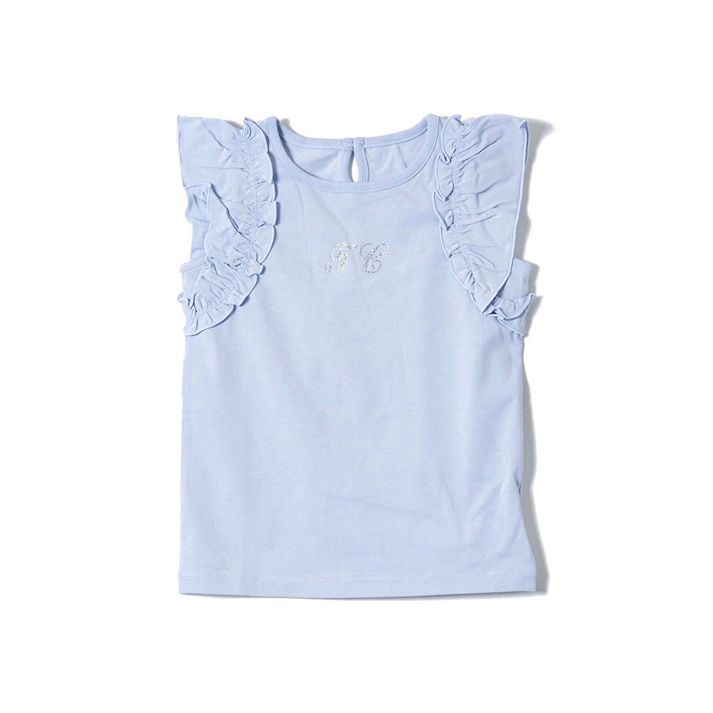 TCラインストーンをデザインポイントにした女の子用、袖フリルTシャツ。