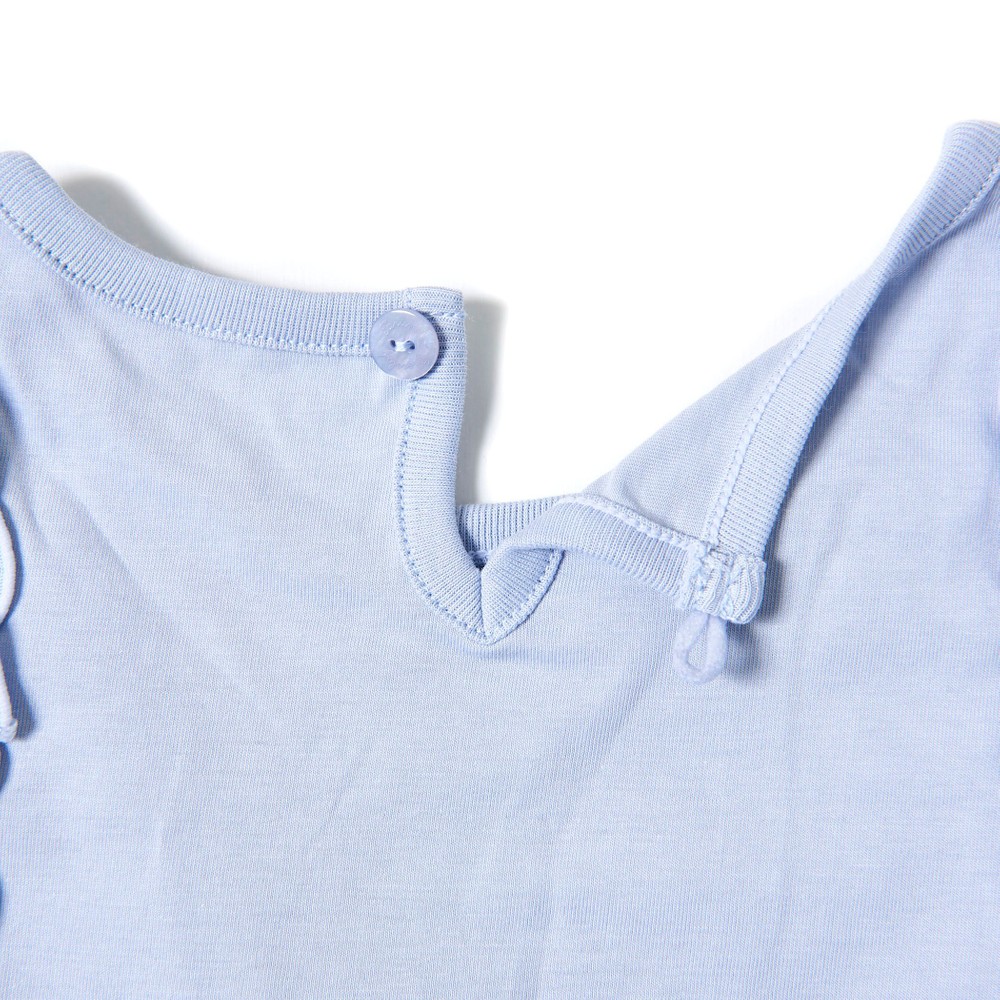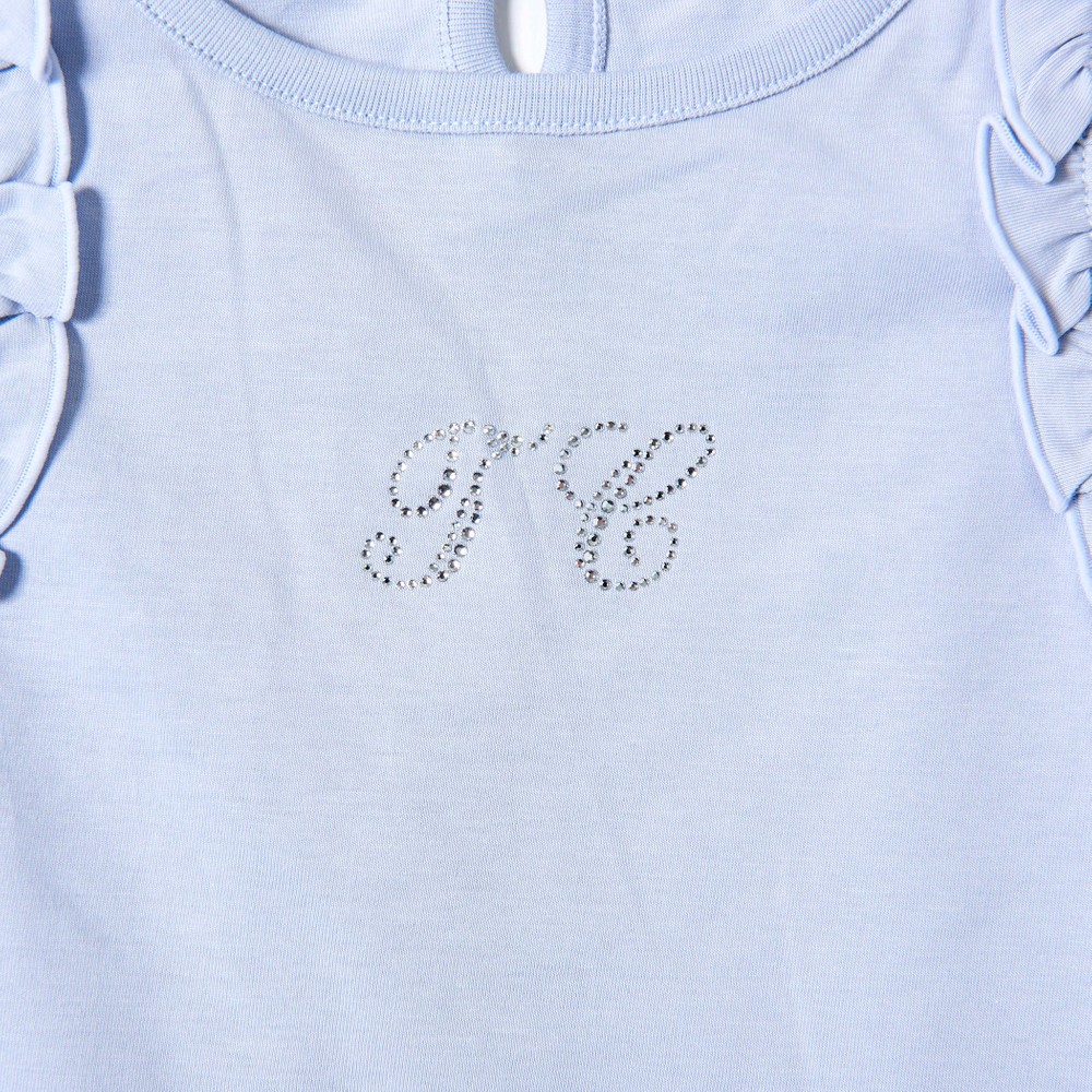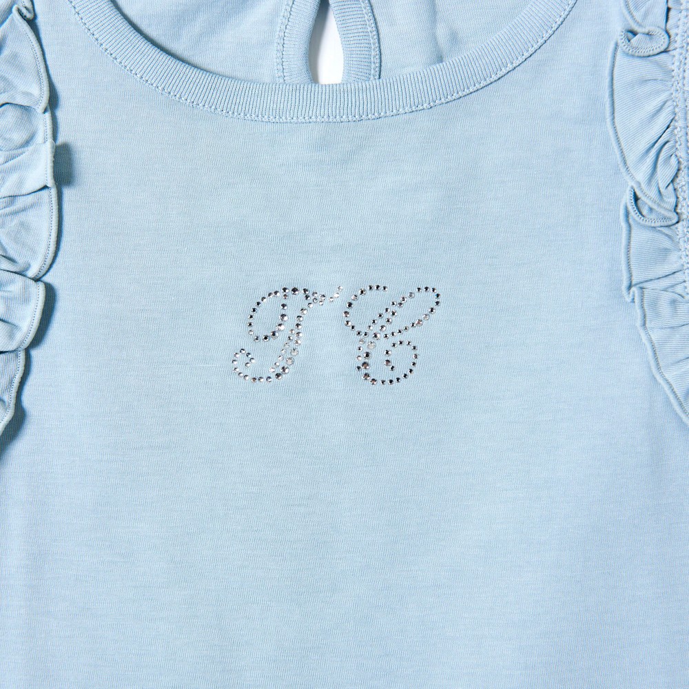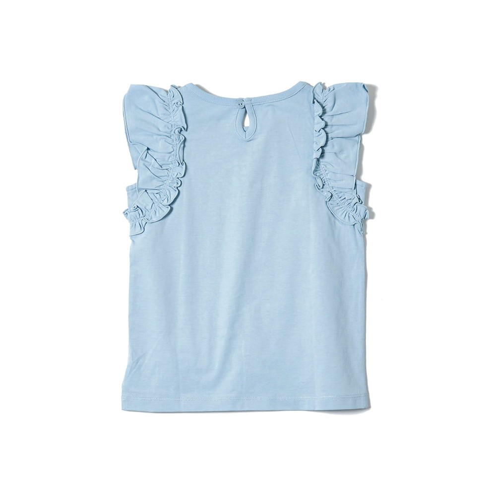 TCラインストーンをデザインポイントにした女の子用、袖フリルTシャツ。