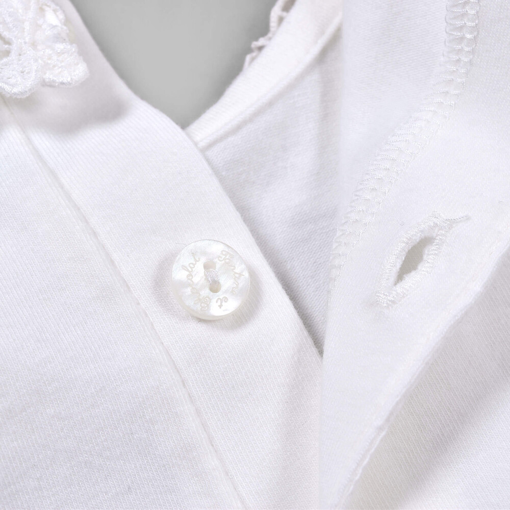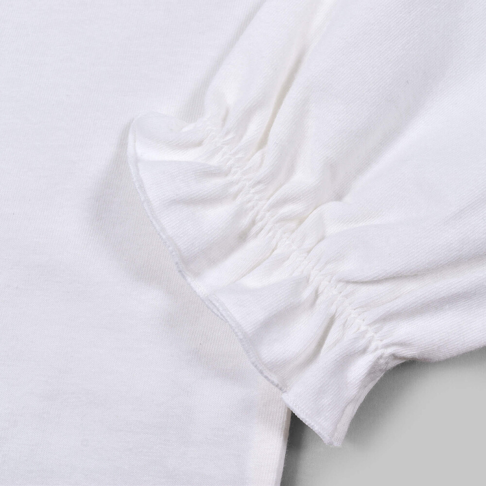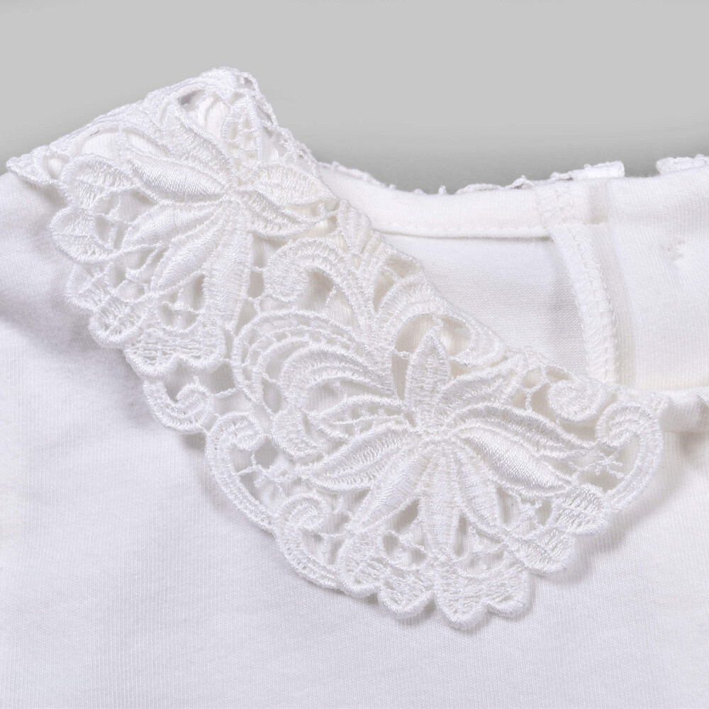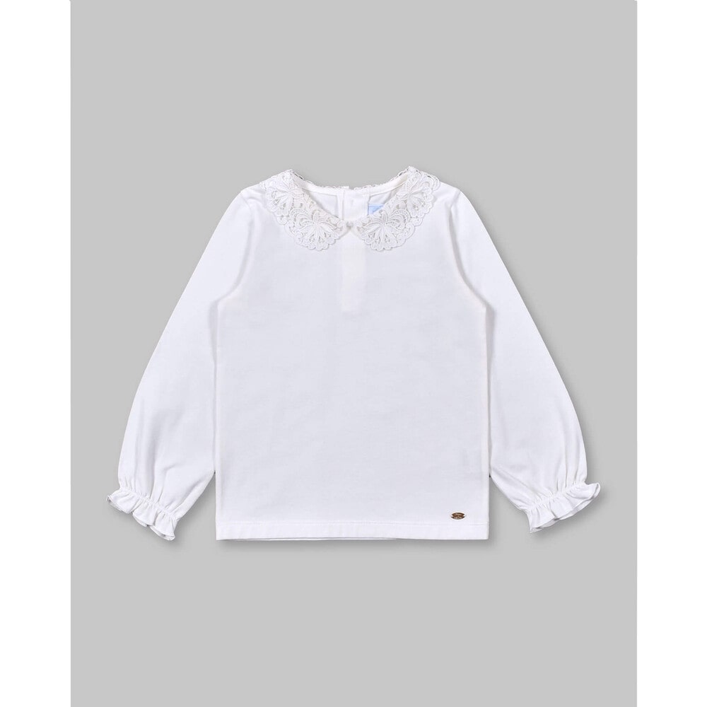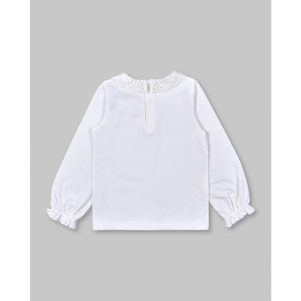 伸縮性のあるベアテン素材を使用したレース襟のついた長袖Tシャツ。