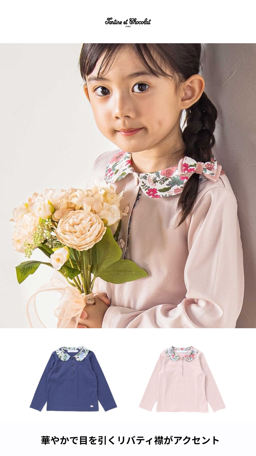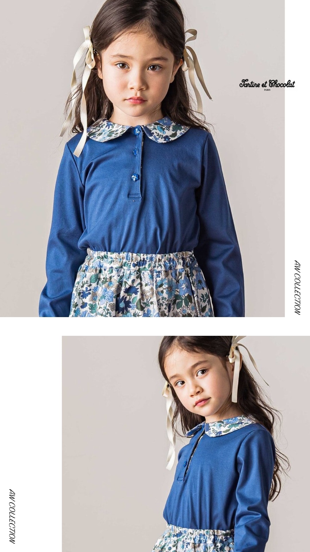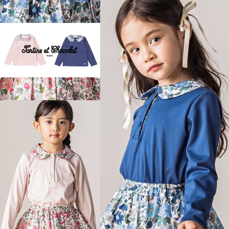 華やかで目を引くリバティ襟がアクセントの女の子用長袖Tシャツ。