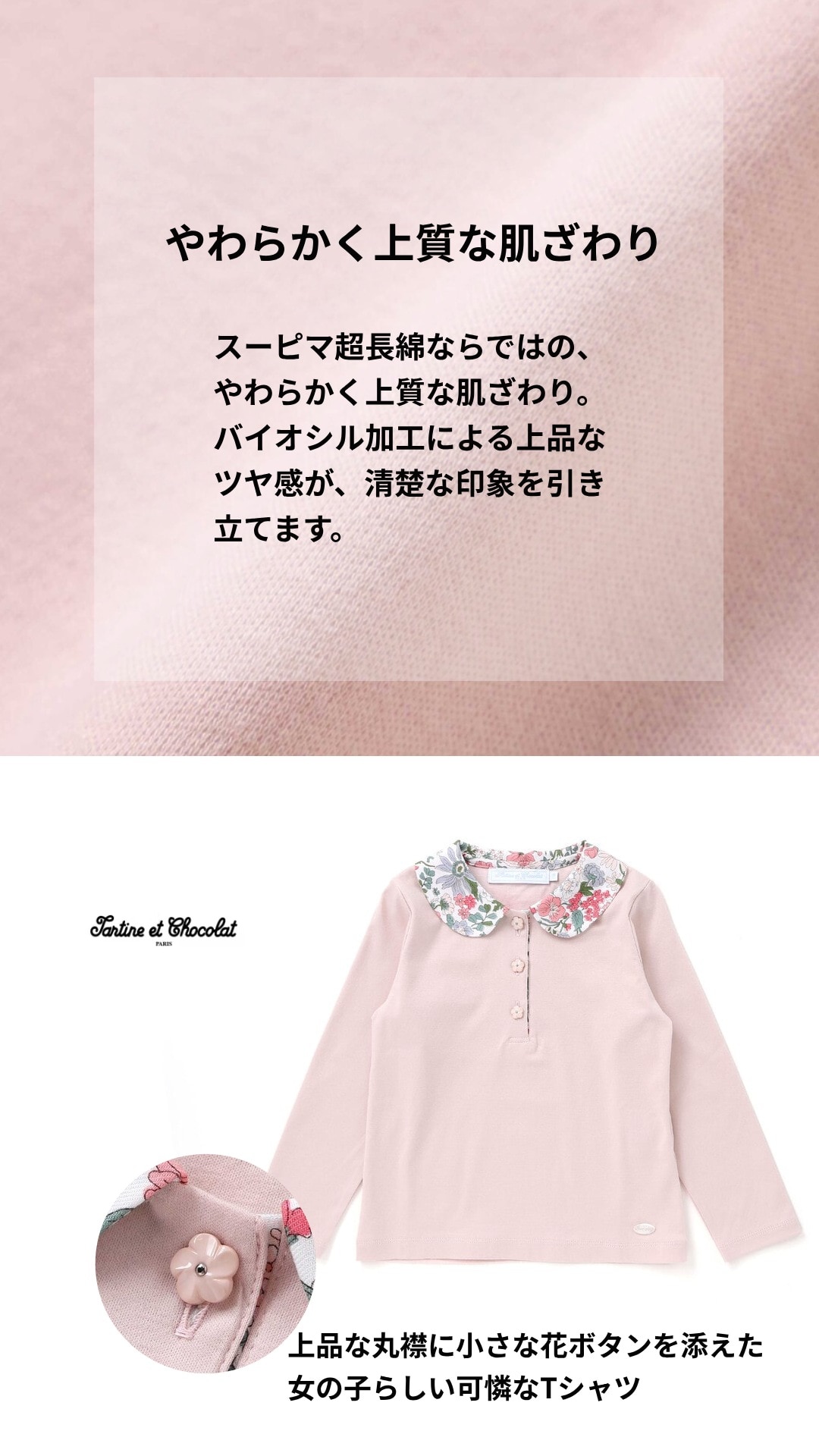 上品な丸襟に小さな花ボタンを添えた、女の子らしい可憐なTシャツです。