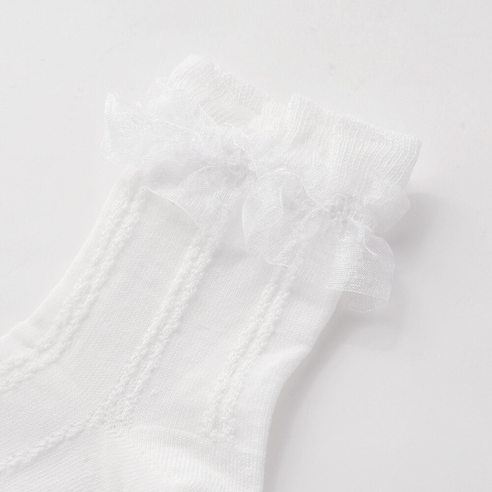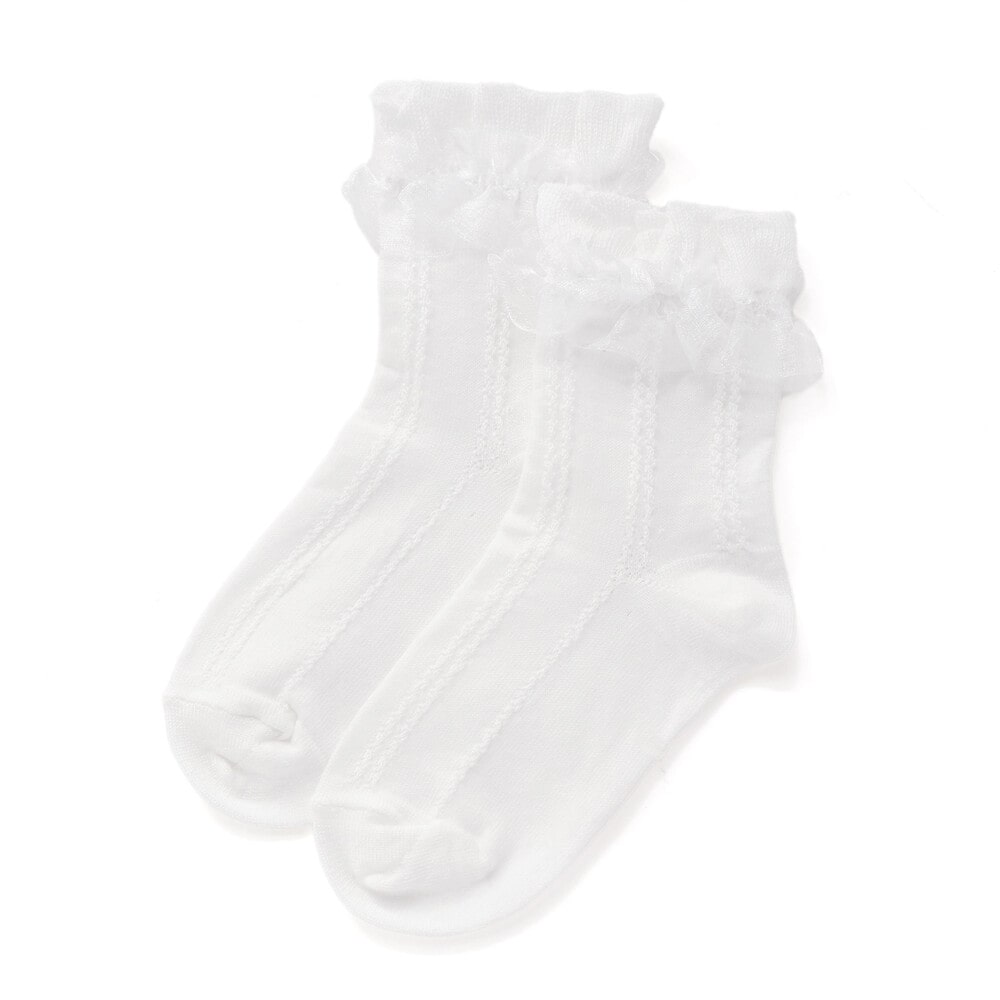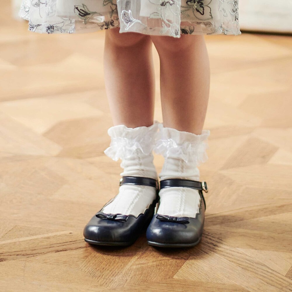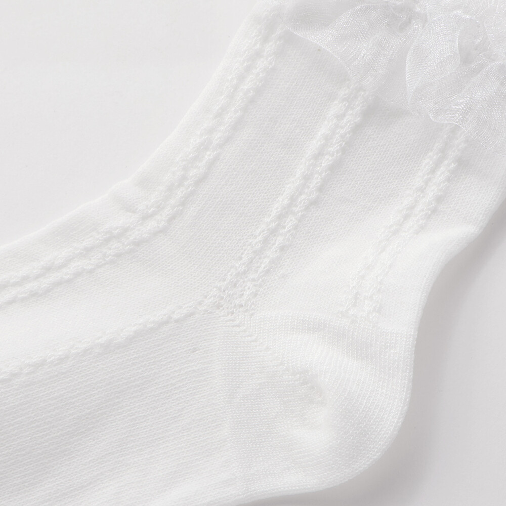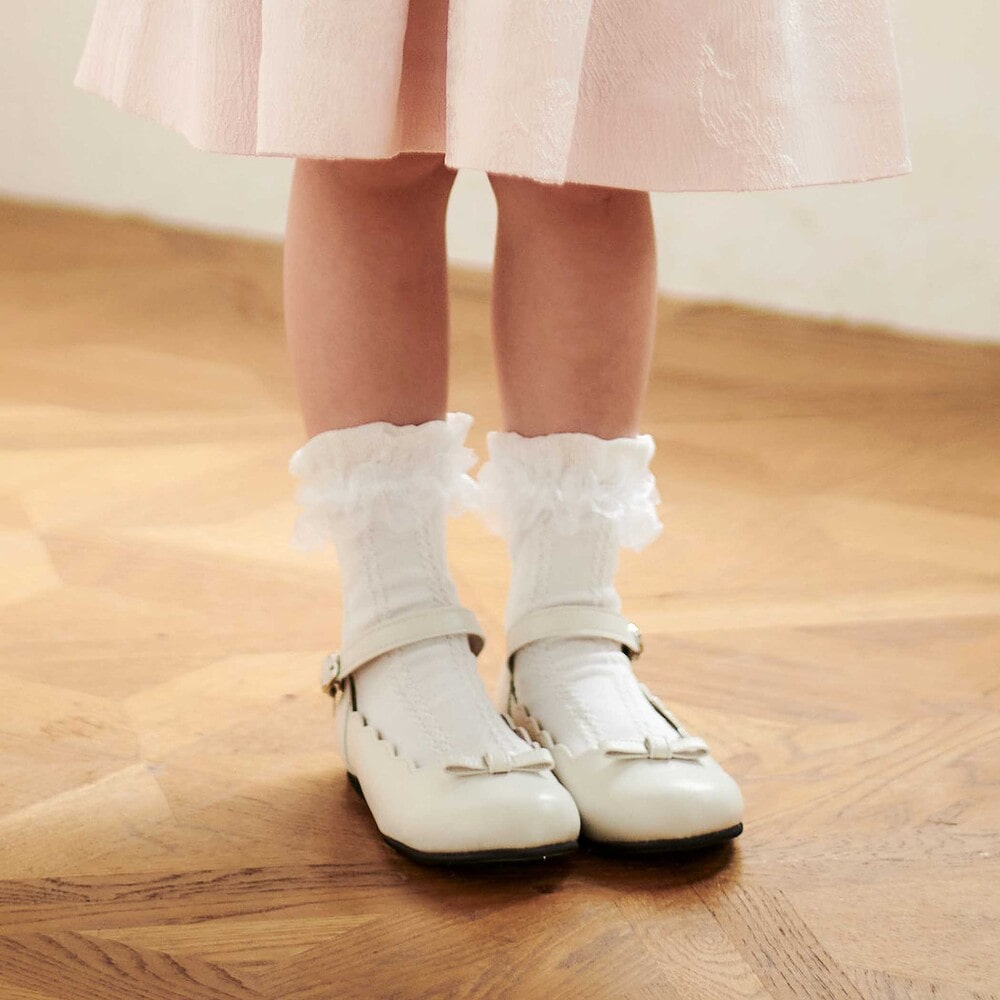 編み模様とフリルがフェミニンな印象を添え、フォーマルなシーンにもぴったりです。