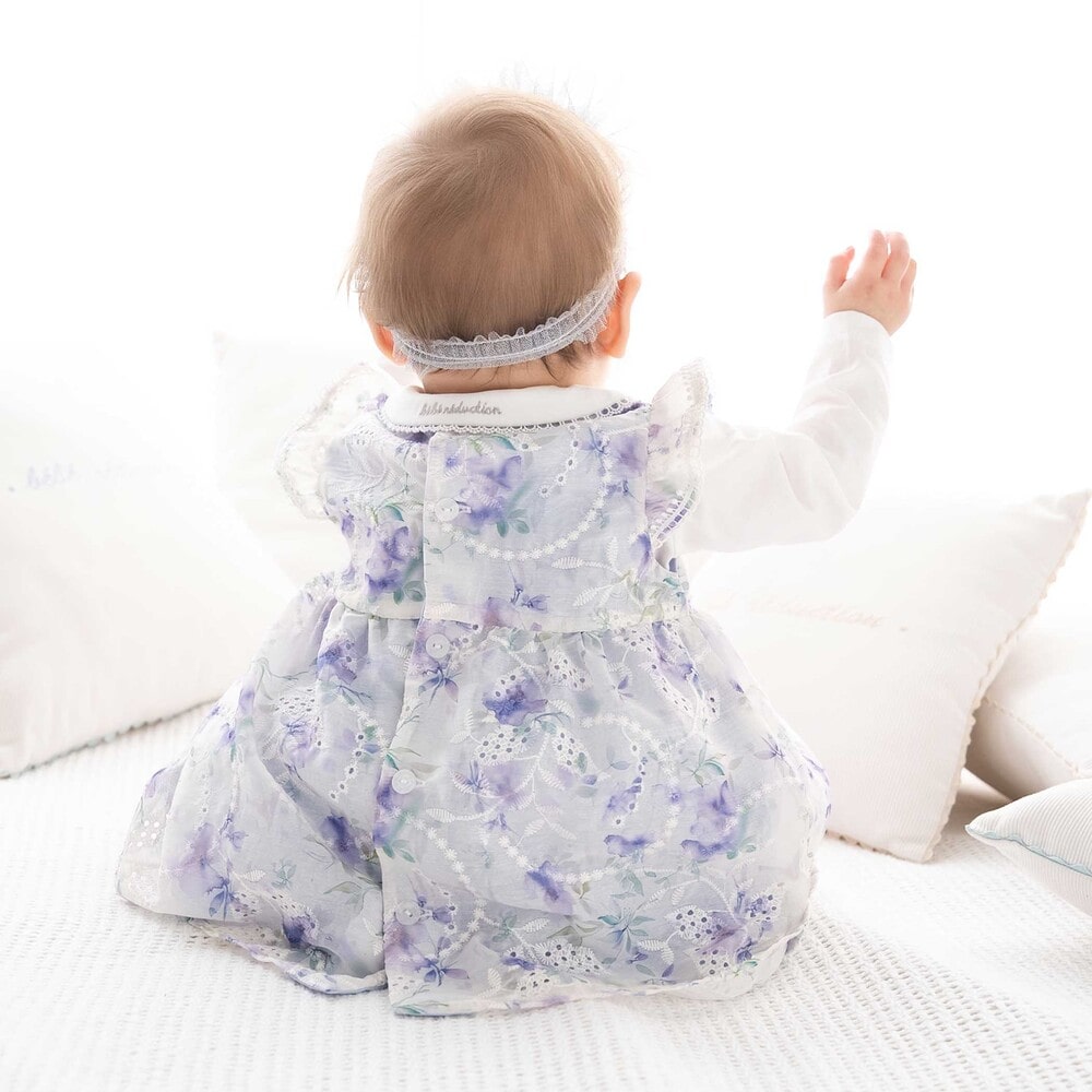 オーガンジー花柄とフリル袖の華やかワンピースと同色ブルマの女の子ベビー用2点セット。