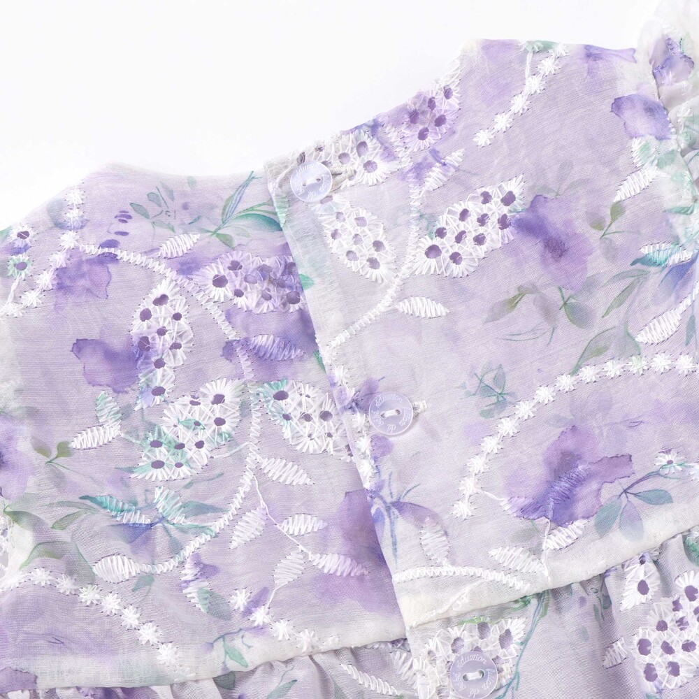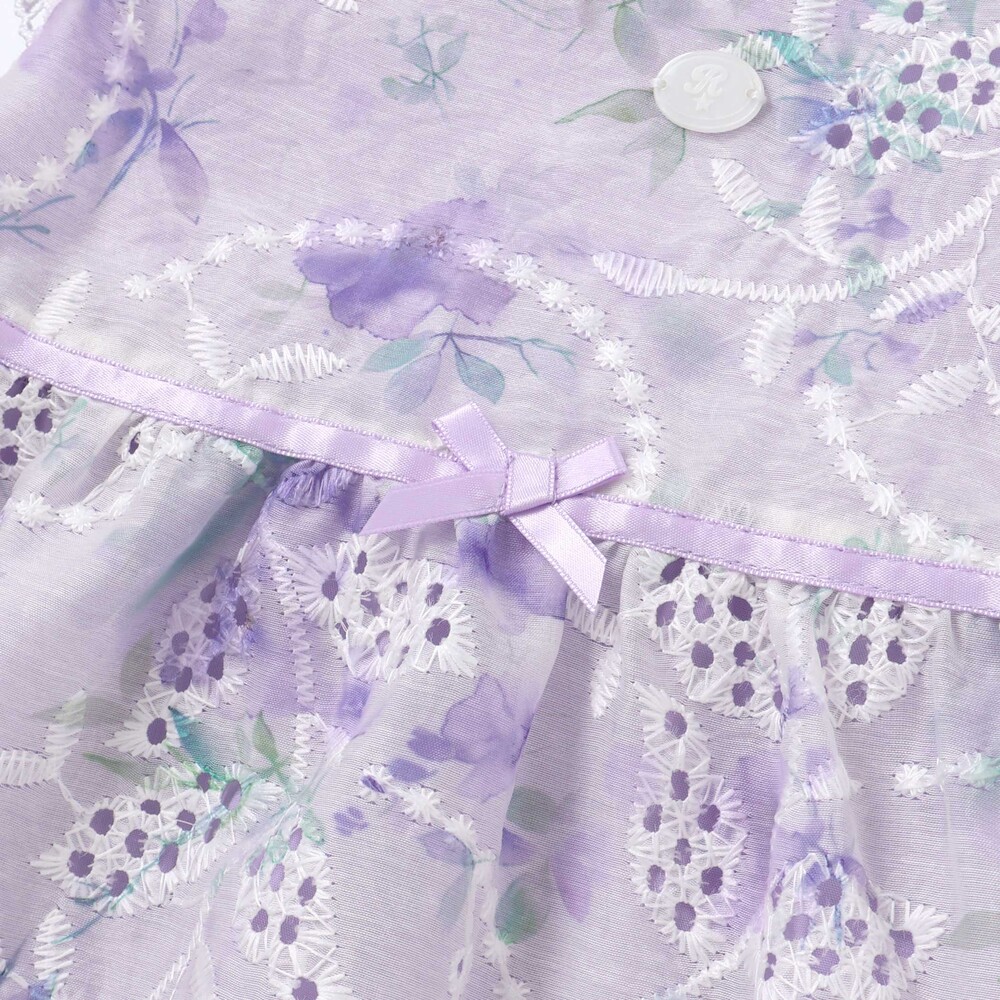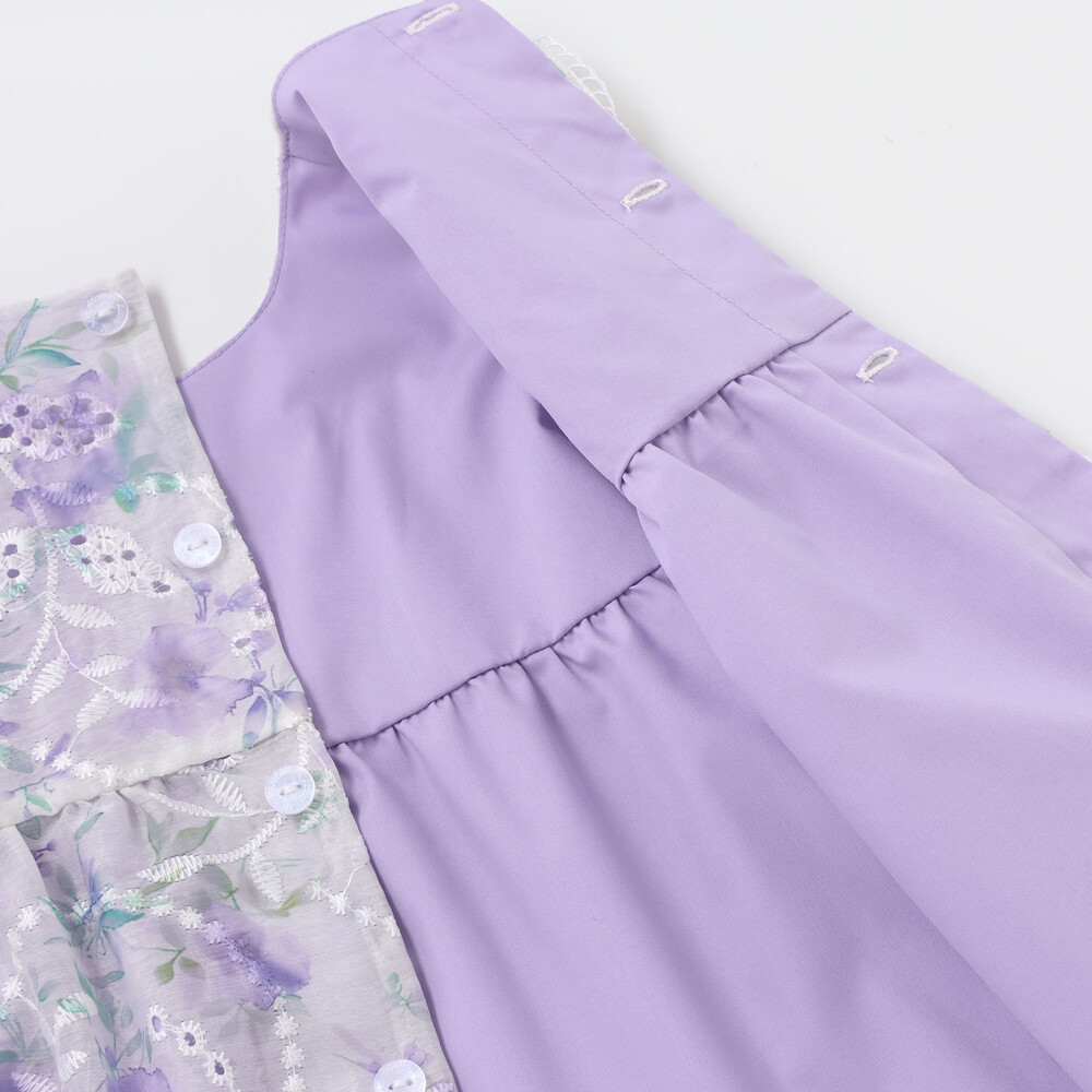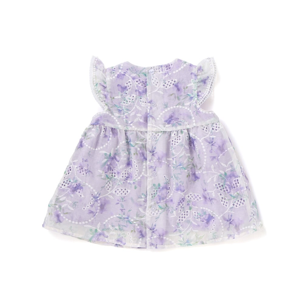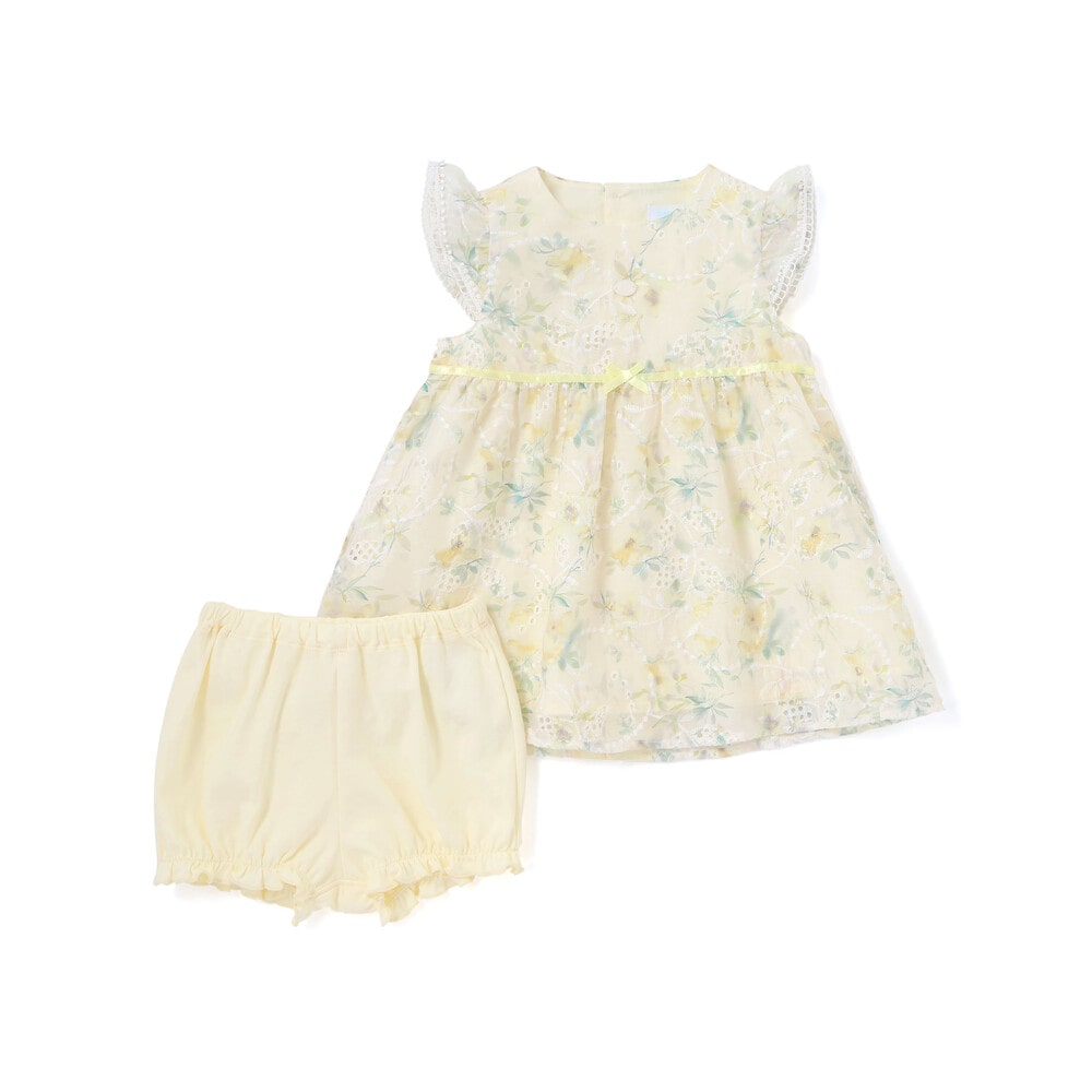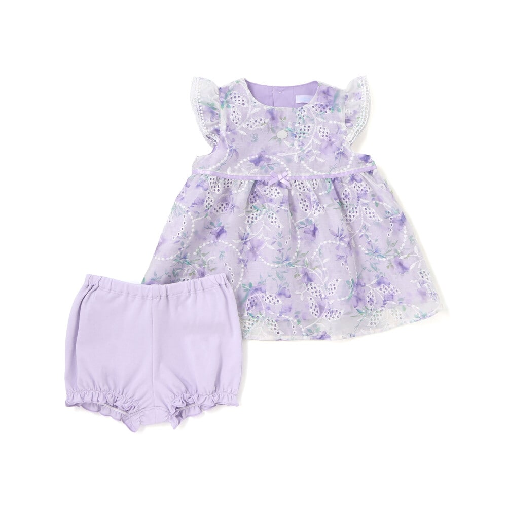 リーフ刺しゅう入りのオーガンジーに花柄プリントが施されたワンピースと同色ブルマの女の子用2点セットです。