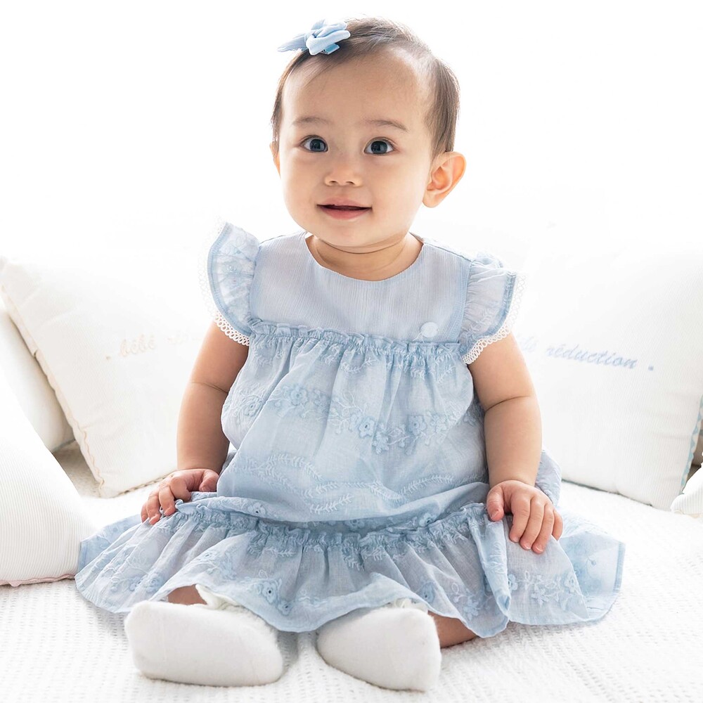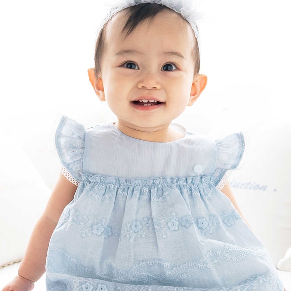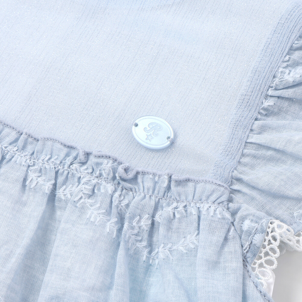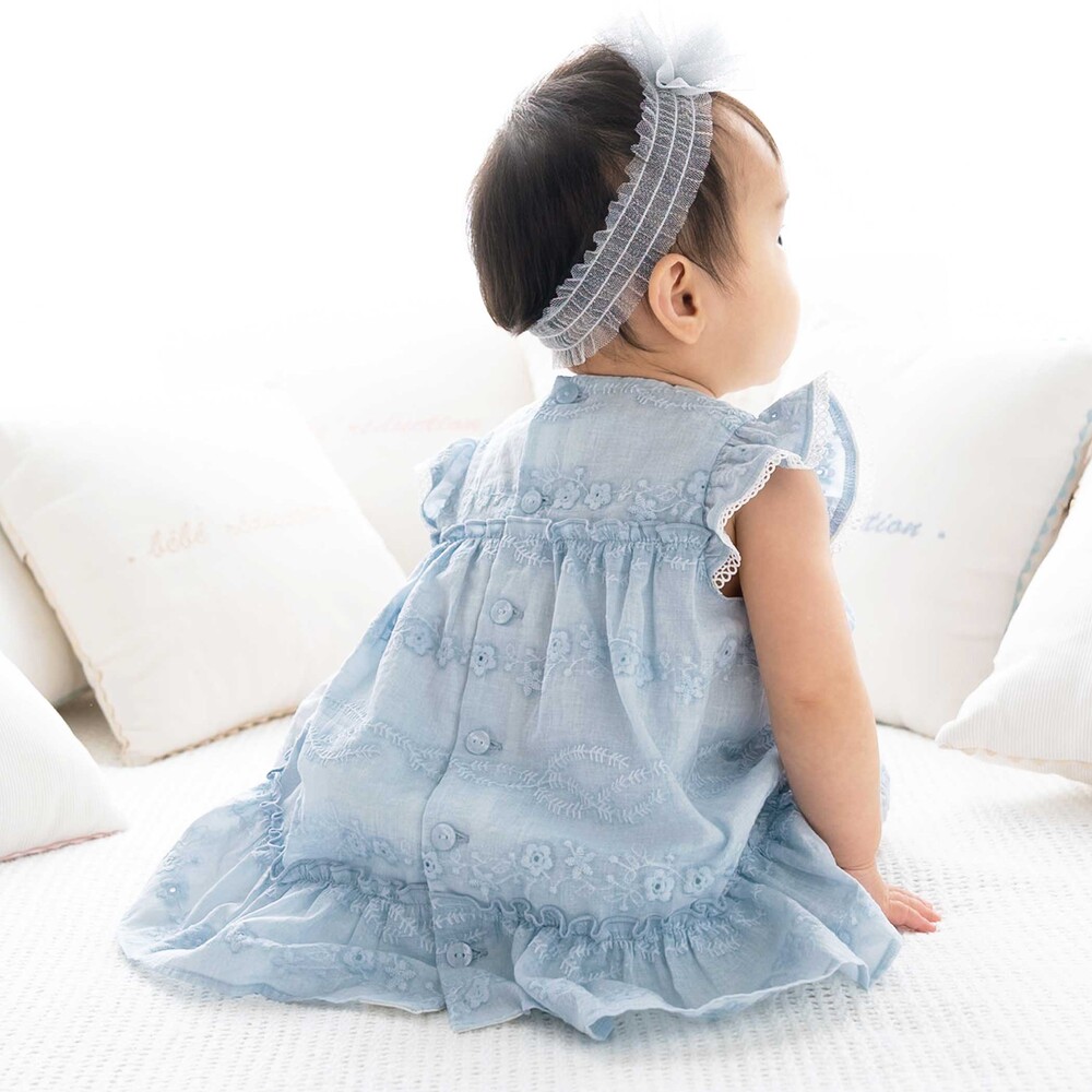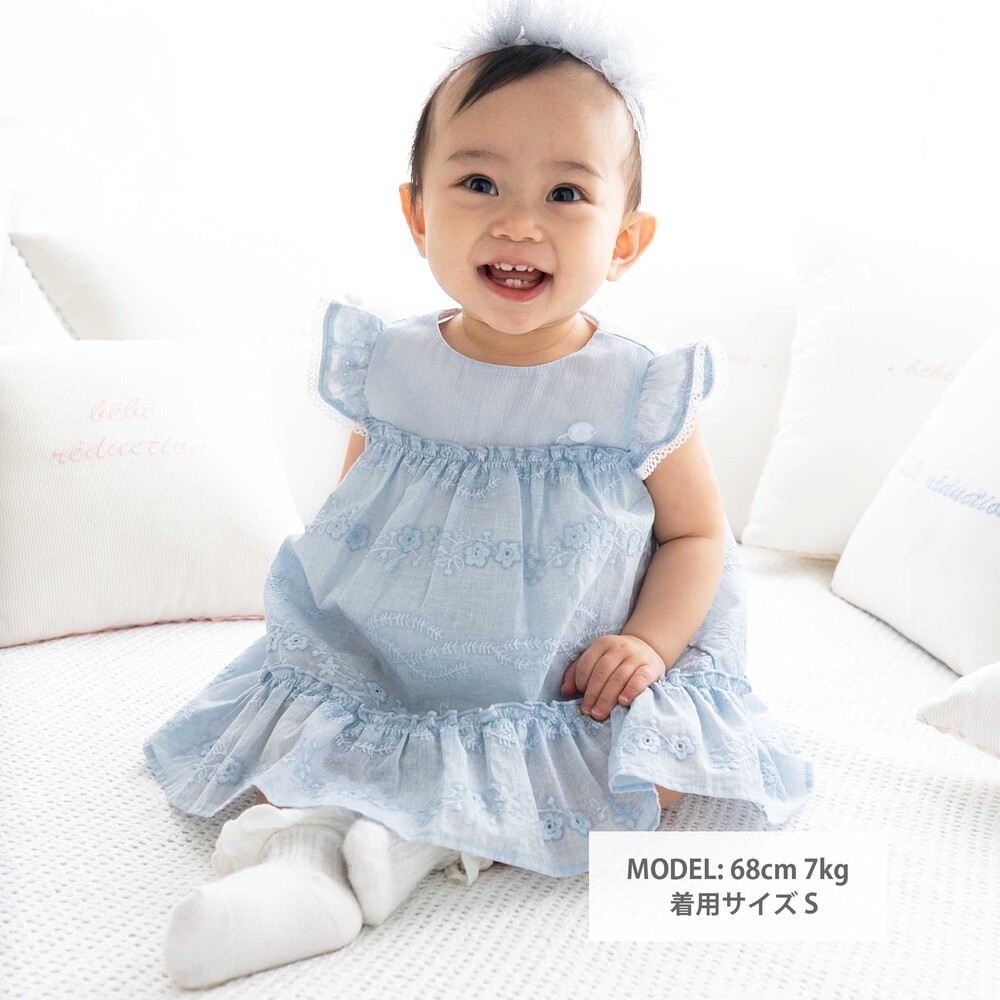 切り替え部分には繊細なレースを配し、裾からのぞくスカラップ状のディテールが、小さなレディのような気品あるシルエットを演出します。