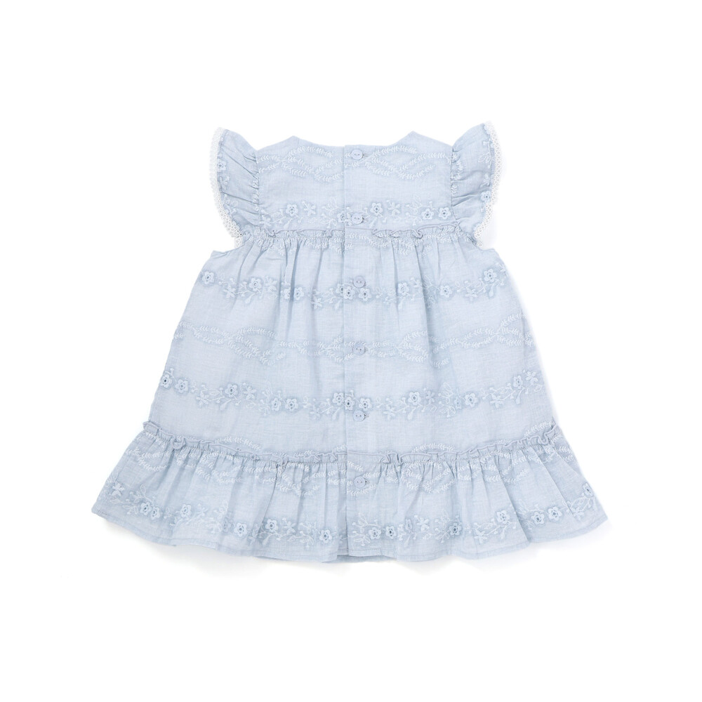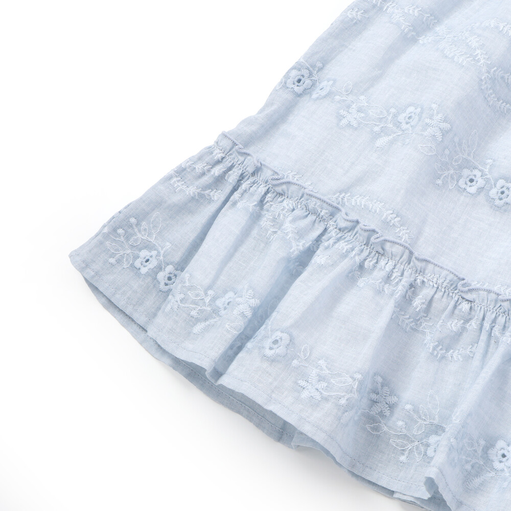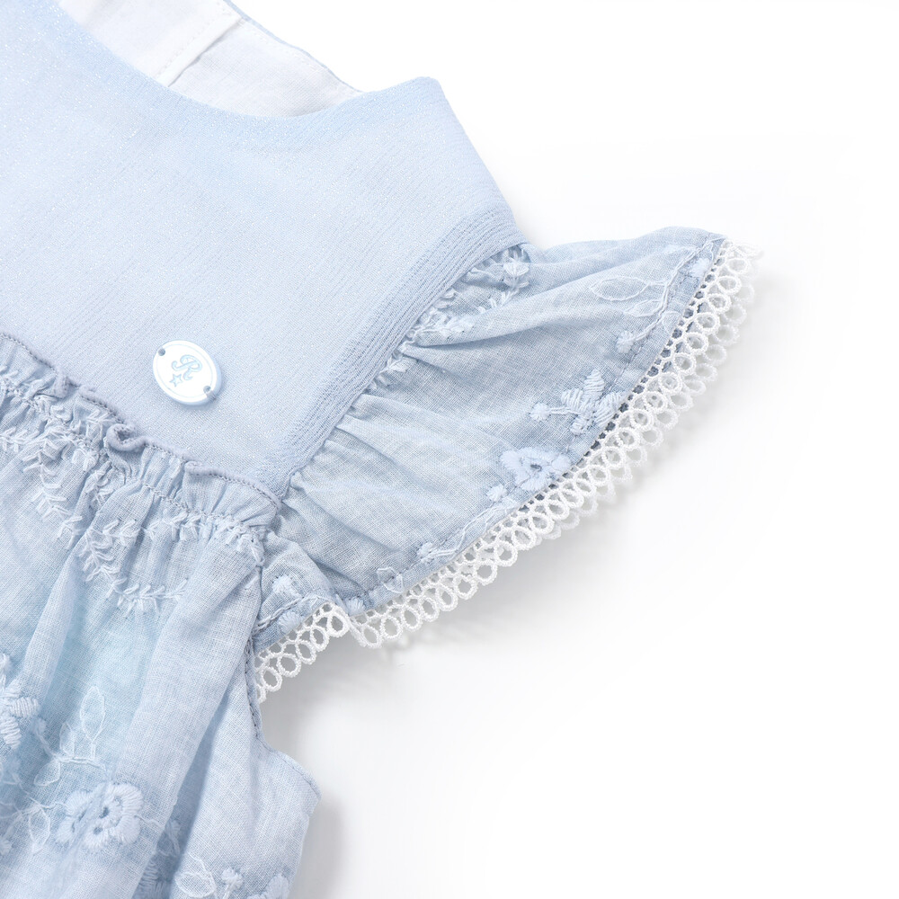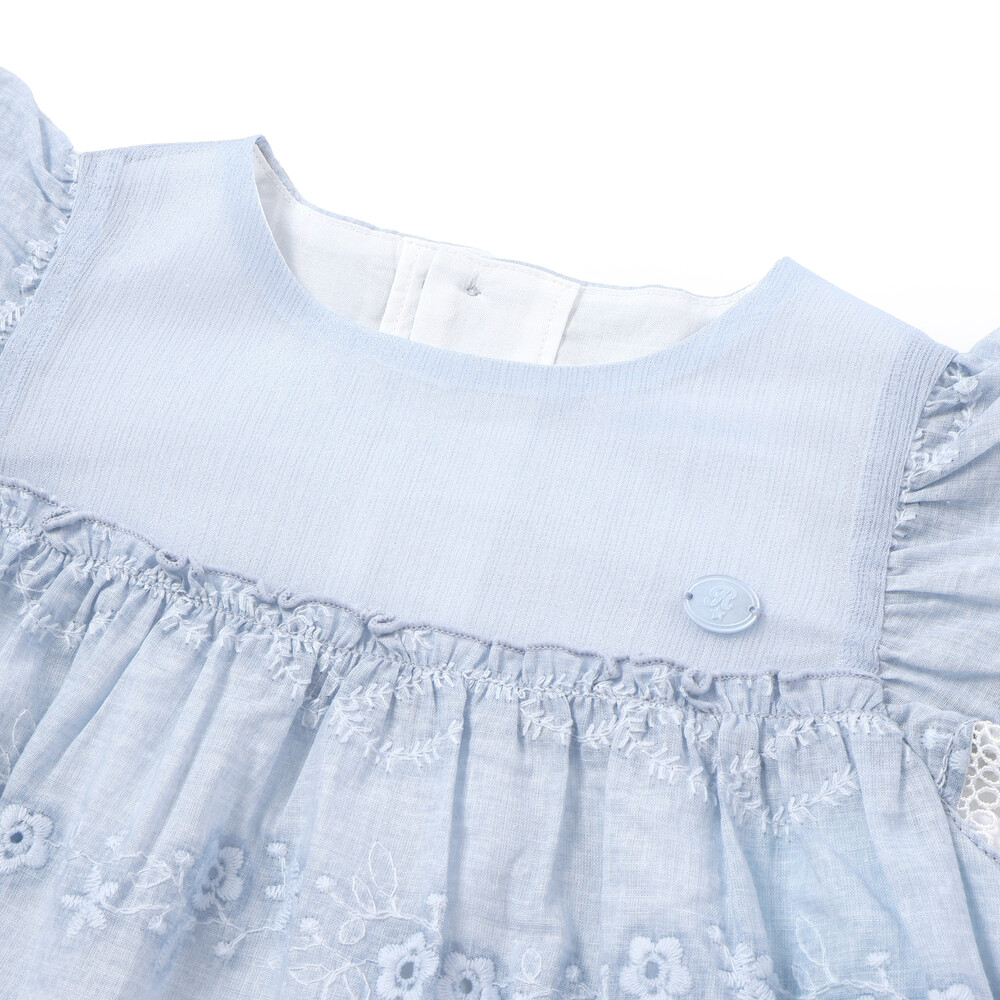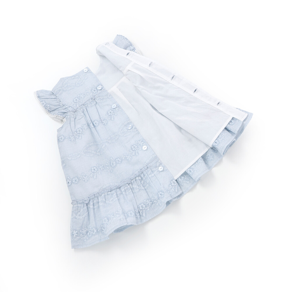 切り替え部分には繊細なレースを配し、裾からのぞくスカラップ状のディテールが、小さなレディのような気品あるシルエットを演出します。
