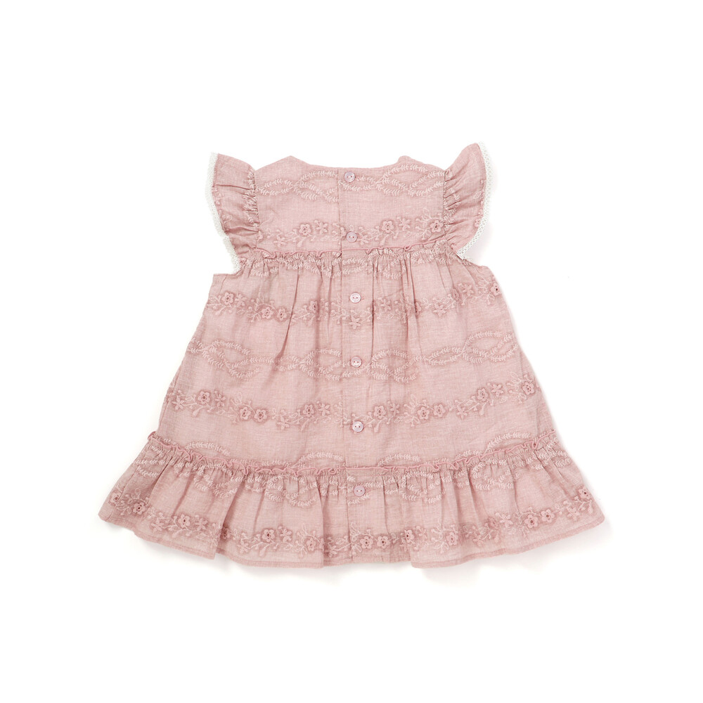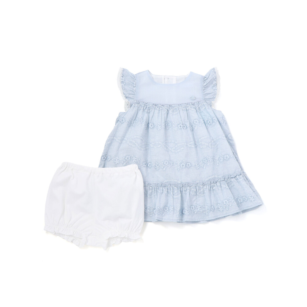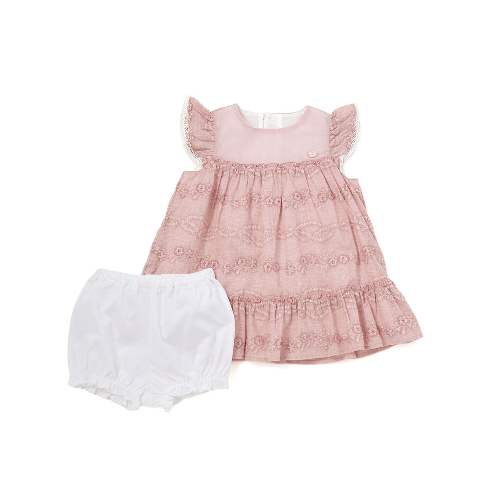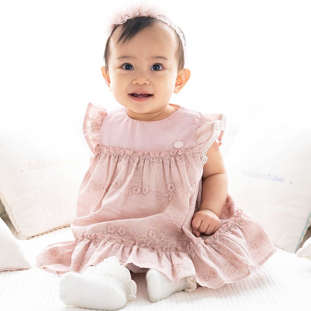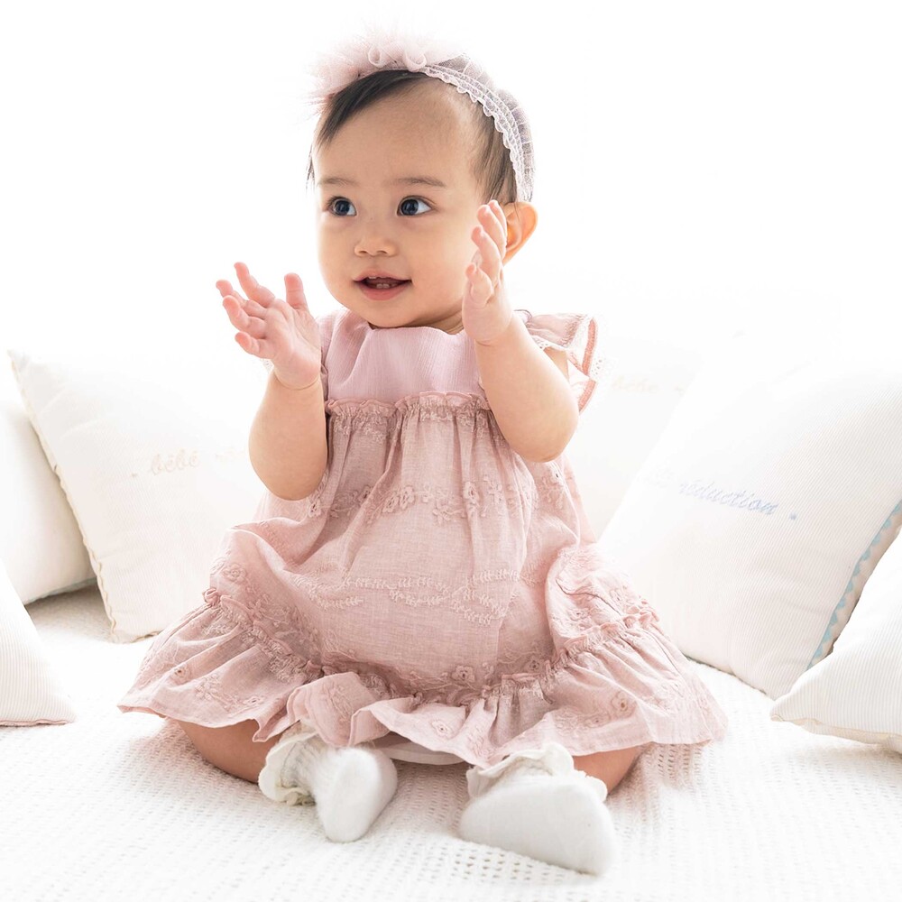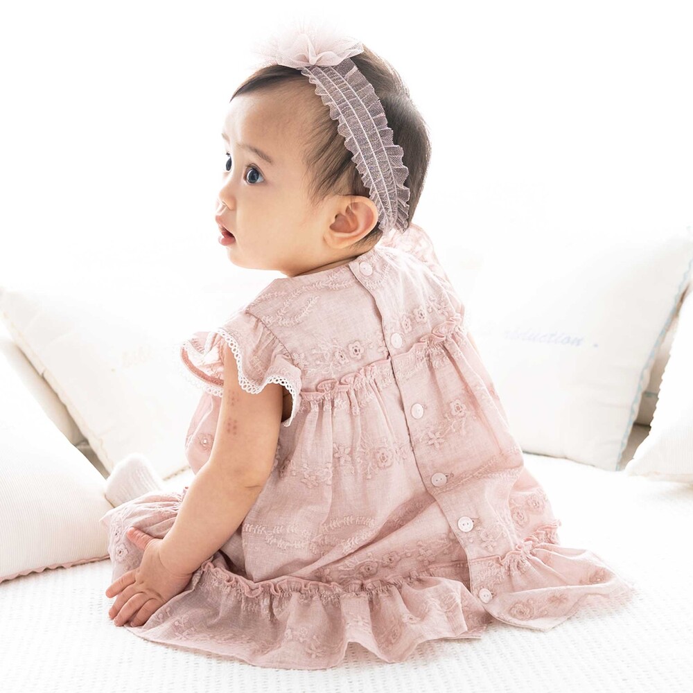 綿レースの華やかワンピースと同色ブルマがセットになったの女の子ベビー用アイテム。