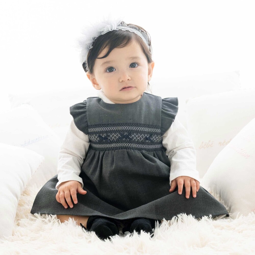 繊細なスモッキング刺しゅうが印象的な女の子用ジャンパースカート。