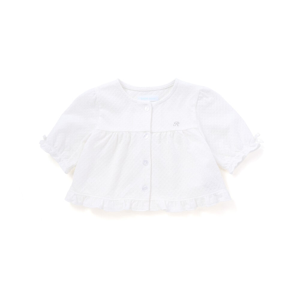 キラキラ光るブライト糸が入ったレーシー天竺素材の女の子用7分袖ボレロカーディガンです。