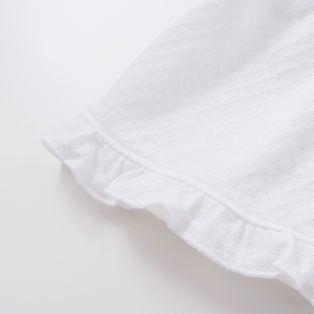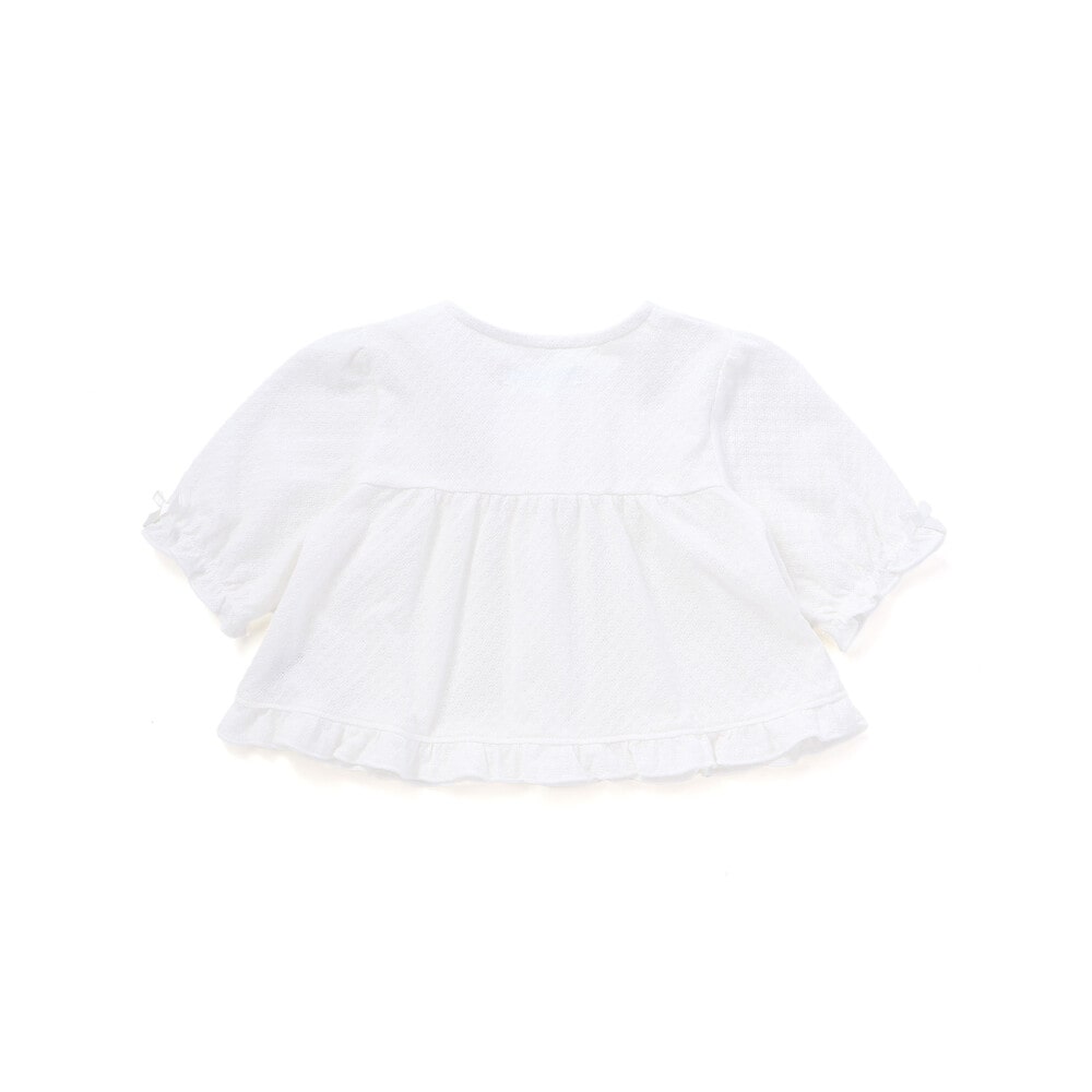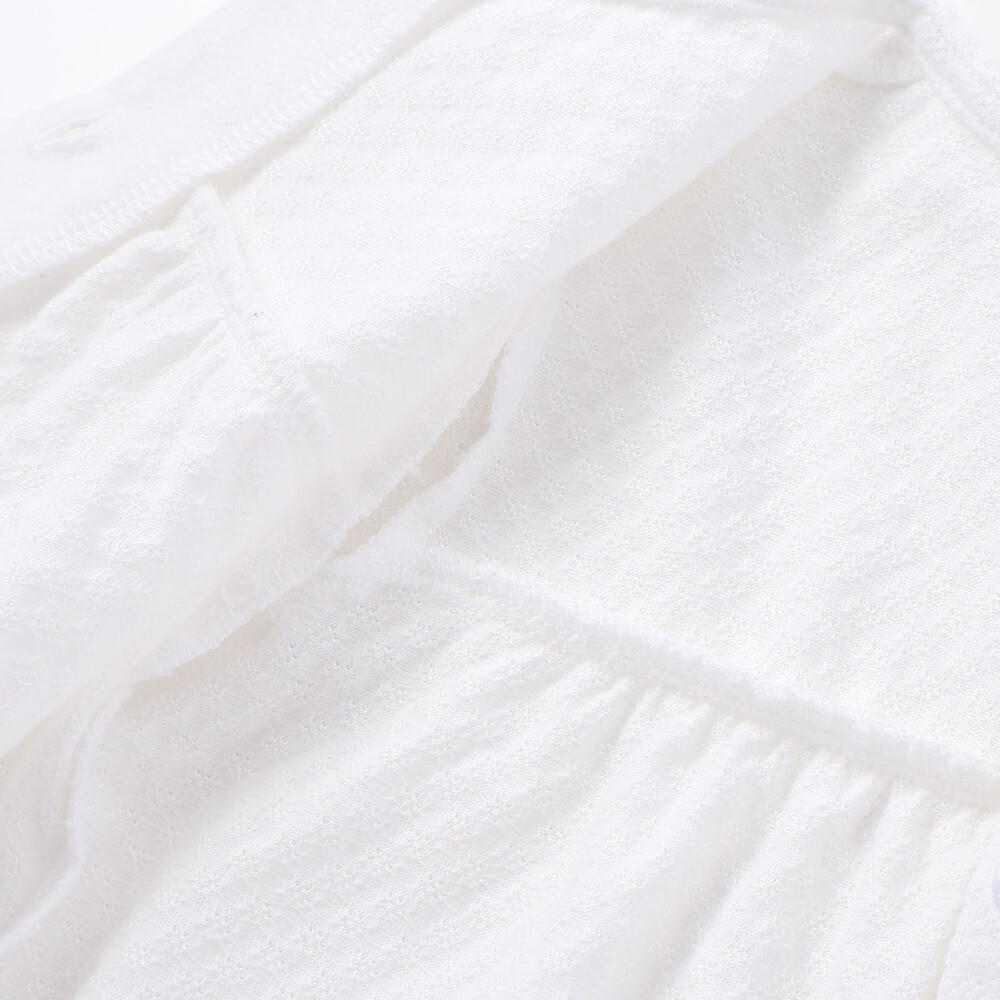 裾と袖口がフリルになった可愛さを引き立てるデザインです。