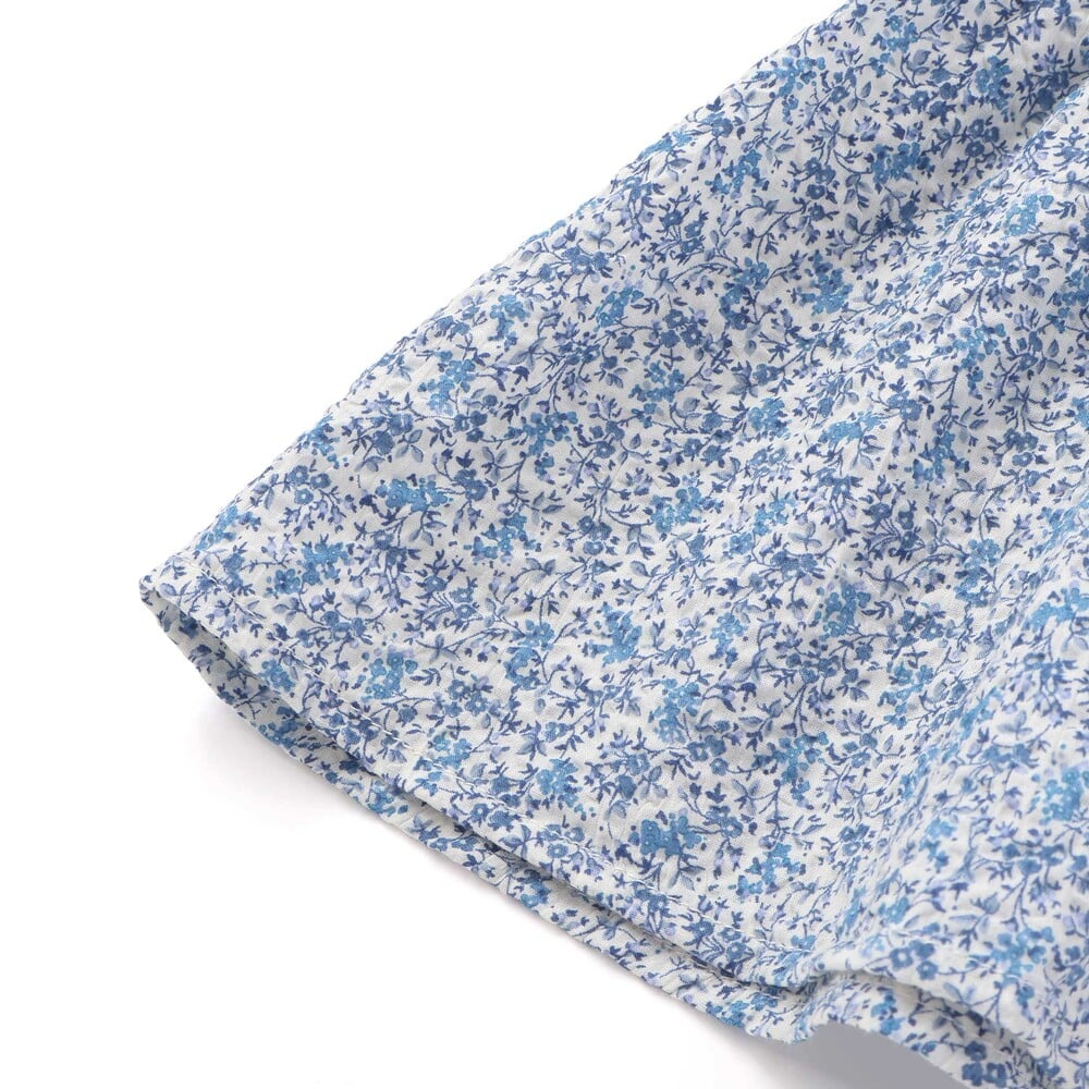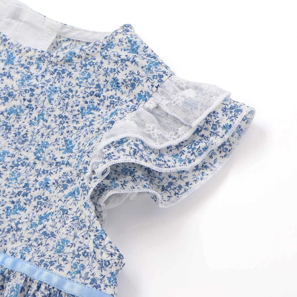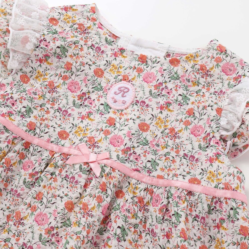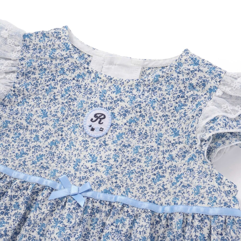 袖のフリル上側には、フラワー刺しゅうの入ったレーシーなシフォン生地をあしらい、2重のフリルで愛らしい表情をプラス。