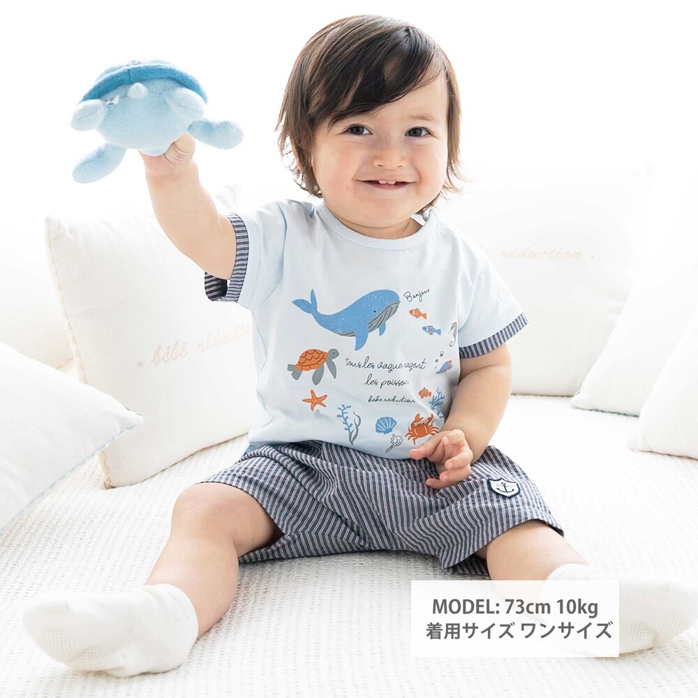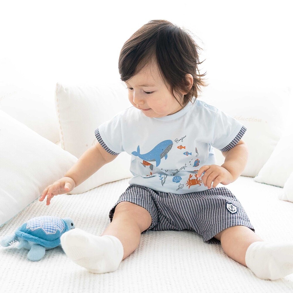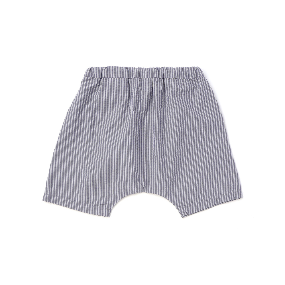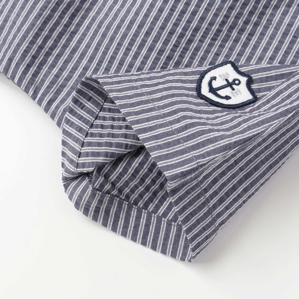 爽やかなネイビーのストライプが映える、マリンテイストな男の子ベビー用ショートパンツです。