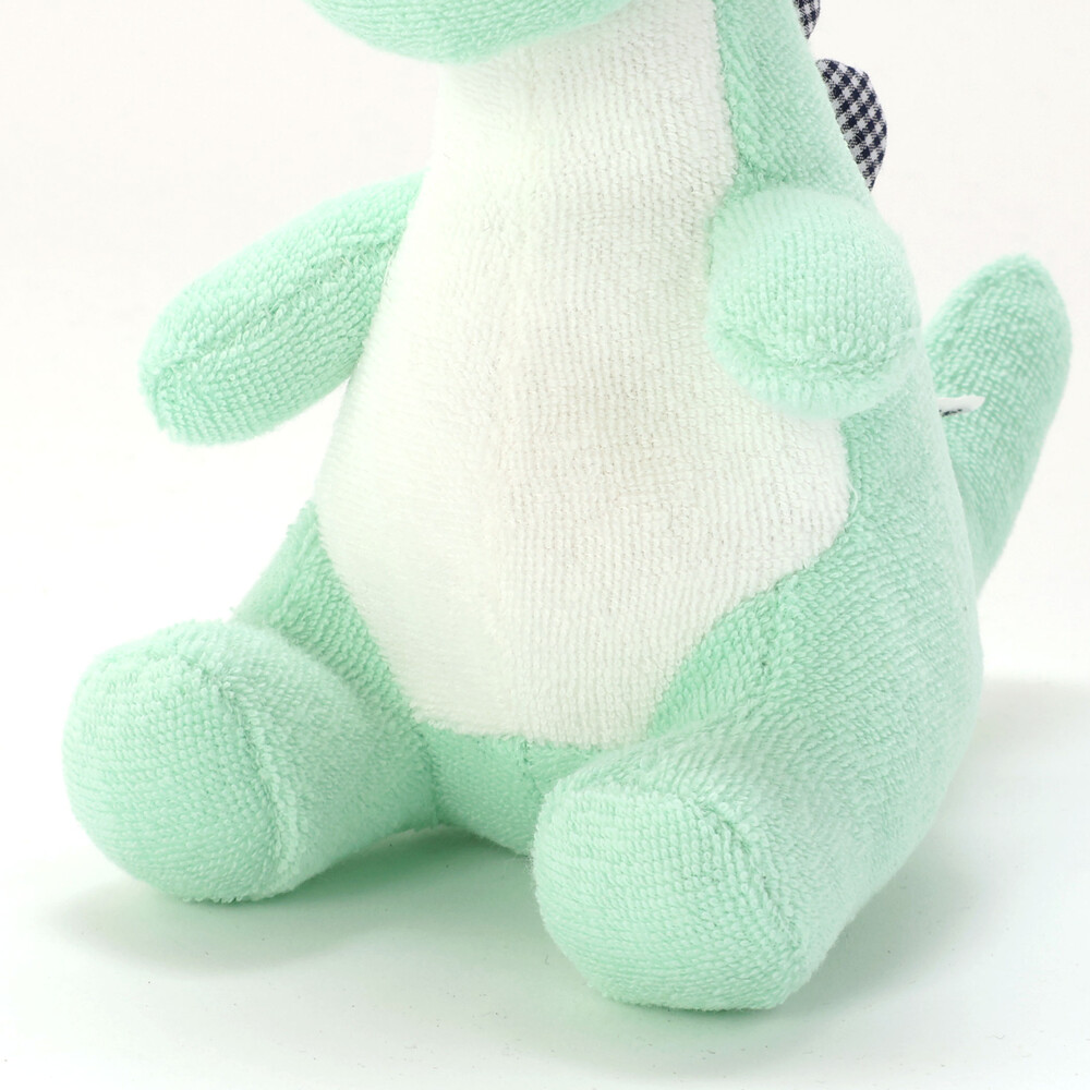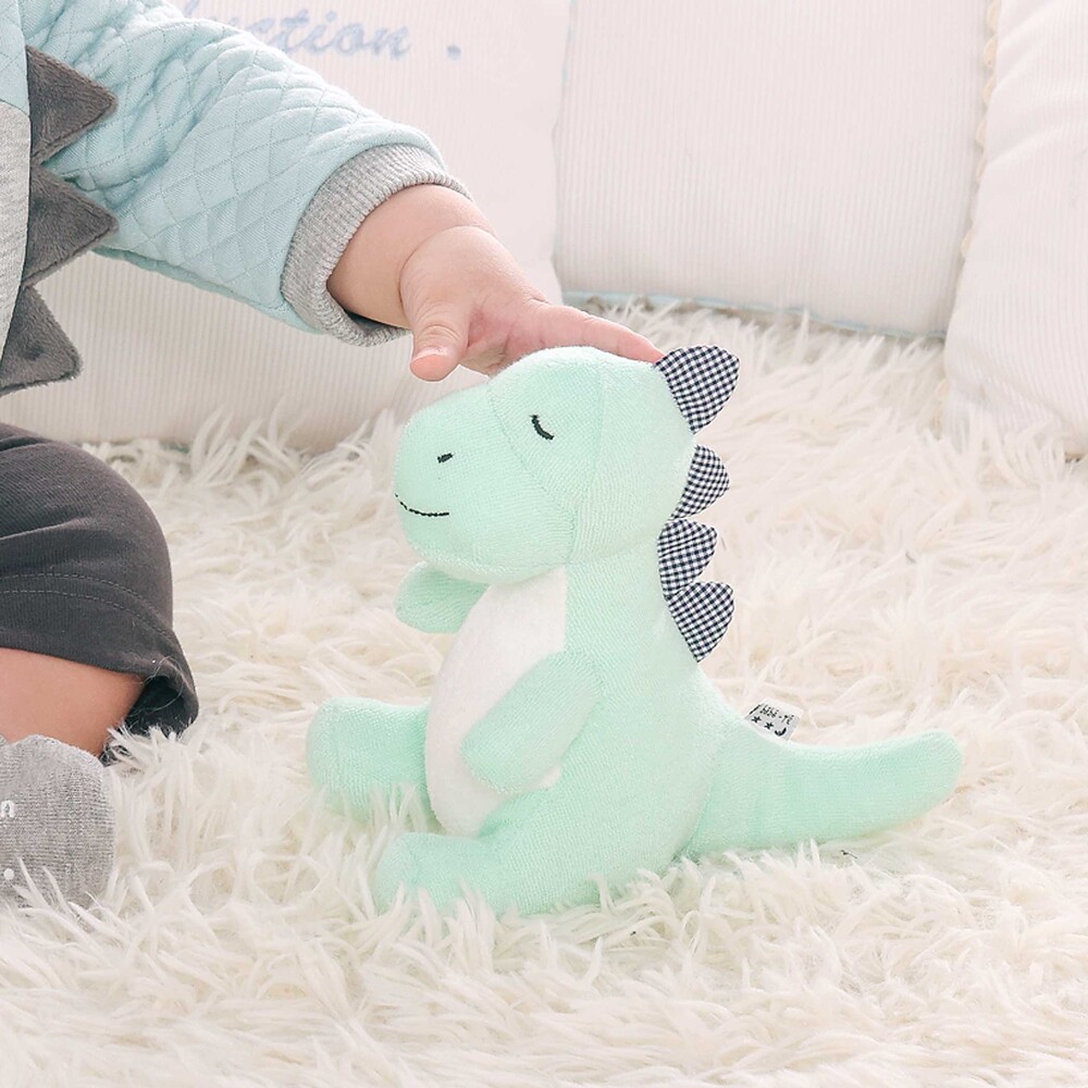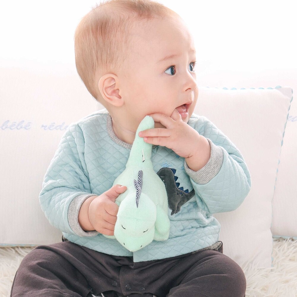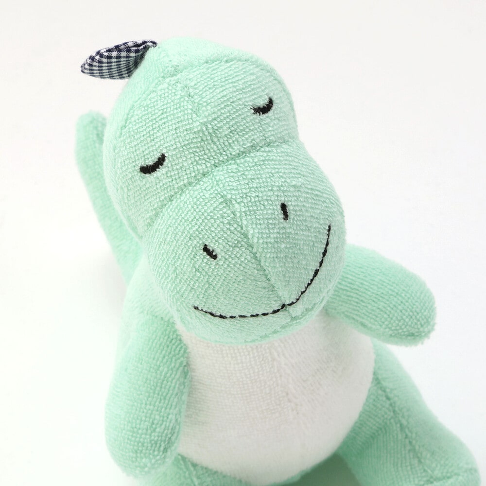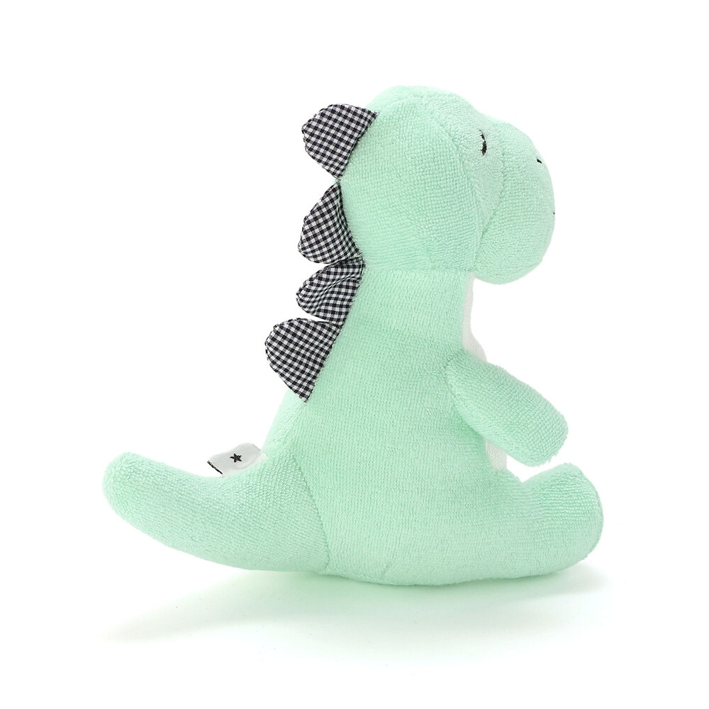 柔らかい質感で赤ちゃんに安心感を与える恐竜の形のガラガラ(ラトル)です。