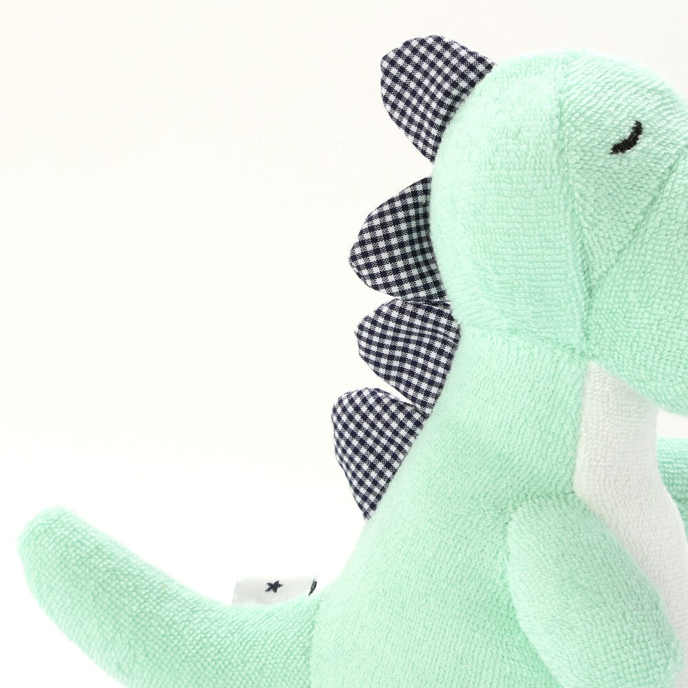 ギンガムチェックの背びれが可愛い、恐竜モチーフの男の子用ガラガラ。
