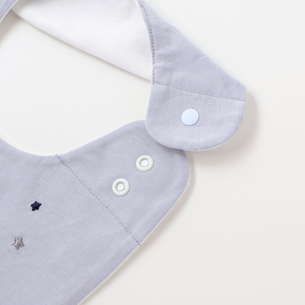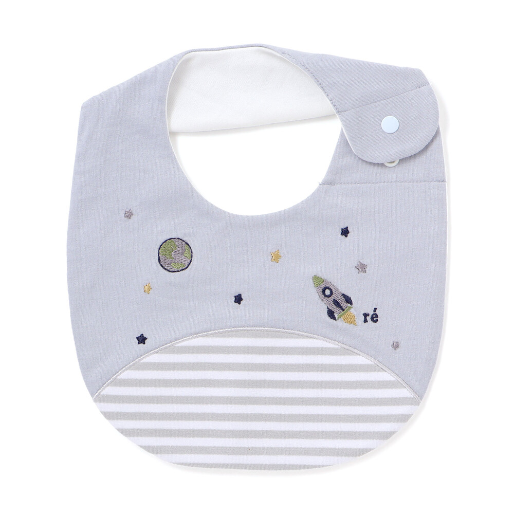 宇宙モチーフ刺しゅうとボーダーがおしゃれな男の子ベビー用スタイ。