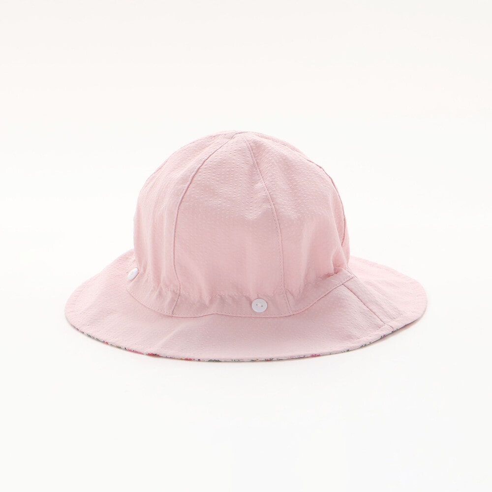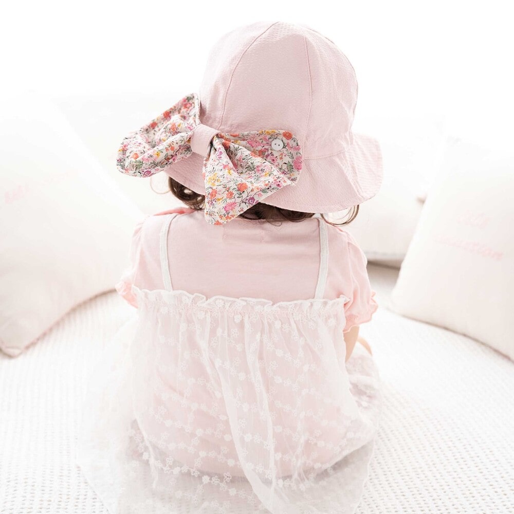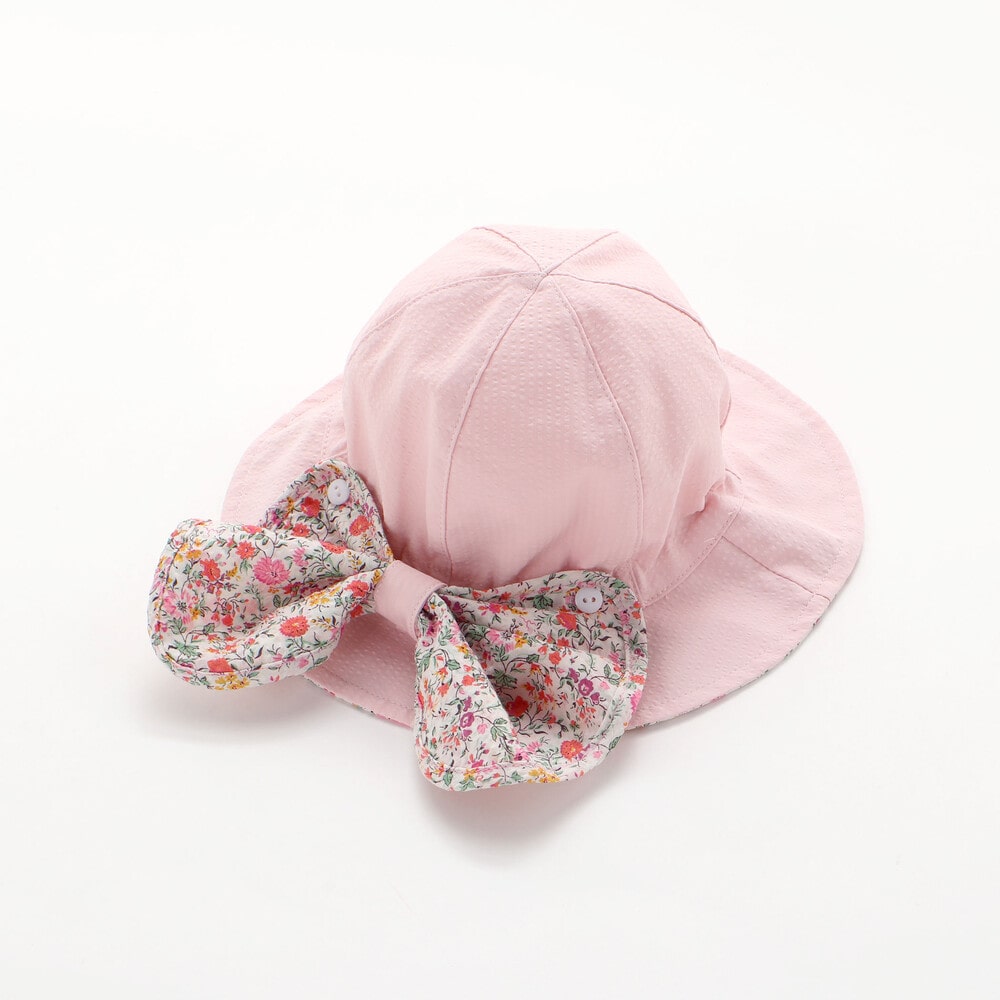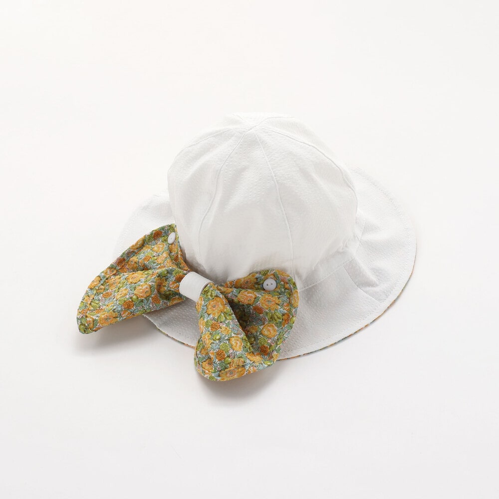 ハット後ろ側に配した、大きな可愛いリボンはボタンで取り外し可能で、真ん中のホックを外してリボンを広げてると首元が隠れる日よけにもなります。