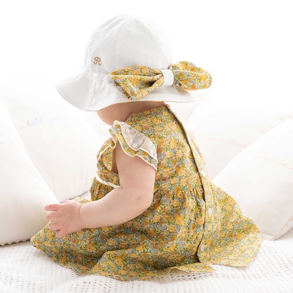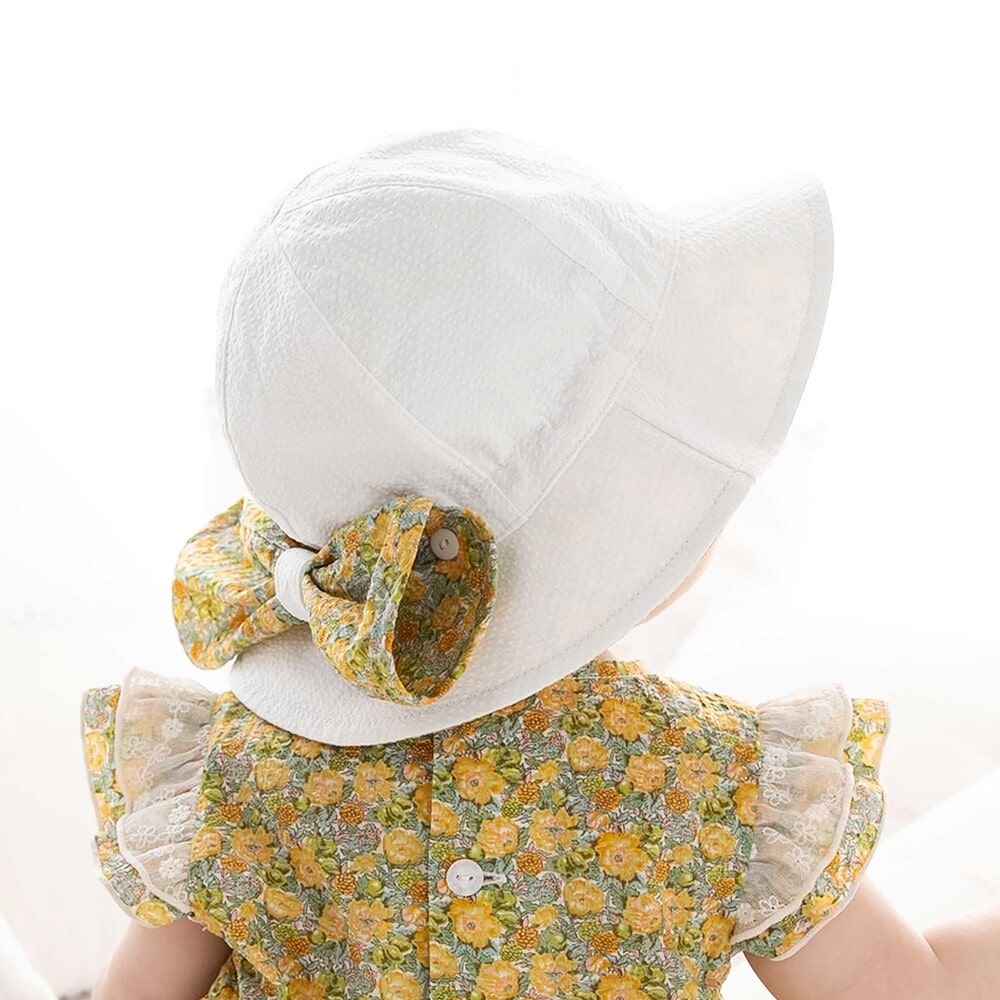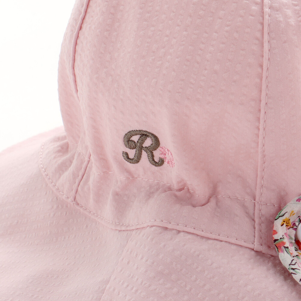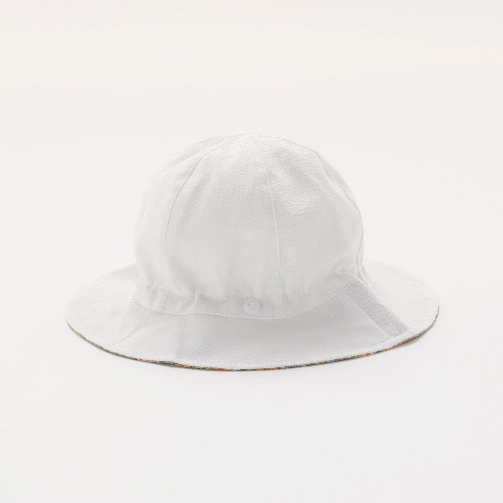 ハット後ろ側に配した、大きな可愛いリボンはボタンで取り外し可能で、真ん中のホックを外してリボンを広げてると首元が隠れる日よけにもなります。