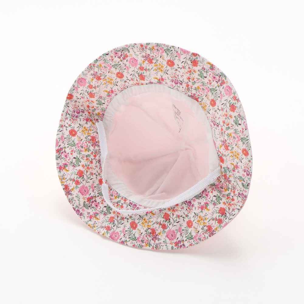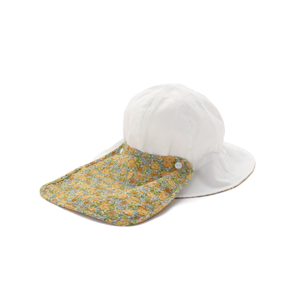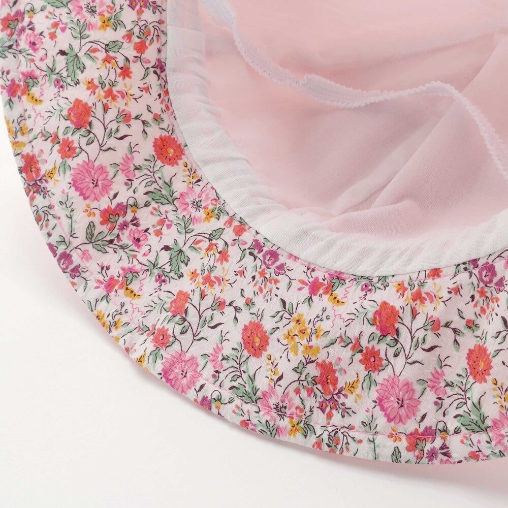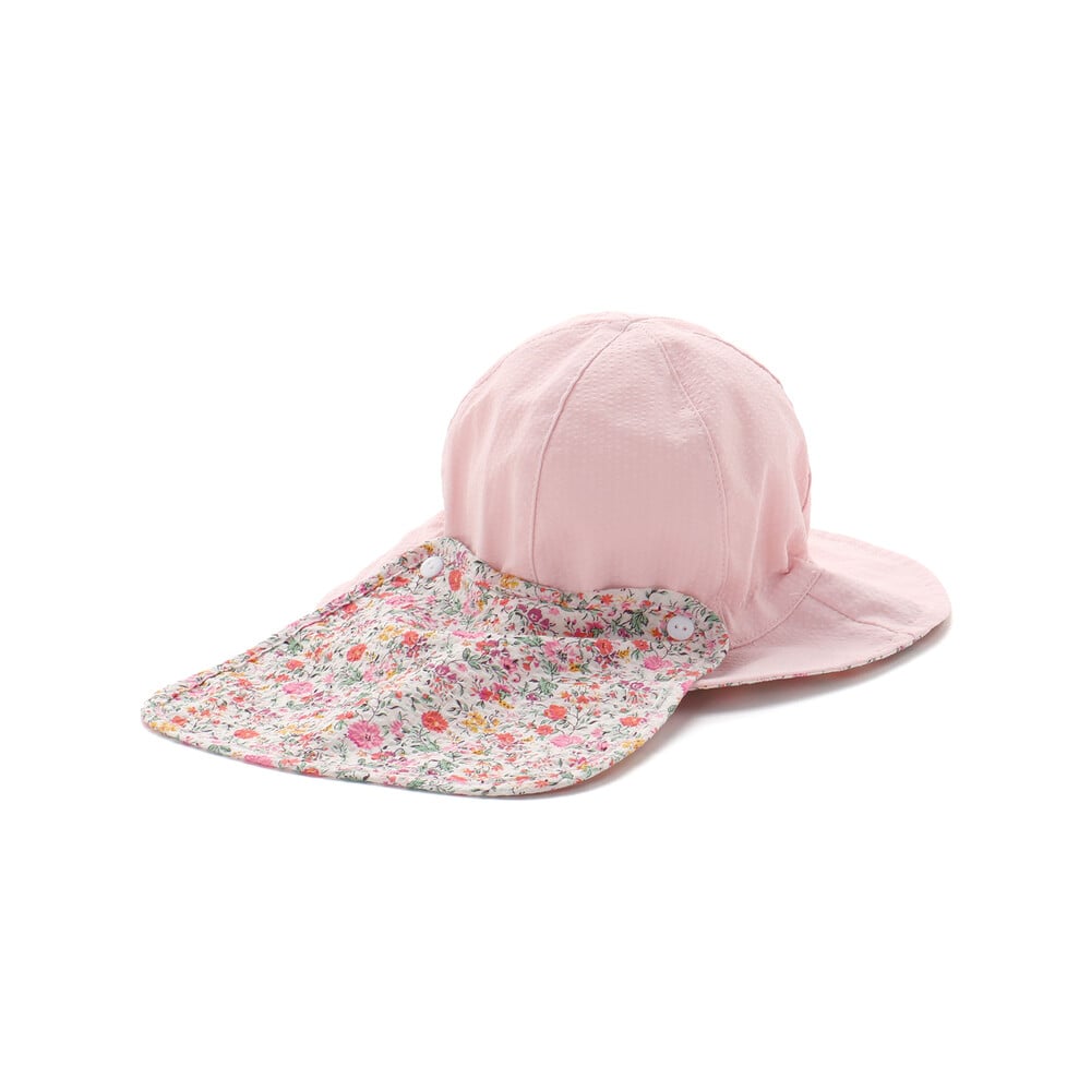 リバティプリントの可愛い花柄を部分使いした日よけ付きの女の子用ハットです。